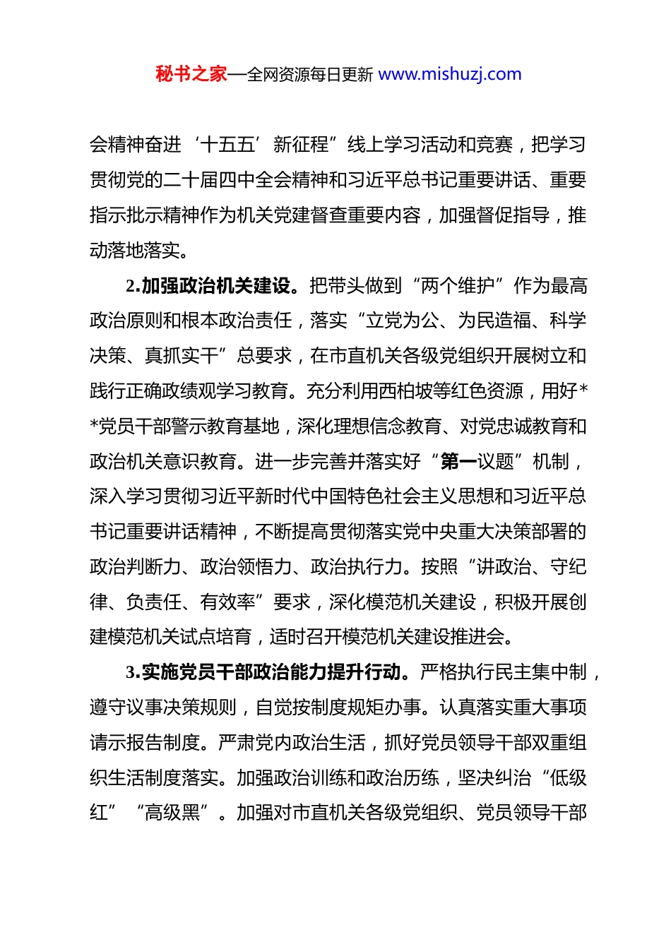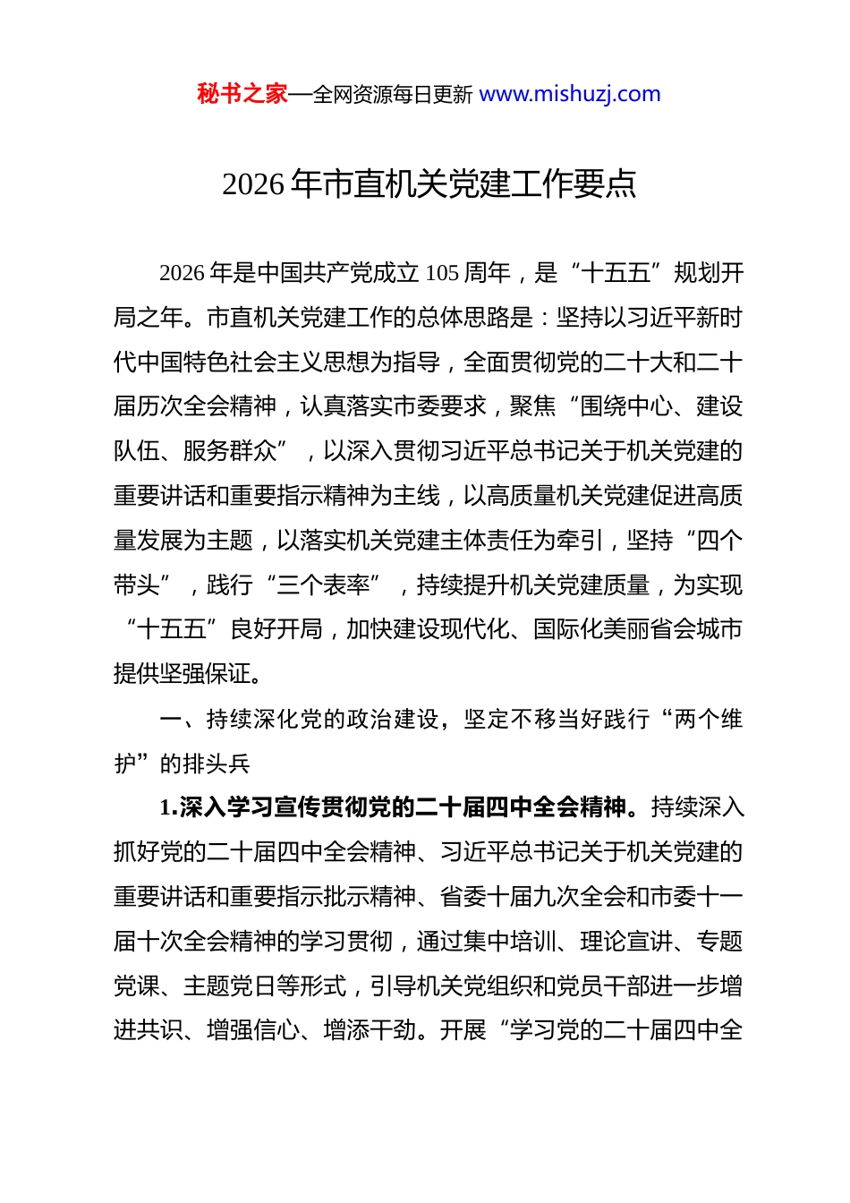 秘书之家—全网资源每日更新 www.mishuzj.com2026 年市直机关党建工作要点 2026 年是中国共产党成立 105 周年,是“十五五”规划开局之年。市直机关党建工作的总体思路是:坚持以习近平新时代中国特色社会主义思想为指导,全面贯彻党的二十大和二十届历次全会精神,认真落实市委要求,聚焦“围绕中心、建设队伍、服务群众”,以深入贯彻习近平总书记关于机关党建的重要讲话和重要指示精神为主线,以高质量机关党建促进高质量发展为主题,以落实机关党建主体责任为牵引,坚持“四个带头”,践行“三个表率”,持续提升机关党建质量,为实现“十五五”良好开局,加快建设现代化、国际化美丽省会城市提供坚强保证。一、持续深化党的政治建设,坚定不移当好践行“两个维护”的排头兵1.深入学习宣传贯彻党的二十届四中全会精神。持续深入抓好党的二十届四中全会精神、习近平总书记关于机关党建的重要讲话和重要指示批示精神、省委十届九次全会和市委十一届十次全会精神的学习贯彻,通过集中培训、理论宣讲、专题党课、主题党日等形式,引导机关党组织和党员干部进一步增进共识、增强信心、增添干劲。开展“学习党的二十届四中全秘书之家—全网资源每日更新 www.mishuzj.com会精神奋进‘十五五’新征程”线上学习活动和竞赛,把学习贯彻党的二十届四中全会精神和习近平总书记重要讲话、重要指示批示精神作为机关党建督查重要内容,加强督促指导,推动落地落实。2.加强政治机关建设。把带头做到“两个维护”作为最高政治原则和根本政治责任,落实“立党为公、为民造福、科学决策、真抓实干”总要求,在市直机关各级党组织开展树立和践行正确政绩观学习教育。充分利用西柏坡等红色资源,用好**党员干部警示教育基地,深化理想信念教育、对党忠诚教育和政治机关意识教育。进一步完善并落实好“第一议题”机制,深入学习贯彻习近平新时代中国特色社会主义思想和习近平总书记重要讲话精神,不断提高贯彻落实党中央重大决策部署的政治判断力、政治领悟力、政治执行力。按照“讲政治、守纪律、负责任、有效率”要求,深化模范机关建设,积极开展创建模范机关试点培育,适时召开模范机关建设推进会。3.实施党员干部政治能力提升行动。严格执行民主集中制,遵守议事决策规则,自觉按制度规矩办事。认真落实重大事项请示报告制度。严肃党内政治生活,抓好党员领导干部双重组织生活制度落实。加强政治训练和政治历练,坚决纠治“低级红”“高级黑”。加强对市直机关各级党组织、党员领导干部秘书之家—全网资源每日更新 www.mishuzj.com贯彻落实中央八项规定及其实施细则精神,遵守政治纪律和政治规矩,以及落实机关党建重点工作、重要制度情况的督导检查。二、持续深化理论武装,在坚持不懈学懂弄通做实上走在前、作示范4.持续加强党的创新理论武装。坚持以习近平新时代中国特色社会主义思想凝心铸魂,不断在深化内化转化上下功夫。认真落实《中国共产党党委(党组)理论学习中心组学习规则》,深化列席旁听工作机制,落实“一学一报”制度,发挥“关键少数”领学促学作用。适时组织理论学习中心组学习秘书和理论骨干培训。持续办好“石直党建大讲堂”,邀请高层次专家学者、各行业骨干精英授课辅导,打造高水平理论学习平台。建强基层理论宣讲员队伍,开展理论宣讲进机关活动,推进党的创新理论在市直机关落地生根。5.严格落实意识形态工作责任制。深入学习贯彻习近平总书记关于意识形态工作的重要论述。把机关基层党组织落实意识形态工作责任制作为党组织书记抓党建工作述职评议重点内容,加强督查指导,层层压实责任。落实主管主办责任,加强对本单位所属刊物、网站、“两微一端”等意识形态阵地的建设和管理。用好党员网络文明志愿者队伍,积极参与网上正能秘书之家—全网资源每日更新 www.mishuzj.com量内容建设。落实《中国共产党思想政治工作条例》,用好谈心谈话、榜样示范、关怀服务等方式,增强机关思想政治工作亲和力、感染力。组织开展思想政治工作课题调研和优秀案例推荐工作。做好市直机关政工专业职务评定工作。6.推进机关精神文明建设走深走实。把机关精神文明建设深度融...