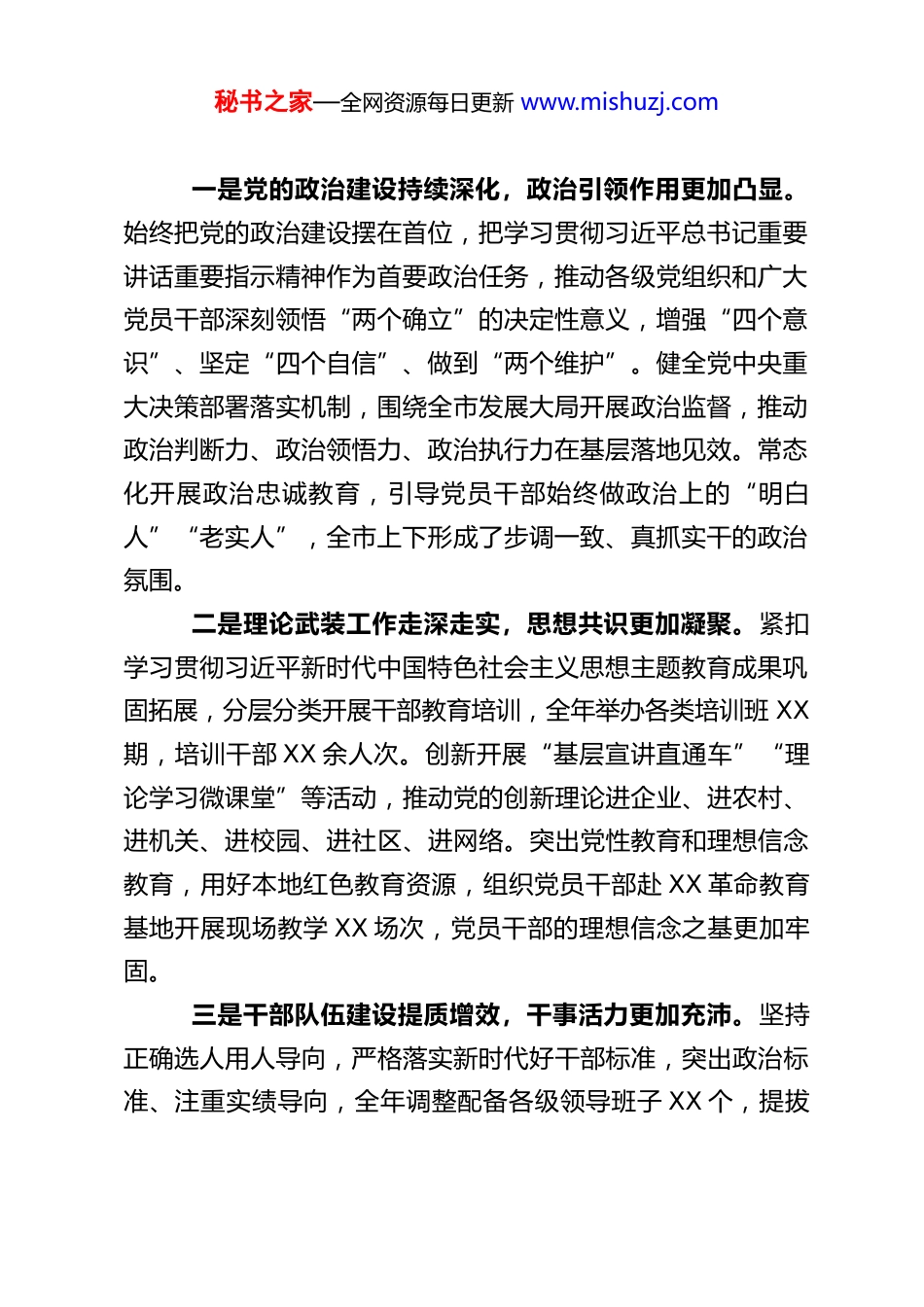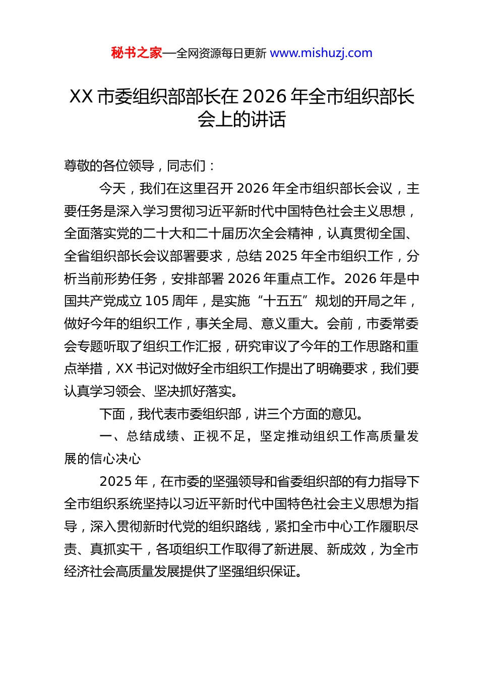 秘书之家—全网资源每日更新 www.mishuzj.comXX 市委组织部部长在 2026 年全市组织部长会上的讲话尊敬的各位领导,同志们:今天,我们在这里召开 2026 年全市组织部长会议,主要任务是深入学习贯彻习近平新时代中国特色社会主义思想,全面落实党的二十大和二十届历次全会精神,认真贯彻全国、全省组织部长会议部署要求,总结 2025 年全市组织工作,分析当前形势任务,安排部署 2026 年重点工作。2026 年是中国共产党成立 105 周年,是实施“十五五”规划的开局之年,做好今年的组织工作,事关全局、意义重大。会前,市委常委会专题听取了组织工作汇报,研究审议了今年的工作思路和重点举措,XX 书记对做好全市组织工作提出了明确要求,我们要认真学习领会、坚决抓好落实。下面,我代表市委组织部,讲三个方面的意见。一、总结成绩、正视不足,坚定推动组织工作高质量发展的信心决心2025 年,在市委的坚强领导和省委组织部的有力指导下全市组织系统坚持以习近平新时代中国特色社会主义思想为指导,深入贯彻新时代党的组织路线,紧扣全市中心工作履职尽责、真抓实干,各项组织工作取得了新进展、新成效,为全市经济社会高质量发展提供了坚强组织保证。秘书之家—全网资源每日更新 www.mishuzj.com一是党的政治建设持续深化,政治引领作用更加凸显。始终把党的政治建设摆在首位,把学习贯彻习近平总书记重要讲话重要指示精神作为首要政治任务,推动各级党组织和广大党员干部深刻领悟“两个确立”的决定性意义,增强“四个意识”、坚定“四个自信”、做到“两个维护”。健全党中央重大决策部署落实机制,围绕全市发展大局开展政治监督,推动政治判断力、政治领悟力、政治执行力在基层落地见效。常态化开展政治忠诚教育,引导党员干部始终做政治上的“明白人”“老实人”,全市上下形成了步调一致、真抓实干的政治氛围。二是理论武装工作走深走实,思想共识更加凝聚。紧扣学习贯彻习近平新时代中国特色社会主义思想主题教育成果巩固拓展,分层分类开展干部教育培训,全年举办各类培训班 XX期,培训干部 XX 余人次。创新开展“基层宣讲直通车”“理论学习微课堂”等活动,推动党的创新理论进企业、进农村、进机关、进校园、进社区、进网络。突出党性教育和理想信念教育,用好本地红色教育资源,组织党员干部赴 XX 革命教育基地开展现场教学 XX 场次,党员干部的理想信念之基更加牢固。三是干部队伍建设提质增效,干事活力更加充沛。坚持正确选人用人导向,严格落实新时代好干部标准,突出政治标准、注重实绩导向,全年调整配备各级领导班子 XX 个,提拔秘书之家—全网资源每日更新 www.mishuzj.com使用优秀干部 XX 名,干部队伍结构持续优化。健全干部考核评价体系,完善差异化考核机制,将考核结果与干部选拔任用、评优评先、问责追责紧密挂钩,有效激发了干部干事创业的积极性。加强干部实践锻炼,选派 XX 名干部到乡村振兴、项目建设、信访维稳等一线历练,干部队伍的实战能力显著提升。四是基层党建基础不断夯实,治理效能更加彰显。深入推进“基层党建提质增效行动”,持续抓基层、强基础、固根本。扎实做好村(社区)“两委”换届后续工作,开展新任班子成员专题培训 XX 期,基层党组织带头人队伍能力全面提升。深化党建引领基层治理,健全“街道吹哨、部门报到”“社区吹哨、党员报到”机制,推动治理资源向基层下沉,解决群众急难愁盼问题 XX 余件。持续加强新兴领域党建工作,新组建两新组织党组织 XX 个,党建覆盖面和组织力不断提升。传统领域党建提质升级,机关、国企、学校、医院等党组织党建与业务融合更加深入,战斗堡垒作用充分发挥。五是人才工作体系逐步完善,人才支撑更加有力。深入实施人才强市战略,出台《XX 市关于进一步加强新时代人才工作的若干措施》,构建了更加完善的人才政策体系。全年引进高层次人才 XX 名、青年骨干人才 XX 名、技能型人才 XX 名,人才队伍规模和质量同步提升。搭建人才发展平台,新建院士工作站 XX 个、企业研发中心 XX 个、乡村振兴人才驿站 XX 个,人才创新创业载体更加丰富。优化人...