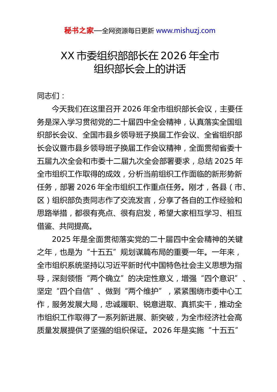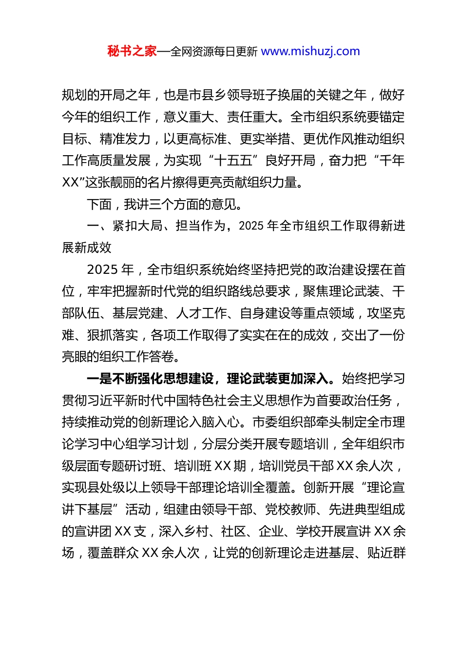 秘书之家—全网资源每日更新 www.mishuzj.comXX 市委组织部部长在 2026 年全市组织部长会上的讲话同志们:今天我们在这里召开 2026 年全市组织部长会议,主要任务是深入学习贯彻党的二十届四中全会精神,认真落实全国组织部长会议、全国市县乡领导班子换届工作会议、全省组织部长会议暨市县乡领导班子换届工作会议精神,全面贯彻省委十五届九次全会和市委十二届九次全会部署要求,总结 2025 年全市组织工作取得的成效,分析当前组织工作面临的新形势新任务,部署 2026 年全市组织工作重点任务。刚才,各县(市、区)组织部负责同志作了交流发言,分享了各自的工作经验和思路举措,都很有亮点、很有启发,希望大家相互学习、相互借鉴、共同提高。2025 年是全面贯彻落实党的二十届四中全会精神的关键之年,也是为“十五五”规划谋篇布局的重要一年。一年来,全市组织系统坚持以习近平新时代中国特色社会主义思想为指导,深刻领悟“两个确立”的决定性意义,增强“四个意识”、坚定“四个自信”、做到“两个维护”,紧紧围绕市委中心工作,服务发展大局,忠诚履职、锐意进取、真抓实干,推动全市组织工作取得了一系列新进展、新突破,为全市经济社会高质量发展提供了坚强的组织保证。2026 年是实施“十五五”秘书之家—全网资源每日更新 www.mishuzj.com规划的开局之年,也是市县乡领导班子换届的关键之年,做好今年的组织工作,意义重大、责任重大。全市组织系统要锚定目标、精准发力,以更高标准、更实举措、更优作风推动组织工作高质量发展,为实现“十五五”良好开局,奋力把“千年XX”这张靓丽的名片擦得更亮贡献组织力量。下面,我讲三个方面的意见。一、紧扣大局、担当作为,2025 年全市组织工作取得新进展新成效2025 年,全市组织系统始终坚持把党的政治建设摆在首位,牢牢把握新时代党的组织路线总要求,聚焦理论武装、干部队伍、基层党建、人才工作、自身建设等重点领域,攻坚克难、狠抓落实,各项工作取得了实实在在的成效,交出了一份亮眼的组织工作答卷。一是不断强化思想建设,理论武装更加深入。始终把学习贯彻习近平新时代中国特色社会主义思想作为首要政治任务,持续推动党的创新理论入脑入心。市委组织部牵头制定全市理论学习中心组学习计划,分层分类开展专题培训,全年组织市级层面专题研讨班、培训班 XX 期,培训党员干部 XX 余人次,实现县处级以上领导干部理论培训全覆盖。创新开展“理论宣讲下基层”活动,组建由领导干部、党校教师、先进典型组成的宣讲团 XX 支,深入乡村、社区、企业、学校开展宣讲 XX 余场,覆盖群众 XX 余人次,让党的创新理论走进基层、贴近群秘书之家—全网资源每日更新 www.mishuzj.com众。建立健全常态化学习机制,推动各级党组织把习近平新时代中国特色社会主义思想纳入“三会一课”、主题党日必学内容,引导广大党员干部读原著、学原文、悟原理,不断增进对党的创新理论的政治认同、思想认同、理论认同、情感认同,切实把学习成果转化为干事创业的实际行动。二是树牢选人用人导向,干部队伍更加担当。严格落实新时代好干部标准,坚持党管干部原则,树立“重品德、重才干、重担当、重实绩、重公认”的选人用人导向,着力打造忠诚干净担当的高素质干部队伍。突出政治标准,把政治素质考察贯穿干部选拔任用全过程,通过谈心谈话、实地调研、查阅资料、专项测评等多种方式,全方位、多角度、深层次考察干部的政治忠诚、政治定力、政治担当、政治能力、政治自律,坚决把政治不过硬的干部挡在门外。围绕全市重点工作、重大项目、重要任务,精准选配干部,优化班子结构,全年调整配备县处级领导班子 XX 个、干部 XX 人次,班子的年龄结构、专业结构、知识结构进一步优化。加强干部实践锻炼,选派 XX 名优秀干部到乡村振兴一线、重点项目现场、信访维稳前沿挂职锻炼、蹲点服务,让干部在基层一线经风雨、见世面、壮筋骨、长才干。健全干部担当作为激励机制,对在重点工作中表现突出的XX 名干部予以表彰奖励、提拔重用,鲜明树立“有为者有位、能干者能上”的导向,广大干部干事创业的积极性、主动性、创...