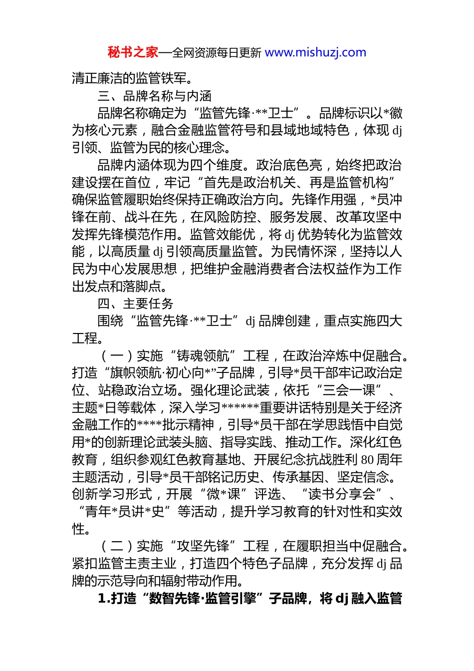 秘书之家—全网资源每日更新 www.mishuzj.com县金融监管支局 2026 年 dj 品牌创建工作方案为深入贯彻落实*的二十大及二十届历次全会精神,全面加强新时代基层*组织建设,推动 dj 工作与金融监管业务深度融合,根据金融监管总局及上级*委关于加强基层 dj 品牌建设的部署要求,结合本县金融监管工作实际,特制定本方案。一、指导思想坚持以**************思想为指导,深入贯彻******关于金融工作和*的建设重要论述精神,牢牢把握金融工作的政治性、人民性,紧紧围绕服务实体经济、防控金融风险、深化金融改革三大任务,按照“大统一、小特色”理念,找准 dj 品牌与监管工作的结合点和着力点,培育打造主题突出、特色鲜明、内涵丰富、成效显著的 dj 品牌,以高质量 dj 引领高质量金融监管,为县域经济金融高质量发展提供坚强政治保证和组织保障。二、工作目标以打造“监管先锋·**卫士”dj 品牌为主线,通过系统化培育、规范化建设、品牌化管理,实现以下目标。政治引领更加有力,*员干部深刻践行金融工作政治性、人民性,*支部凝聚力和战斗力持续增强。融合机制更加完善,dj 与监管业务融合路径清晰、机制健全,形成“一支部一特色一*员一旗帜”工作格局。服务效能更加显著,金融支持县域经济发展成效明显,普惠金融服务覆盖率、可得性、满意度显著提升。监管能力更加过硬,风险监测预警精准性有效性明显提升,守住不发生系统性金融风险底线。队伍素质更加优良,建设一支政治坚定、业务精良、作风过硬秘书之家—全网资源每日更新 www.mishuzj.com清正廉洁的监管铁军。三、品牌名称与内涵品牌名称确定为“监管先锋·**卫士”。品牌标识以*徽为核心元素,融合金融监管符号和县域地域特色,体现 dj引领、监管为民的核心理念。品牌内涵体现为四个维度。政治底色亮,始终把政治建设摆在首位,牢记“首先是政治机关、再是监管机构”确保监管履职始终保持正确政治方向。先锋作用强,*员冲锋在前、战斗在先,在风险防控、服务发展、改革攻坚中发挥先锋模范作用。监管效能优,将 dj 优势转化为监管效能,以高质量 dj 引领高质量监管。为民情怀深,坚持以人民为中心发展思想,把维护金融消费者合法权益作为工作出发点和落脚点。四、主要任务围绕“监管先锋·**卫士”dj 品牌创建,重点实施四大工程。(一)实施“铸魂领航”工程,在政治淬炼中促融合。打造“旗帜领航·初心向*”子品牌,引导*员干部牢记政治定位、站稳政治立场。强化理论武装,依托“三会一课”、主题*日等载体,深入学习******重要讲话特别是关于经济金融工作的****批示精神,引导*员干部在学思践悟中自觉用*的创新理论武装头脑、指导实践、推动工作。深化红色教育,组织参观红色教育基地、开展纪念抗战胜利 80 周年主题活动,引导*员干部铭记历史、传承基因、坚定信念。创新学习形式,开展“微*课”评选、“读书分享会”、“青年*员讲*史”等活动,提升学习教育的针对性和实效性。(二)实施“攻坚先锋”工程,在履职担当中促融合。紧扣监管主责主业,打造四个特色子品牌,充分发挥 dj 品牌的示范导向和辐射带动作用。1.打造“数智先锋·监管引擎”子品牌,将 dj 融入监管秘书之家—全网资源每日更新 www.mishuzj.com数智化创新中。组建*员数字攻坚先锋队,深化对监管科技的研究应用,自主研究设置机构类风险预警指标和行业类风险监测指标,提升风险监测预警的精准性、有效性。探索运用大数据、人工智能等技术手段,推动监管工作从“人防”向“技防”转变,实现风险早识别、早预警、早处置。2.打造“风险卫士·安全屏障”子品牌,将 dj 融入守牢金融风险底线中。将中小银行改革化险作为政治任务,作为检验 dj 成效的“试金石”。引领*员干部冲锋在攻坚前沿一线,全力推动中小金融机构化险稳中有进、农信改革破冰突围、村镇银行靶向排雷。建立健全风险监测预警机制应急处置机制、责任追究机制,确保风险防得住、控得好化得了。3.打造“惠企先锋·发展助力”子品牌,将 dj 融入服务地方经济发展中。结合县域乡村振兴战略和小微企业发展需求,组建金融服务*员先锋队,深入开展“dj+金融”...