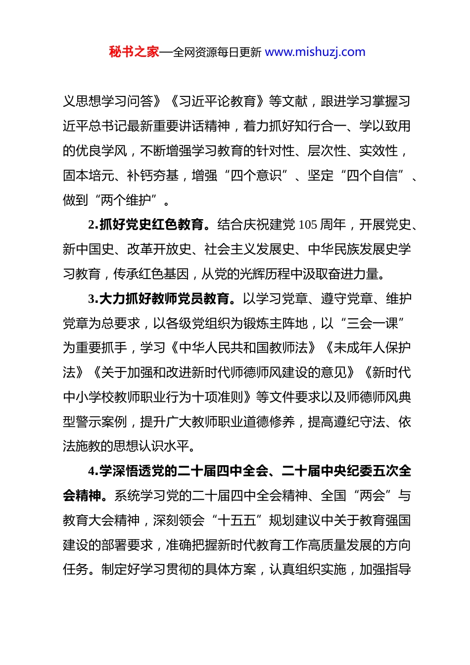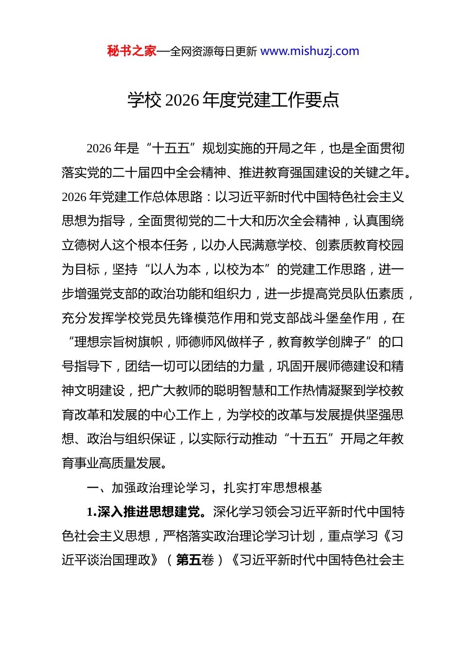 秘书之家—全网资源每日更新 www.mishuzj.com学校 2026 年度党建工作要点 2026 年是“十五五”规划实施的开局之年,也是全面贯彻落实党的二十届四中全会精神、推进教育强国建设的关键之年。2026 年党建工作总体思路:以习近平新时代中国特色社会主义思想为指导,全面贯彻党的二十大和历次全会精神,认真围绕立德树人这个根本任务,以办人民满意学校、创素质教育校园为目标,坚持“以人为本,以校为本”的党建工作思路,进一步增强党支部的政治功能和组织力,进一步提高党员队伍素质,充分发挥学校党员先锋模范作用和党支部战斗堡垒作用,在“理想宗旨树旗帜,师德师风做样子,教育教学创牌子”的口号指导下,团结一切可以团结的力量,巩固开展师德建设和精神文明建设,把广大教师的聪明智慧和工作热情凝聚到学校教育改革和发展的中心工作上,为学校的改革与发展提供坚强思想、政治与组织保证,以实际行动推动“十五五”开局之年教育事业高质量发展。一、加强政治理论学习,扎实打牢思想根基1.深入推进思想建党。深化学习领会习近平新时代中国特色社会主义思想,严格落实政治理论学习计划,重点学习《习近平谈治国理政》(第五卷)《习近平新时代中国特色社会主秘书之家—全网资源每日更新 www.mishuzj.com义思想学习问答》《习近平论教育》等文献,跟进学习掌握习近平总书记最新重要讲话精神,着力抓好知行合一、学以致用的优良学风,不断增强学习教育的针对性、层次性、实效性,固本培元、补钙夯基,增强“四个意识”、坚定“四个自信”、做到“两个维护”。2.抓好党史红色教育。结合庆祝建党 105 周年,开展党史、新中国史、改革开放史、社会主义发展史、中华民族发展史学习教育,传承红色基因,从党的光辉历程中汲取奋进力量。3.大力抓好教师党员教育。以学习党章、遵守党章、维护党章为总要求,以各级党组织为锻炼主阵地,以“三会一课”为重要抓手,学习《中华人民共和国教师法》《未成年人保护法》《关于加强和改进新时代师德师风建设的意见》《新时代中小学校教师职业行为十项准则》等文件要求以及师德师风典型警示案例,提升广大教师职业道德修养,提高遵纪守法、依法施教的思想认识水平。4.学深悟透党的二十届四中全会、二十届中央纪委五次全会精神。系统学习党的二十届四中全会精神、全国“两会”与教育大会精神,深刻领会“十五五”规划建议中关于教育强国建设的部署要求,准确把握新时代教育工作高质量发展的方向任务。制定好学习贯彻的具体方案,认真组织实施,加强指导秘书之家—全网资源每日更新 www.mishuzj.com督促。督促基层党支部书记要认真履责,扎实抓好党支部学习贯彻工作。指导机关工会、共青团、家委会等要发挥自身优势,开展形式多样的学习教育活动。二、严肃党内政治生活,强化党的组织建设1.坚持党中央权威和集中统一领导。加强对贯彻落实“两个维护”情况的督促检查,推动《关于加强和维护党中央集中统一领导的若干规定》和《重大事项请示报告条例》贯彻落实导。完善推动重大决策落实机制,常态化开展贯彻落实情况“回头看”,不折不扣贯彻落实各级决策部署。2.健全完善党内制度。深化党要管党意识,建立健全党员教育管理的长效工作机制,坚持“三会一课”制度、党内组织生活制度。认真实施党员年度目标管理工作,要求党员结合自己工作实际,把制定目标与学校教育教学工作有机结合,促进党员目标责任制的落实。强化岗位职责,增强工作责任感。做好民主评议党员工作,按时交纳党费,增强党员的组织观念。3.创新开展基层党组织建设。在教学任务繁重的年级组和部门,逐步完善通过“网络+”“大数据+”等方式,探索创新基层党建工作信息化、网络化、智能化,尝试运用信息手段规范党建工作的具体方法,推进党建工作与时俱进。4.严格落实工作制度。把落实党内制度法规作为抓党建基秘书之家—全网资源每日更新 www.mishuzj.com础性工作,纳入教学、行管业务性工作一并要求、一并落实。履行“一岗双责”制度,树立抓业务抓党建、管人事管党员、严法纪严党纪的导向,确保党建工作在正规有序的轨道下高效运行。三、强化党员队伍建设,切实发挥示范作...