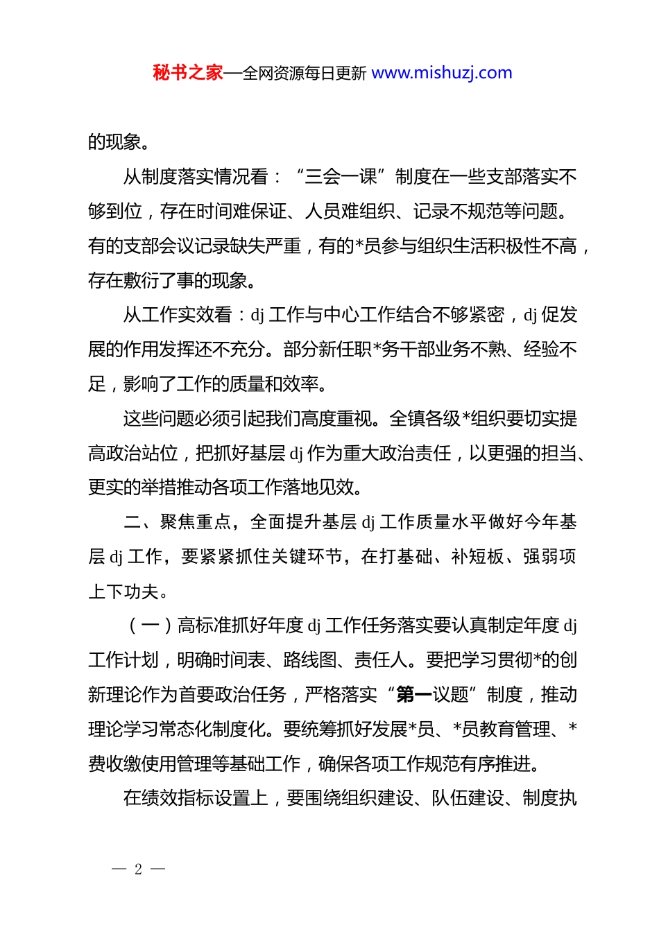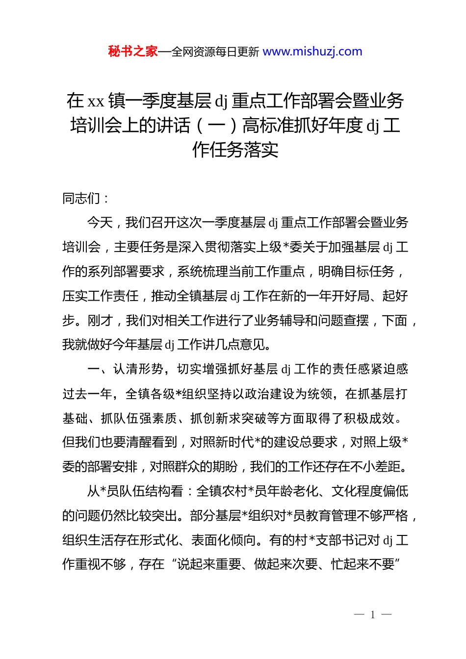 秘书之家—全网资源每日更新 www.mishuzj.com在 xx 镇一季度基层 dj 重点工作部署会暨业务培训会上的讲话(一)高标准抓好年度 dj 工作任务落实同志们:今天,我们召开这次一季度基层 dj 重点工作部署会暨业务培训会,主要任务是深入贯彻落实上级*委关于加强基层 dj 工作的系列部署要求,系统梳理当前工作重点,明确目标任务,压实工作责任,推动全镇基层 dj 工作在新的一年开好局、起好步。刚才,我们对相关工作进行了业务辅导和问题查摆,下面,我就做好今年基层 dj 工作讲几点意见。一、认清形势,切实增强抓好基层 dj 工作的责任感紧迫感过去一年,全镇各级*组织坚持以政治建设为统领,在抓基层打基础、抓队伍强素质、抓创新求突破等方面取得了积极成效。但我们也要清醒看到,对照新时代*的建设总要求,对照上级*委的部署安排,对照群众的期盼,我们的工作还存在不小差距。从*员队伍结构看:全镇农村*员年龄老化、文化程度偏低的问题仍然比较突出。部分基层*组织对*员教育管理不够严格,组织生活存在形式化、表面化倾向。有的村*支部书记对 dj 工作重视不够,存在“说起来重要、做起来次要、忙起来不要”— 1 —秘书之家—全网资源每日更新 www.mishuzj.com的现象。从制度落实情况看:“三会一课”制度在一些支部落实不够到位,存在时间难保证、人员难组织、记录不规范等问题。有的支部会议记录缺失严重,有的*员参与组织生活积极性不高,存在敷衍了事的现象。从工作实效看:dj 工作与中心工作结合不够紧密,dj 促发展的作用发挥还不充分。部分新任职*务干部业务不熟、经验不足,影响了工作的质量和效率。这些问题必须引起我们高度重视。全镇各级*组织要切实提高政治站位,把抓好基层 dj 作为重大政治责任,以更强的担当、更实的举措推动各项工作落地见效。二、聚焦重点,全面提升基层 dj 工作质量水平做好今年基层 dj 工作,要紧紧抓住关键环节,在打基础、补短板、强弱项上下功夫。(一)高标准抓好年度 dj 工作任务落实要认真制定年度 dj工作计划,明确时间表、路线图、责任人。要把学习贯彻*的创新理论作为首要政治任务,严格落实“第一议题”制度,推动理论学习常态化制度化。要统筹抓好发展*员、*员教育管理、*费收缴使用管理等基础工作,确保各项工作规范有序推进。在绩效指标设置上,要围绕组织建设、队伍建设、制度执— 2 —秘书之家—全网资源每日更新 www.mishuzj.com行、作用发挥等方面细化量化考核标准。各支部要按照“工作有目标、过程有记录、结果有考核”的要求,建立完善工作台账,做到年初有计划、年中有检查、年底有总结。(二)高质量规范组织生活会和民主评议*员工作组织生活会是*内政治生活的重要内容,是加强*员教育管理监督的有效途径。要严格按照规定程序和要求召开组织生活会,认真开展批评与自我批评,确保会议质量。会前要深入开展谈心谈话,广泛征求意见建议;会上要直面问题、红脸出汗,真正达到统一思想、增进团结、推动工作的目的;会后要抓好问题整改,建立整改台账,实行销号管理。民主评议*员要坚持实事求是、客观公正,对表现优秀的*员要予以表扬,对不合格*员要依规稳妥处置。通过严格规范组织生活,不断增强*组织的凝聚力和战斗力。(三)高起点推进基层*支部换届工作今年是基层*支部换届的重要年份,要提前谋划、精心组织,确保换届工作平稳有序进行。要严格执行换届程序,把好人选政治关、品行关、能力关、作风关、廉洁关,真正把那些政治坚定、能力突出、群众公认的优秀*员选拔到支部班子中来。要严肃换届纪律,坚决防止和查处拉票贿选等违纪违法行为,营造风清气正的换届环境。换届后要及时做好新老班子交— 3 —秘书之家—全网资源每日更新 www.mishuzj.com接工作,确保工作不断档、责任不缺位。要针对换届后部分新任干部业务不熟的问题,加强业务培训和实践锻炼,帮助他们尽快进入角色、胜任岗位。(四)高水平落实“三会一课”制度“三会一课”制度是*内政治生活的基本制度,是加强*员教育管理的重要载体。要着力解决当前存在的思想认识不足、内容形式单一、制度执行不力等问题。在思想...