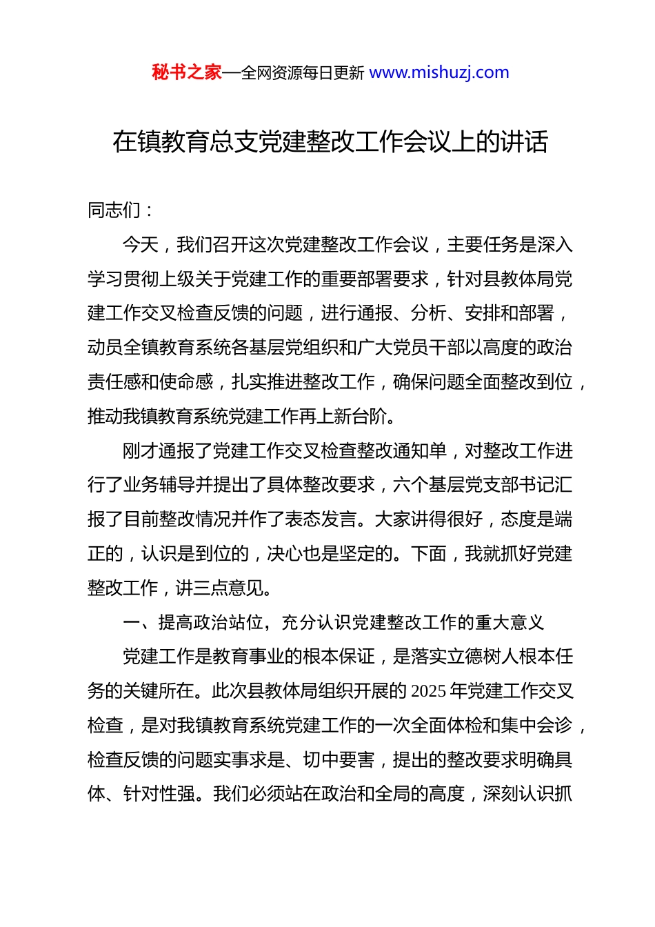 秘书之家—全网资源每日更新 www.mishuzj.com在镇教育总支党建整改工作会议上的讲话 同志们:今天,我们召开这次党建整改工作会议,主要任务是深入学习贯彻上级关于党建工作的重要部署要求,针对县教体局党建工作交叉检查反馈的问题,进行通报、分析、安排和部署,动员全镇教育系统各基层党组织和广大党员干部以高度的政治责任感和使命感,扎实推进整改工作,确保问题全面整改到位,推动我镇教育系统党建工作再上新台阶。刚才通报了党建工作交叉检查整改通知单,对整改工作进行了业务辅导并提出了具体整改要求,六个基层党支部书记汇报了目前整改情况并作了表态发言。大家讲得很好,态度是端正的,认识是到位的,决心也是坚定的。下面,我就抓好党建整改工作,讲三点意见。一、提高政治站位,充分认识党建整改工作的重大意义党建工作是教育事业的根本保证,是落实立德树人根本任务的关键所在。此次县教体局组织开展的 2025 年党建工作交叉检查,是对我镇教育系统党建工作的一次全面体检和集中会诊,检查反馈的问题实事求是、切中要害,提出的整改要求明确具体、针对性强。我们必须站在政治和全局的高度,深刻认识抓秘书之家—全网资源每日更新 www.mishuzj.com好整改工作的重要性和紧迫性。第一,抓好党建整改是践行“两个维护”的具体行动。坚持党对教育工作的全面领导,是教育工作的根本原则。党建工作抓得好不好,直接关系到党的教育方针能否得到全面贯彻,关系到立德树人根本任务能否有效落实。对于交叉检查反馈的问题,我们不仅要看作工作层面的问题,更要从政治层面来审视,深刻反思我们在贯彻落实上级决策部署方面存在的差距和不足,以整改的实际成效体现对党的忠诚、对事业的责任。第二,抓好党建整改是推动教育事业高质量发展的迫切需要。当前,教育改革发展正处于关键时期,人民群众对优质教育资源的需求日益增长,对教师队伍素质、教育教学质量、学校管理水平提出了更高要求。党建工作做实了就是生产力,做强了就是竞争力,做细了就是凝聚力。我们必须通过抓好党建整改,充分发挥基层党组织的战斗堡垒作用和党员的先锋模范作用,以高质量党建引领教育高质量发展,办好人民满意的教育。第三,抓好党建整改是落实全面从严治党主体责任的重要举措。全面从严治党永远在路上,党的自我革命永远在路上。此次交叉检查发现的问题,暴露出我们在管党治党方面还存在薄弱环节,一些基层党组织党建工作责任制落实不够到位,党秘书之家—全网资源每日更新 www.mishuzj.com内组织生活不够规范,党员教育管理不够严格。这些问题如果得不到有效解决,就会削弱基层党组织的凝聚力和战斗力,影响教育事业的健康发展。我们必须以整改为契机,压紧压实管党治党责任,推动全面从严治党向基层延伸、向纵深发展。二、坚持问题导向,以真刀真枪的劲头抓好整改落实整改是检验我们政治担当和工作作风的试金石。各基层党组织要对照整改通知单列出的各类问题,逐条逐项分析研究,制定切实可行的整改措施,以钉钉子精神推动问题整改见底清零。第一,要全面整改,不留死角。此次交叉检查反馈的问题涉及思想建设、组织建设、作风建设、制度建设等多个方面,有共性问题,也有个性问题;有长期积累的历史遗留问题,也有新近出现的苗头性问题。各基层党组织要逐一建立问题清单、任务清单、责任清单,明确整改目标、整改措施、整改时限和责任人,做到一个问题、一套方案、一名责任人、一抓到底。要严格按照时间节点推进整改,实行台账管理、挂图作战,完成一项、销号一项,确保条条有整改、件件有着落、事事有回音。对于能够立即解决的问题,要立行立改、即知即改;对于需要一定时间解决的问题,要制定阶段性目标,分步推进、持续用力;对于涉及体制机制等深层次问题,要深入分析根源,秘书之家—全网资源每日更新 www.mishuzj.com从制度层面研究解决办法。第二,要深入整改,举一反三。整改工作不能就事论事、浅尝辄止,不能满足于“头痛医头、脚痛医脚”。要善于从具体问题中发现普遍规律,从个性问题中寻找共性原因,深挖问题背后的思想根源、制度缺陷和管理漏洞。比如,如果检查发现个别支部“三...