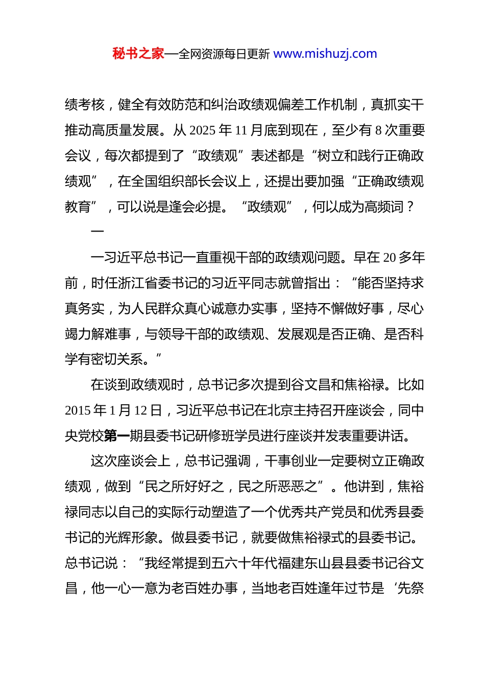 秘书之家—全网资源每日更新 www.mishuzj.com2026 年党课 PPT(带讲稿):求真务实真抓实干树立和践行正确政绩观 求真务实、真抓实干树立和践行正确政绩观2025 年 11 月 28 日中共中央政治局召开会议,讲到“政绩观”,强调要树立和践行正确政绩观,完整准确全面贯彻新发展理念,完善干部考核评价机制,坚持求真务实、真抓实干。12 月 8 日中共中央政治局召开会议,强调要树立和践行正确政绩观,因地制宜做好经济工作,实现高质量、可持续的发展。……从 2025 年 12 月 10 日至 11 日召开的中央经济工作会议、12月 25 日中共中央政治局召开的民主生活会、12 月 29 日至 30 日召开的中央农村工作会议在北京召开,到 2026 年 1 月 8 日的中共中央政治局常务委员会会议、1 月 20 日召开的省部级主要领导干部学习贯彻党的二十届四中全会精神专题研讨班,都强调了“树立和践行正确政绩观”问题。其中 1 月 15 日,全国组织部长会议在京召开。会议强调,要树立和践行正确政绩观,加强正确政绩观教育,改进优化政秘书之家—全网资源每日更新 www.mishuzj.com绩考核,健全有效防范和纠治政绩观偏差工作机制,真抓实干推动高质量发展。从 2025 年 11 月底到现在,至少有 8 次重要会议,每次都提到了“政绩观”表述都是“树立和践行正确政绩观”,在全国组织部长会议上,还提出要加强“正确政绩观教育”,可以说是逢会必提。“政绩观”,何以成为高频词?一一习近平总书记一直重视干部的政绩观问题。早在 20 多年前,时任浙江省委书记的习近平同志就曾指出:“能否坚持求真务实,为人民群众真心诚意办实事,坚持不懈做好事,尽心竭力解难事,与领导干部的政绩观、发展观是否正确、是否科学有密切关系。”在谈到政绩观时,总书记多次提到谷文昌和焦裕禄。比如2015 年 1 月 12 日,习近平总书记在北京主持召开座谈会,同中央党校第一期县委书记研修班学员进行座谈并发表重要讲话。这次座谈会上,总书记强调,干事创业一定要树立正确政绩观,做到“民之所好好之,民之所恶恶之”。他讲到,焦裕禄同志以自己的实际行动塑造了一个优秀共产党员和优秀县委书记的光辉形象。做县委书记,就要做焦裕禄式的县委书记。总书记说:“我经常提到五六十年代福建东山县县委书记谷文昌,他一心一意为老百姓办事,当地老百姓逢年过节是‘先祭秘书之家—全网资源每日更新 www.mishuzj.com谷公,后拜祖宗’。”2024 年 10 月 15 日至 16 日,习近平总书记在福建考察调研。在考察谷文昌纪念馆时指出,各级领导干部要向谷文昌同志学习,树牢正确政绩观,为官一任、造福一方,真抓实干、久久为功,把丰碑立在人民群众心中。学习谷文昌同志,不仅要高山仰止,还要见贤思齐,像他那样做人、为政。上世纪五六十年代,谷文昌目睹东山群众饱受风沙之苦,立下“不治服风沙,就让风沙把我埋掉”的誓言。他带领干部群众历时十余载,种下数万株木麻黄,硬生生把一座风沙肆虐的荒岛打造成生机盎然的绿洲。“不带私心搞革命,一心一意为人民”,谷文昌把这两句话写在自己笔记本上,也写在自己心里。他的政绩,没有立竿见影的光鲜数据,却惠及一代又一代东山百姓,成为真正的“潜绩丰碑”。身为县委书记,焦裕禄在兰考工作的 470 余个日夜里,靠着一辆自行车和一双胶鞋,踏遍了全县 149 个生产大队中的 120多个。无论瓢泼大雨还是风沙漫天,别人往屋里跑,焦裕禄却总是往外冲,即便在病重期间,他也拒绝只看材料听汇报,始终坚守“吃别人嚼过的馍没味道”的实干理念,用脚步丈量民情,用担当扛起使命。谷文昌、焦裕禄为什么屡屡被总书记记取、惦念?原因就秘书之家—全网资源每日更新 www.mishuzj.com在于他们是全心全意为人民服务,是为人民出政绩、以实干出政绩的好干部。政绩观是党员干部干事创业的“总开关”,只有“总开关”把住了,干事创业的方向才能把住。二然而,并不是所有的领导干部都能把住干事创业的“总开关”。比如,这两天,中央层面整治形式主义为基层减负专项工作机制办公室会同中央纪委办公厅通报的 3 起整治形式主义为基层减负典型问...