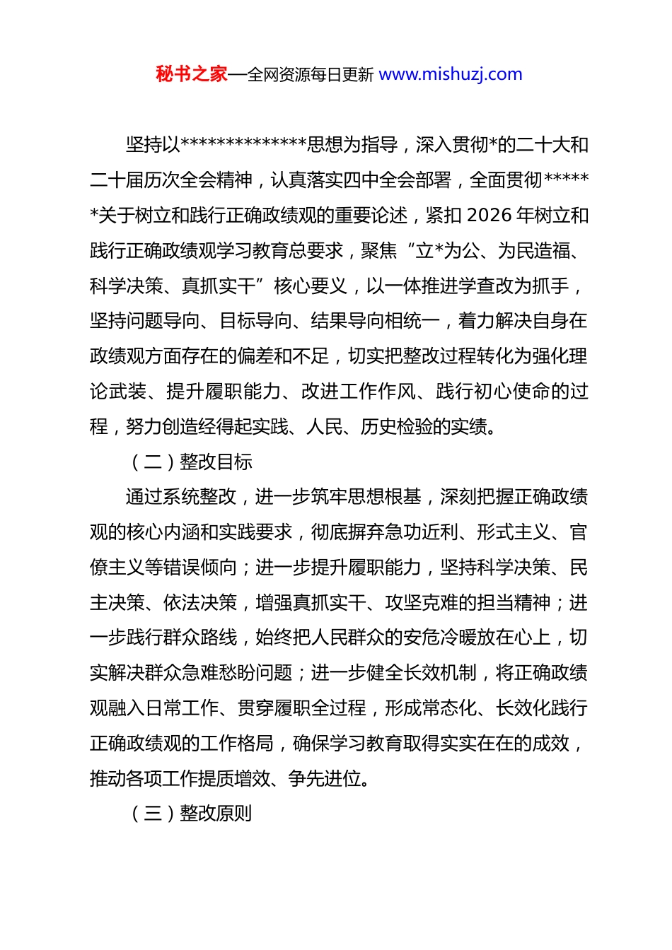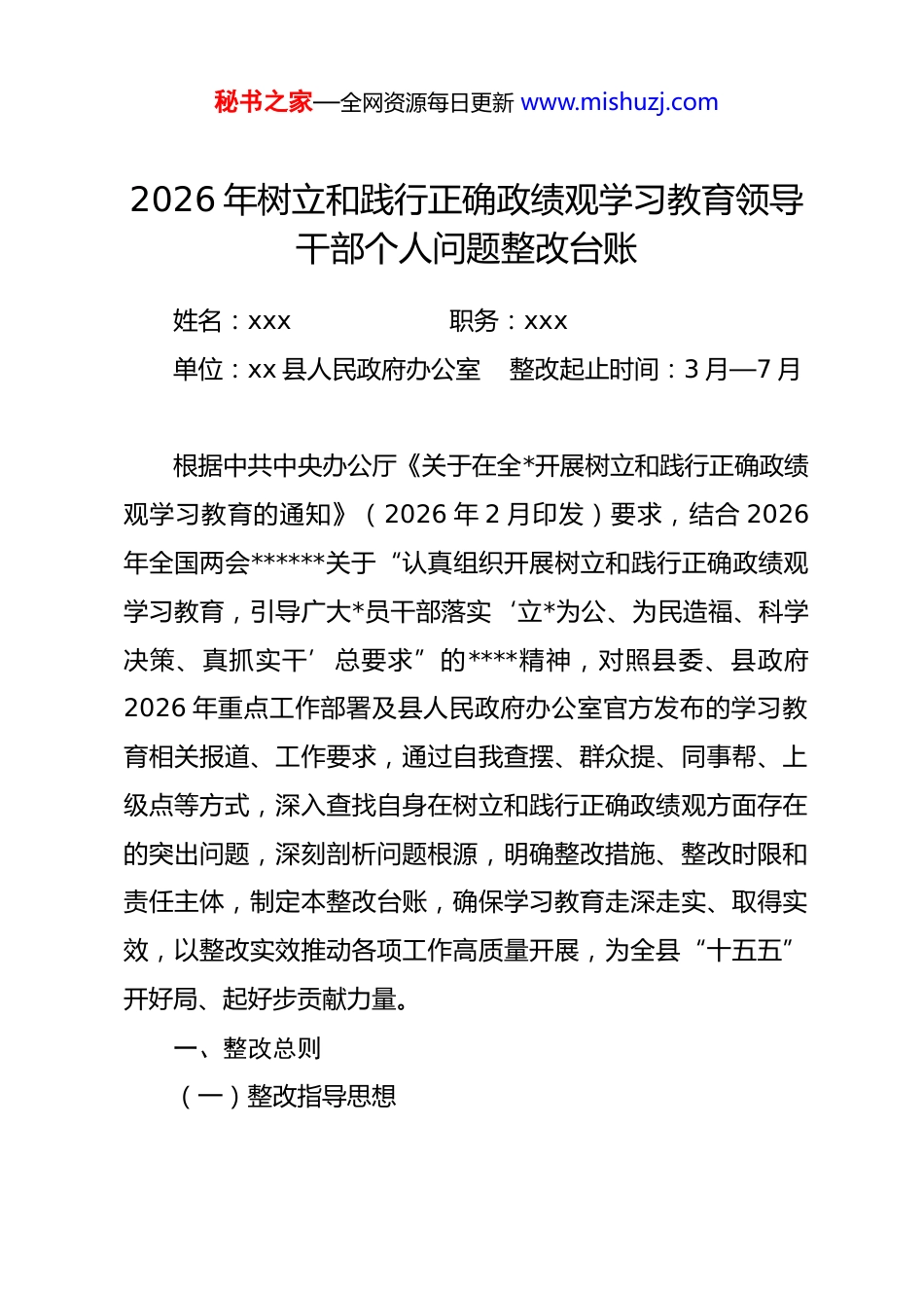 秘书之家—全网资源每日更新 www.mishuzj.com2026 年树立和践行正确政绩观学习教育领导干部个人问题整改台账姓名:xxx 职务:xxx 单位:xx 县人民政府办公室 整改起止时间:3 月—7 月根据中共中央办公厅《关于在全*开展树立和践行正确政绩观学习教育的通知》(2026 年 2 月印发)要求,结合 2026年全国两会******关于“认真组织开展树立和践行正确政绩观学习教育,引导广大*员干部落实‘立*为公、为民造福、科学决策、真抓实干’总要求”的****精神,对照县委、县政府2026 年重点工作部署及县人民政府办公室官方发布的学习教育相关报道、工作要求,通过自我查摆、群众提、同事帮、上级点等方式,深入查找自身在树立和践行正确政绩观方面存在的突出问题,深刻剖析问题根源,明确整改措施、整改时限和责任主体,制定本整改台账,确保学习教育走深走实、取得实效,以整改实效推动各项工作高质量开展,为全县“十五五”开好局、起好步贡献力量。一、整改总则(一)整改指导思想秘书之家—全网资源每日更新 www.mishuzj.com坚持以**************思想为指导,深入贯彻*的二十大和二十届历次全会精神,认真落实四中全会部署,全面贯彻******关于树立和践行正确政绩观的重要论述,紧扣 2026 年树立和践行正确政绩观学习教育总要求,聚焦“立*为公、为民造福、科学决策、真抓实干”核心要义,以一体推进学查改为抓手,坚持问题导向、目标导向、结果导向相统一,着力解决自身在政绩观方面存在的偏差和不足,切实把整改过程转化为强化理论武装、提升履职能力、改进工作作风、践行初心使命的过程,努力创造经得起实践、人民、历史检验的实绩。(二)整改目标通过系统整改,进一步筑牢思想根基,深刻把握正确政绩观的核心内涵和实践要求,彻底摒弃急功近利、形式主义、官僚主义等错误倾向;进一步提升履职能力,坚持科学决策、民主决策、依法决策,增强真抓实干、攻坚克难的担当精神;进一步践行群众路线,始终把人民群众的安危冷暖放在心上,切实解决群众急难愁盼问题;进一步健全长效机制,将正确政绩观融入日常工作、贯穿履职全过程,形成常态化、长效化践行正确政绩观的工作格局,确保学习教育取得实实在在的成效,推动各项工作提质增效、争先进位。(三)整改原则秘书之家—全网资源每日更新 www.mishuzj.com1. 坚持政治引领,突出*性修养。始终把政治建设摆在首位,以******重要论述为根本遵循,从*性高度剖析问题根源,强化政治判断力、政治领悟力、政治执行力,确保整改工作始终沿着正确政治方向推进。2. 坚持问题导向,做到精准施策。对照查摆的问题,逐项梳理、分类施策,不回避、不遮掩,找准问题症结,细化整改措施,明确整改时限,确保每个问题都有人管、有措施、有成效,做到靶向发力、精准整改。3. 坚持实事求是,力戒形式主义。立足自身实际和工作岗位,实事求是查摆问题,不夸大、不缩小,整改措施务实管用、可落地、可检验,坚决杜绝“表面整改”“虚假整改”“敷衍整改”,以务实作风推动整改落地见效。4. 坚持标本兼治,注重长效建设。既要着力解决当前突出问题,立行立改、即知即改,又要深挖问题根源,完善制度机制,强化制度约束,推动整改成果制度化、长效化,从根本上杜绝同类问题再次发生。5. 坚持开门整改,接受群众监督。严格落实“开门教育”要求,查摆问题听取群众意见,整改过程接受群众监督,整改成效接受群众评判,坚持民生为大,为群众多办实事,让群众可感可及。秘书之家—全网资源每日更新 www.mishuzj.com二、存在的主要问题结合自身工作实际,对照 2026 年树立和践行正确政绩观学习教育要求,参考县人民政府办公室官方公众号、县政府门户网站发布的学习教育专题报道、工作通报及群众反馈意见,经全面查摆,主要存在以下 5 个方面 18 个具体问题,重点聚焦政绩观偏差、理论学习、履职担当、群众工作、作风建设等关键环节,均为自身真实存在、需切实整改的突出问题。(一)政绩观认知存在偏差,“重显绩、轻潜绩”倾向较为明显1. 思想认识有偏差,对正确政绩观的核心内涵把握不够透彻,存在“重显绩、轻潜绩”“重短期、轻...