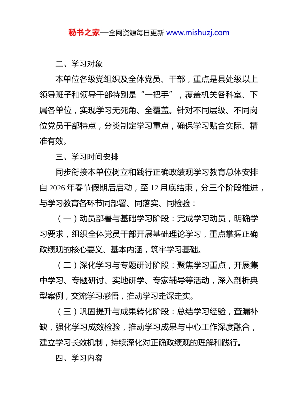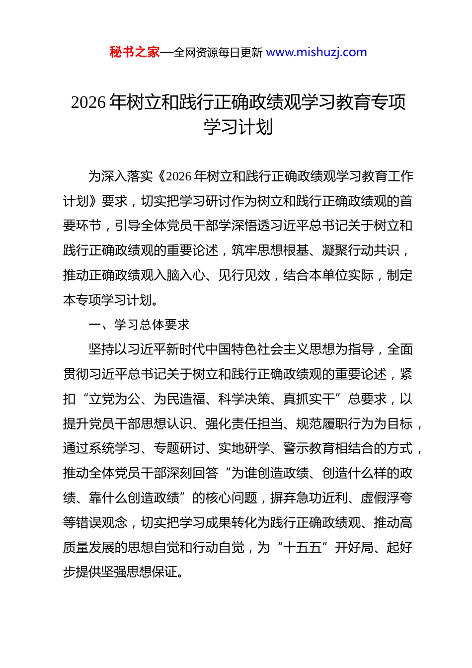 秘书之家—全网资源每日更新 www.mishuzj.com2026 年树立和践行正确政绩观学习教育专项学习计划 为深入落实《2026 年树立和践行正确政绩观学习教育工作计划》要求,切实把学习研讨作为树立和践行正确政绩观的首要环节,引导全体党员干部学深悟透习近平总书记关于树立和践行正确政绩观的重要论述,筑牢思想根基、凝聚行动共识,推动正确政绩观入脑入心、见行见效,结合本单位实际,制定本专项学习计划。一、学习总体要求坚持以习近平新时代中国特色社会主义思想为指导,全面贯彻习近平总书记关于树立和践行正确政绩观的重要论述,紧扣“立党为公、为民造福、科学决策、真抓实干”总要求,以提升党员干部思想认识、强化责任担当、规范履职行为为目标,通过系统学习、专题研讨、实地研学、警示教育相结合的方式,推动全体党员干部深刻回答“为谁创造政绩、创造什么样的政绩、靠什么创造政绩”的核心问题,摒弃急功近利、虚假浮夸等错误观念,切实把学习成果转化为践行正确政绩观、推动高质量发展的思想自觉和行动自觉,为“十五五”开好局、起好步提供坚强思想保证。秘书之家—全网资源每日更新 www.mishuzj.com二、学习对象本单位各级党组织及全体党员、干部,重点是县处级以上领导班子和领导干部特别是“一把手”,覆盖机关各科室、下属各单位,实现学习无死角、全覆盖。针对不同层级、不同岗位党员干部特点,分类制定学习重点,确保学习贴合实际、精准有效。三、学习时间安排同步衔接本单位树立和践行正确政绩观学习教育总体安排自 2026 年春节假期后启动,至 12 月底结束,分三个阶段推进,与学习教育各环节同部署、同落实、同检验:(一)动员部署与基础学习阶段:完成学习动员,明确学习要求,组织全体党员干部开展基础理论学习,重点掌握正确政绩观的核心要义、基本内涵,筑牢学习基础。(二)深化学习与专题研讨阶段:聚焦学习重点,开展集中学习、专题研讨、实地研学、专家辅导等活动,深入剖析典型案例,交流学习感悟,推动学习走深走实。(三)巩固提升与成果转化阶段:总结学习经验,查漏补缺,强化学习成效检验,推动学习成果与中心工作深度融合,建立学习长效机制,持续深化对正确政绩观的理解和践行。四、学习内容秘书之家—全网资源每日更新 www.mishuzj.com围绕正确政绩观学习教育核心要求,明确四大类学习内容确保学习全面系统、重点突出:(一)核心理论学习1.深入学习习近平新时代中国特色社会主义思想,重点研读习近平总书记关于树立和践行正确政绩观的重要论述,深刻领会其核心要义、精神实质、丰富内涵和实践要求,准确把握正确政绩观的理论渊源和实践要求。2.学习党的二十大和二十届历次全会精神,深入学习《中共中央关于制定国民经济和社会发展第十五个五年规划的建议》,深刻理解党中央关于高质量发展、民生保障、生态保护等重大决策部署,明确践行正确政绩观的方向和路径。3.学习习近平总书记在 2026 年全国两会期间关于树立和践行正确政绩观的重要指示精神,切实把思想和行动统一到党中央决策部署上来,增强践行正确政绩观的政治自觉。4.学习党章党规、党的优良传统作风,深入学习党的群众路线,深刻认识“以人民为中心”是正确政绩观的核心,牢固树立立党为公、为民造福的理念。(二)先进典型学习1.学习践行正确政绩观的先进地区经验,重点学习正定、福州、湖州长兴等地在推动高质量发展、增进民生福祉、生态秘书之家—全网资源每日更新 www.mishuzj.com环境保护等方面的先进实践,汲取“功成不必在我,功成必定有我”的担当精神。2.学习本地区、本系统、本单位践行正确政绩观的先进典型,宣传身边党员干部立足岗位、实干担当、为民服务的先进事迹,发挥典型示范引领作用,引导党员干部见贤思齐。(三)反面案例警示学习选取政绩观偏差导致的典型反面案例,重点剖析急功近利盲目决策、形式主义、官僚主义等问题带来的危害,深入分析问题产生的思想根源、制度漏洞和作风短板,开展警示教育,引导党员干部汲取教训、警钟长鸣,坚决防范政绩观偏差。(四)岗位实践学习结合本单位核心职能和党员干部岗位实际,学习与履职尽责相关的政策法规、...