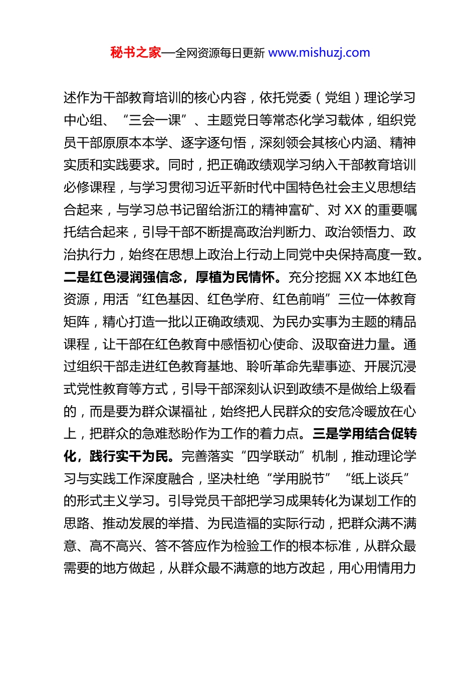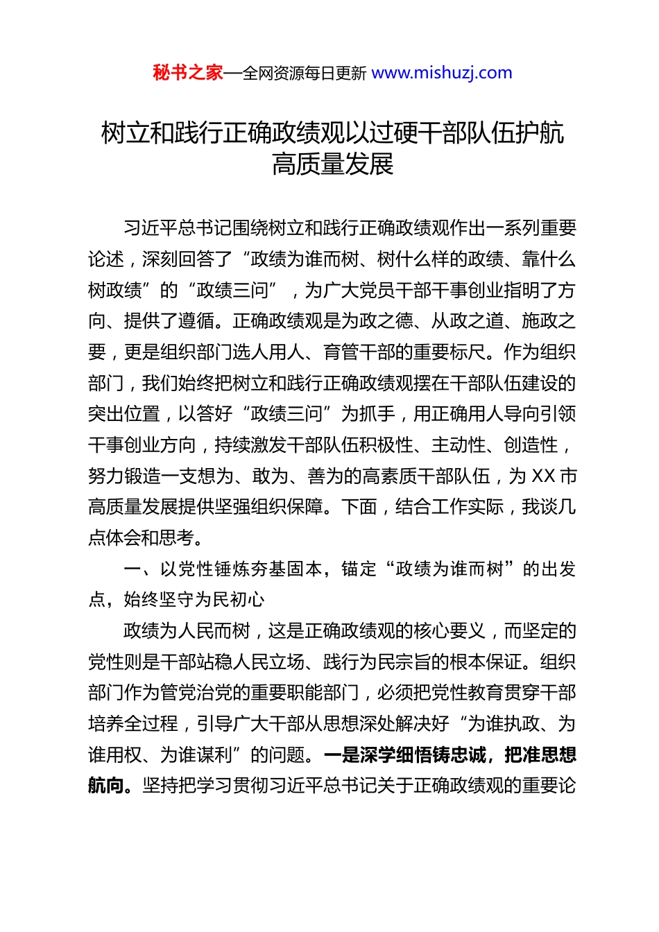 秘书之家—全网资源每日更新 www.mishuzj.com树立和践行正确政绩观以过硬干部队伍护航高质量发展习近平总书记围绕树立和践行正确政绩观作出一系列重要论述,深刻回答了“政绩为谁而树、树什么样的政绩、靠什么树政绩”的“政绩三问”,为广大党员干部干事创业指明了方向、提供了遵循。正确政绩观是为政之德、从政之道、施政之要,更是组织部门选人用人、育管干部的重要标尺。作为组织部门,我们始终把树立和践行正确政绩观摆在干部队伍建设的突出位置,以答好“政绩三问”为抓手,用正确用人导向引领干事创业方向,持续激发干部队伍积极性、主动性、创造性,努力锻造一支想为、敢为、善为的高素质干部队伍,为 XX 市高质量发展提供坚强组织保障。下面,结合工作实际,我谈几点体会和思考。一、以党性锤炼夯基固本,锚定“政绩为谁而树”的出发点,始终坚守为民初心政绩为人民而树,这是正确政绩观的核心要义,而坚定的党性则是干部站稳人民立场、践行为民宗旨的根本保证。组织部门作为管党治党的重要职能部门,必须把党性教育贯穿干部培养全过程,引导广大干部从思想深处解决好“为谁执政、为谁用权、为谁谋利”的问题。一是深学细悟铸忠诚,把准思想航向。坚持把学习贯彻习近平总书记关于正确政绩观的重要论秘书之家—全网资源每日更新 www.mishuzj.com述作为干部教育培训的核心内容,依托党委(党组)理论学习中心组、“三会一课”、主题党日等常态化学习载体,组织党员干部原原本本学、逐字逐句悟,深刻领会其核心内涵、精神实质和实践要求。同时,把正确政绩观学习纳入干部教育培训必修课程,与学习贯彻习近平新时代中国特色社会主义思想结合起来,与学习总书记留给浙江的精神富矿、对 XX 的重要嘱托结合起来,引导干部不断提高政治判断力、政治领悟力、政治执行力,始终在思想上政治上行动上同党中央保持高度一致。二是红色浸润强信念,厚植为民情怀。充分挖掘 XX 本地红色资源,用活“红色基因、红色学府、红色前哨”三位一体教育矩阵,精心打造一批以正确政绩观、为民办实事为主题的精品课程,让干部在红色教育中感悟初心使命、汲取奋进力量。通过组织干部走进红色教育基地、聆听革命先辈事迹、开展沉浸式党性教育等方式,引导干部深刻认识到政绩不是做给上级看的,而是要为群众谋福祉,始终把人民群众的安危冷暖放在心上,把群众的急难愁盼作为工作的着力点。三是学用结合促转化,践行实干为民。完善落实“四学联动”机制,推动理论学习与实践工作深度融合,坚决杜绝“学用脱节”“纸上谈兵”的形式主义学习。引导党员干部把学习成果转化为谋划工作的思路、推动发展的举措、为民造福的实际行动,把群众满不满意、高不高兴、答不答应作为检验工作的根本标准,从群众最需要的地方做起,从群众最不满意的地方改起,用心用情用力秘书之家—全网资源每日更新 www.mishuzj.com解决好就业、教育、医疗、养老等民生实事,以实实在在的工作成效回应群众期盼。二、以科学考核精准赋能,明晰“树什么样的政绩”的度量衡,引导干部实干争先政绩的好坏有标尺,发展的成效有刻度。组织部门要发挥考核“指挥棒”“风向标”作用,推动“考人”与“考事”深度融合,构建科学合理、精准务实的考核评价体系,让干部清楚知道该树什么样的政绩、该怎么干出政绩,引导干部树立和践行以人民为中心的发展思想,追求经得起历史、实践和人民检验的实绩。一是突出差异化考核,定准实绩标尺。摒弃“一刀切”“一锅煮”的考核模式,根据不同乡镇(街道)的基础条件、功能定位、产业布局和承担职责,深化构建“共性+个性”考核指标体系,共性指标聚焦党建工作、民生保障、安全稳定等基础工作,个性指标紧扣各乡镇(街道)发展特色、重点任务精准设置,让基础不同的地区有公平的考核标准,让职责不同的干部有清晰的努力方向。同时,对市直单位实行“一单位一策”精准考核,结合各单位核心职能、年度重点工作,量身定制考核指标,突出对主责主业、服务发展、履职效能的考核,避免“千局一面”的考核弊端,让每个单位、每名干部都能找准自身定位、明确工作目标。二是健全常态化监测,抓实过程管理。...