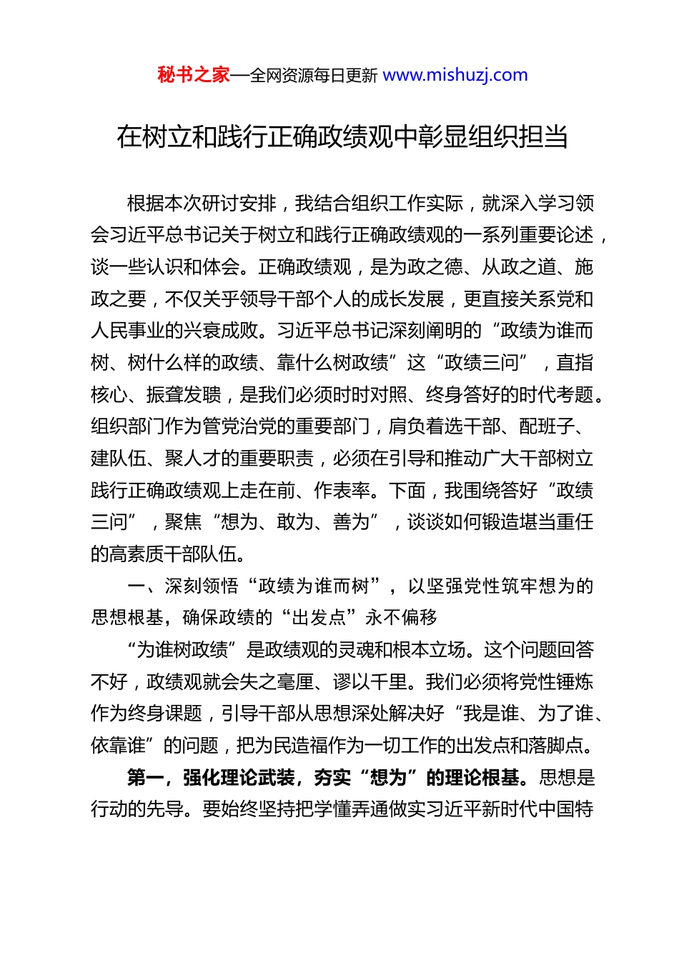 秘书之家—全网资源每日更新 www.mishuzj.com在树立和践行正确政绩观中彰显组织担当根据本次研讨安排,我结合组织工作实际,就深入学习领会习近平总书记关于树立和践行正确政绩观的一系列重要论述,谈一些认识和体会。正确政绩观,是为政之德、从政之道、施政之要,不仅关乎领导干部个人的成长发展,更直接关系党和人民事业的兴衰成败。习近平总书记深刻阐明的“政绩为谁而树、树什么样的政绩、靠什么树政绩”这“政绩三问”,直指核心、振聋发聩,是我们必须时时对照、终身答好的时代考题。组织部门作为管党治党的重要部门,肩负着选干部、配班子、建队伍、聚人才的重要职责,必须在引导和推动广大干部树立践行正确政绩观上走在前、作表率。下面,我围绕答好“政绩三问”,聚焦“想为、敢为、善为”,谈谈如何锻造堪当重任的高素质干部队伍。一、深刻领悟“政绩为谁而树”,以坚强党性筑牢想为的思想根基,确保政绩的“出发点”永不偏移“为谁树政绩”是政绩观的灵魂和根本立场。这个问题回答不好,政绩观就会失之毫厘、谬以千里。我们必须将党性锤炼作为终身课题,引导干部从思想深处解决好“我是谁、为了谁、依靠谁”的问题,把为民造福作为一切工作的出发点和落脚点。第一,强化理论武装,夯实“想为”的理论根基。思想是行动的先导。要始终坚持把学懂弄通做实习近平新时代中国特秘书之家—全网资源每日更新 www.mishuzj.com色社会主义思想作为首要政治任务,特别是要深学细悟总书记关于正确政绩观的重要论述。一是融入日常学。依托党委(党组)理论学习中心组学习、“三会一课”、主题党日等常态化载体,组织干部原原本本学、联系实际学、带着问题学,深刻把握其中蕴含的人民立场、科学方法和实践要求,从党的创新理论中汲取树立正确政绩观的智慧和力量。二是循迹溯源学。总书记在浙江工作期间留下的宝贵精神财富以及对 XX 市的殷切嘱托,是我们最生动、最鲜活的教材。要组织干部沿着总书记的足迹,重温重要指示,感悟为民情怀,将总书记的嘱托内化为干事创业的价值追求和行动自觉,确保想问题、作决策、办事情都始终对标对表。三是创新载体学。用活我市“红色基因、红色学府、红色前哨”三位一体的党性教育矩阵,打造一批具有地方特色的精品课程。完善并严格落实“导学、讲学、研学、践学”的“四学联动”机制,推动学习从“入耳入眼”到“入脑入心”,最终转化为“为民造福”的磅礴动能,让“为官一任、造福一方”成为广大干部的思想自觉。第二,站稳人民立场,校准“想为”的实践路径。政绩的优劣,最终要由人民来评判。必须教育引导干部始终把人民放在心中最高位置。一是坚持深入群众。大兴调查研究之风,推动干部深入基秘书之家—全网资源每日更新 www.mishuzj.com层、深入一线,同群众坐一条板凳,听真话、察实情,真正了解群众的急难愁盼,使各项决策和工作部署更接地气、更合民意。二是聚焦民生实事。将群众满意度作为衡量政绩的重要标尺,引导干部把资源和精力向民生领域倾斜,用心用情用力解决好就业、教育、医疗、住房、养老等群众最关心最直接最现实的利益问题,多做让群众看得见、摸得着、得实惠的好事实事。三是尊重群众首创。拜人民为师,甘当小学生,善于从人民群众的实践中汲取智慧和力量,使我们的工作始终体现群众意愿、得到群众支持。第三,严明纪律规矩,划清“想为”的界限底线。树立正确政绩观,必须明确什么能干、什么不能干。一是坚决反对形式主义、官僚主义。教育干部决不能搞华而不实、劳民伤财的“形象工程”“政绩工程”,决不能为了树立个人形象,搞选择性落实、象征性执行。二是力戒急功近利。引导干部涵养“功成不必在我、功成必定有我”的境界,既要做让老百姓咧嘴笑的事,也要做为后人作铺垫、打基础、利长远的事,追求实实在在、没有水分、经得起历史和人民检验的业绩。三是坚守廉洁底线。加强纪律教育和警示教育,让干部知敬畏、存戒惧、守底线,明白搞歪门邪道、以权谋私换来的所秘书之家—全网资源每日更新 www.mishuzj.com谓“政绩”,最终只能是海市蜃楼,害人害己。二、精准把握“树什么样的政绩”,以科学考核明晰善为的评价...