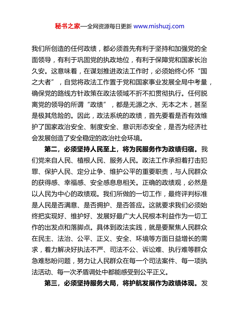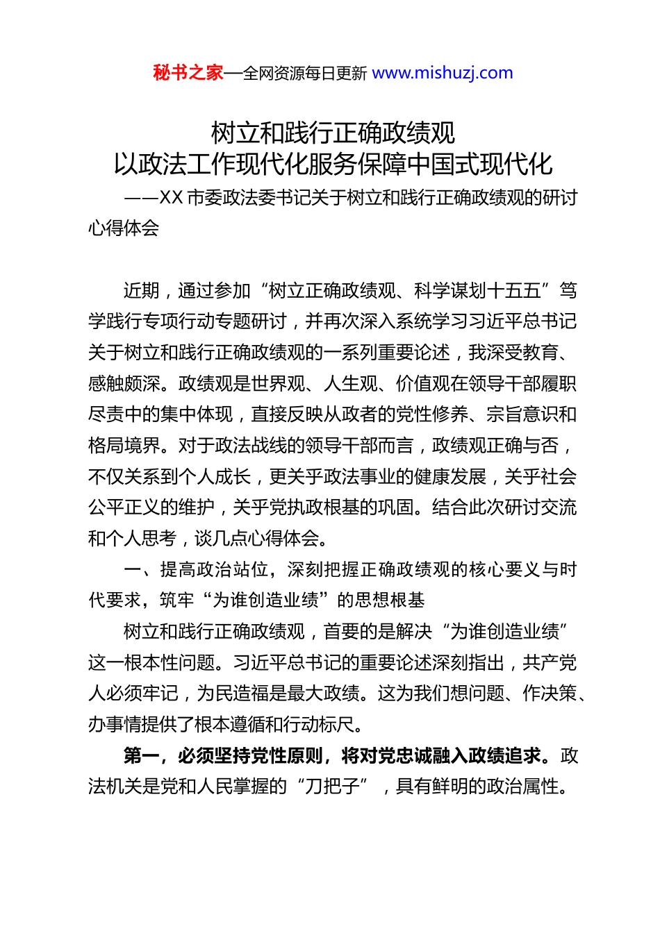 秘书之家—全网资源每日更新 www.mishuzj.com树立和践行正确政绩观以政法工作现代化服务保障中国式现代化——XX 市委政法委书记关于树立和践行正确政绩观的研讨心得体会近期,通过参加“树立正确政绩观、科学谋划十五五”笃学践行专项行动专题研讨,并再次深入系统学习习近平总书记关于树立和践行正确政绩观的一系列重要论述,我深受教育、感触颇深。政绩观是世界观、人生观、价值观在领导干部履职尽责中的集中体现,直接反映从政者的党性修养、宗旨意识和格局境界。对于政法战线的领导干部而言,政绩观正确与否,不仅关系到个人成长,更关乎政法事业的健康发展,关乎社会公平正义的维护,关乎党执政根基的巩固。结合此次研讨交流和个人思考,谈几点心得体会。一、提高政治站位,深刻把握正确政绩观的核心要义与时代要求,筑牢“为谁创造业绩”的思想根基树立和践行正确政绩观,首要的是解决“为谁创造业绩”这一根本性问题。习近平总书记的重要论述深刻指出,共产党人必须牢记,为民造福是最大政绩。这为我们想问题、作决策、办事情提供了根本遵循和行动标尺。第一,必须坚持党性原则,将对党忠诚融入政绩追求。政法机关是党和人民掌握的“刀把子”,具有鲜明的政治属性。秘书之家—全网资源每日更新 www.mishuzj.com我们所创造的任何政绩,都必须首先有利于坚持和加强党的全面领导,有利于巩固党的执政地位,有利于保障党和国家长治久安。这意味着,在谋划推进政法工作时,必须始终心怀“国之大者”,自觉将政法工作置于党和国家事业发展全局中考量,确保党的路线方针政策在政法领域不折不扣贯彻执行。任何脱离党的领导的所谓“政绩”,都是无源之水、无本之木,甚至是极其危险的。因此,政法系统的政绩,首先要看是否有效维护了国家政治安全、制度安全、意识形态安全,是否为经济社会发展创造了安全稳定的政治社会环境。第二,必须坚持人民至上,将为民服务作为政绩归宿。我们党来自人民、植根人民、服务人民。政法工作承担着打击犯罪、保护人民、定分止争、维护公平的重要职责,与人民群众的获得感、幸福感、安全感息息相关。正确的政绩观,必然是以人民为中心的政绩观。我们所做的一切工作,最终评判标准是人民是否满意、是否拥护、是否答应。这就要求我们必须始终把实现好、维护好、发展好最广大人民根本利益作为一切工作的出发点和落脚点。具体到政法实践,就是要聚焦人民群众在民主、法治、公平、正义、安全、环境等方面日益增长的需求,着力解决好执法不严、司法不公、诉讼难、执行难等群众急难愁盼问题,努力让人民群众在每一个司法案件、每一项执法活动、每一次矛盾调处中都能感受到公平正义。第三,必须坚持服务大局,将护航发展作为政绩体现。发秘书之家—全网资源每日更新 www.mishuzj.com展是党执政兴国的第一要务。政法工作不是孤立存在的,必须紧紧围绕中心、服务大局。正确的政绩观,要求我们自觉将政法工作融入经济社会发展全局,找准服务保障的结合点和着力点。正如研讨会上所强调的,要“以政法工作现代化服务保障现代化区域中心城市建设”。这意味着,我们的政绩不仅要体现在“保平安、护稳定”上,也要体现在“促发展、优环境”上。例如,通过深入开展“宜企暖心、解难纾困、护航发展”专项行动,依法平等保护各类市场主体产权和合法权益,营造稳定公平透明、可预期的法治化营商环境,就是服务高质量发展的重要政绩。通过常态化开展扫黑除恶斗争,净化社会生态,就是为经济健康发展扫清障碍的重要体现。二、站稳人民立场,科学界定“创造什么样的业绩”,明确政法工作的价值导向与实践路径明确了“为谁创造业绩”,紧接着就要回答“创造什么样的业绩”。这决定了我们工作的着力点和评价标准。结合此次研讨和政法工作实际,我认为新时代政法工作应致力于创造以下几方面实打实、经得起历史和人民检验的政绩:第一,要创造维护安全稳定的“基石性”业绩。安全是发展的前提,稳定是强盛的基础。没有安全稳定的环境,一切都无从谈起。因此,全力维护国家政治安全和社会大局稳定,是政法机关必须履行好的首要职责,也是最基础、最重要的政绩。这要求我们必须...