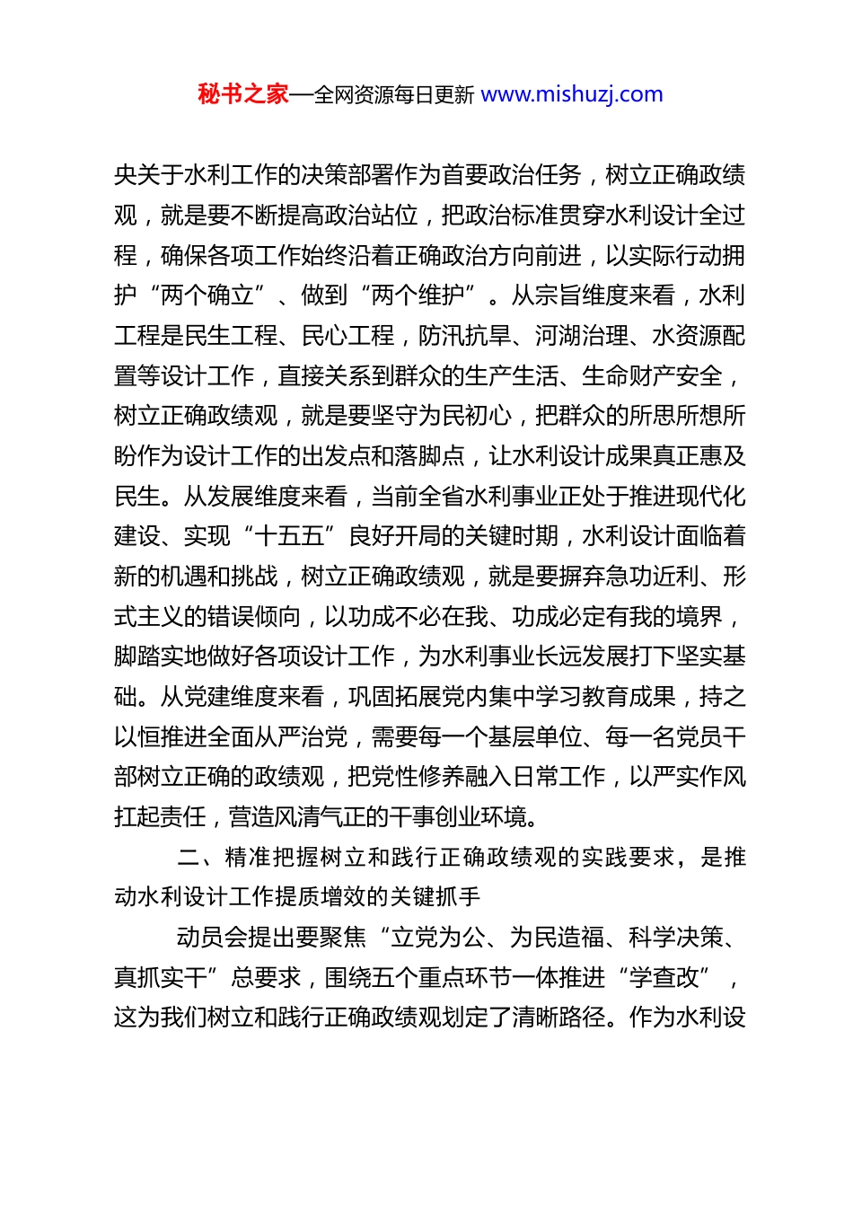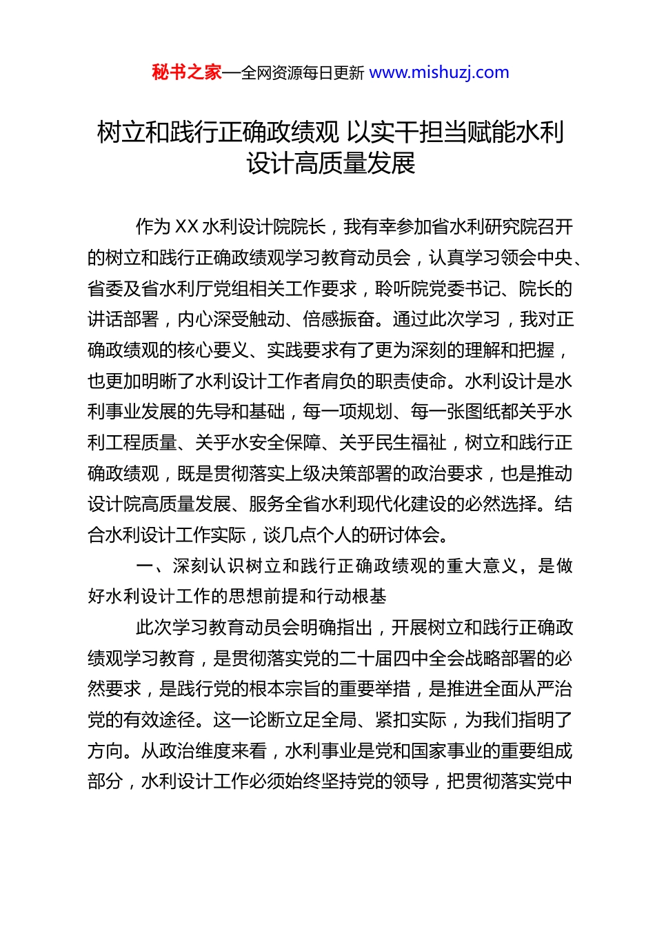 秘书之家—全网资源每日更新 www.mishuzj.com树立和践行正确政绩观 以实干担当赋能水利设计高质量发展作为 XX 水利设计院院长,我有幸参加省水利研究院召开的树立和践行正确政绩观学习教育动员会,认真学习领会中央、省委及省水利厅党组相关工作要求,聆听院党委书记、院长的讲话部署,内心深受触动、倍感振奋。通过此次学习,我对正确政绩观的核心要义、实践要求有了更为深刻的理解和把握,也更加明晰了水利设计工作者肩负的职责使命。水利设计是水利事业发展的先导和基础,每一项规划、每一张图纸都关乎水利工程质量、关乎水安全保障、关乎民生福祉,树立和践行正确政绩观,既是贯彻落实上级决策部署的政治要求,也是推动设计院高质量发展、服务全省水利现代化建设的必然选择。结合水利设计工作实际,谈几点个人的研讨体会。一、深刻认识树立和践行正确政绩观的重大意义,是做好水利设计工作的思想前提和行动根基此次学习教育动员会明确指出,开展树立和践行正确政绩观学习教育,是贯彻落实党的二十届四中全会战略部署的必然要求,是践行党的根本宗旨的重要举措,是推进全面从严治党的有效途径。这一论断立足全局、紧扣实际,为我们指明了方向。从政治维度来看,水利事业是党和国家事业的重要组成部分,水利设计工作必须始终坚持党的领导,把贯彻落实党中秘书之家—全网资源每日更新 www.mishuzj.com央关于水利工作的决策部署作为首要政治任务,树立正确政绩观,就是要不断提高政治站位,把政治标准贯穿水利设计全过程,确保各项工作始终沿着正确政治方向前进,以实际行动拥护“两个确立”、做到“两个维护”。从宗旨维度来看,水利工程是民生工程、民心工程,防汛抗旱、河湖治理、水资源配置等设计工作,直接关系到群众的生产生活、生命财产安全,树立正确政绩观,就是要坚守为民初心,把群众的所思所想所盼作为设计工作的出发点和落脚点,让水利设计成果真正惠及民生。从发展维度来看,当前全省水利事业正处于推进现代化建设、实现“十五五”良好开局的关键时期,水利设计面临着新的机遇和挑战,树立正确政绩观,就是要摒弃急功近利、形式主义的错误倾向,以功成不必在我、功成必定有我的境界,脚踏实地做好各项设计工作,为水利事业长远发展打下坚实基础。从党建维度来看,巩固拓展党内集中学习教育成果,持之以恒推进全面从严治党,需要每一个基层单位、每一名党员干部树立正确的政绩观,把党性修养融入日常工作,以严实作风扛起责任,营造风清气正的干事创业环境。二、精准把握树立和践行正确政绩观的实践要求,是推动水利设计工作提质增效的关键抓手动员会提出要聚焦“立党为公、为民造福、科学决策、真抓实干”总要求,围绕五个重点环节一体推进“学查改”,这为我们树立和践行正确政绩观划定了清晰路径。作为水利设秘书之家—全网资源每日更新 www.mishuzj.com计单位,我们必须严格对标对表,把总要求和工作环节落到实处、落到细处。一是坚守立党为公的根本立场,始终把党的事业放在首位。水利设计工作具有鲜明的公益性和公共性,必须摒弃个人得失、部门利益的狭隘思维,把服务全省水利发展大局作为核心目标,在承接设计任务、制定设计方案时,始终以党和国家的水利工作方针为遵循,以全省水安全保障需求为导向,确保设计工作符合党委政府的决策部署。二是锚定为民造福的最终目标,让水利设计更有温度。在开展水利规划设计、河湖长制技术支撑等工作中,要坚持深入一线、实地调研,摸清各地水资源禀赋、水灾害隐患、水生态问题,倾听基层群众、水利工作者的意见建议,避免闭门造车、纸上谈兵。无论是小型农田水利工程,还是重大防洪排涝项目,都要把群众的切身利益放在心上,在设计中兼顾实用性、普惠性,让水利工程真正成为解民忧、惠民生的民心工程。三是坚持科学决策的核心原则,提升水利设计的专业水准。水利设计是一项科学性、专业性极强的工作,一个错误的设计方案不仅会造成资源浪费,还可能引发水安全隐患。树立正确政绩观,就是要把科学精神贯穿设计全过程,严格遵循水利工程建设的客观规律,加强水文、地质、生态等基础数据的分析研判,组织专业技术团队...