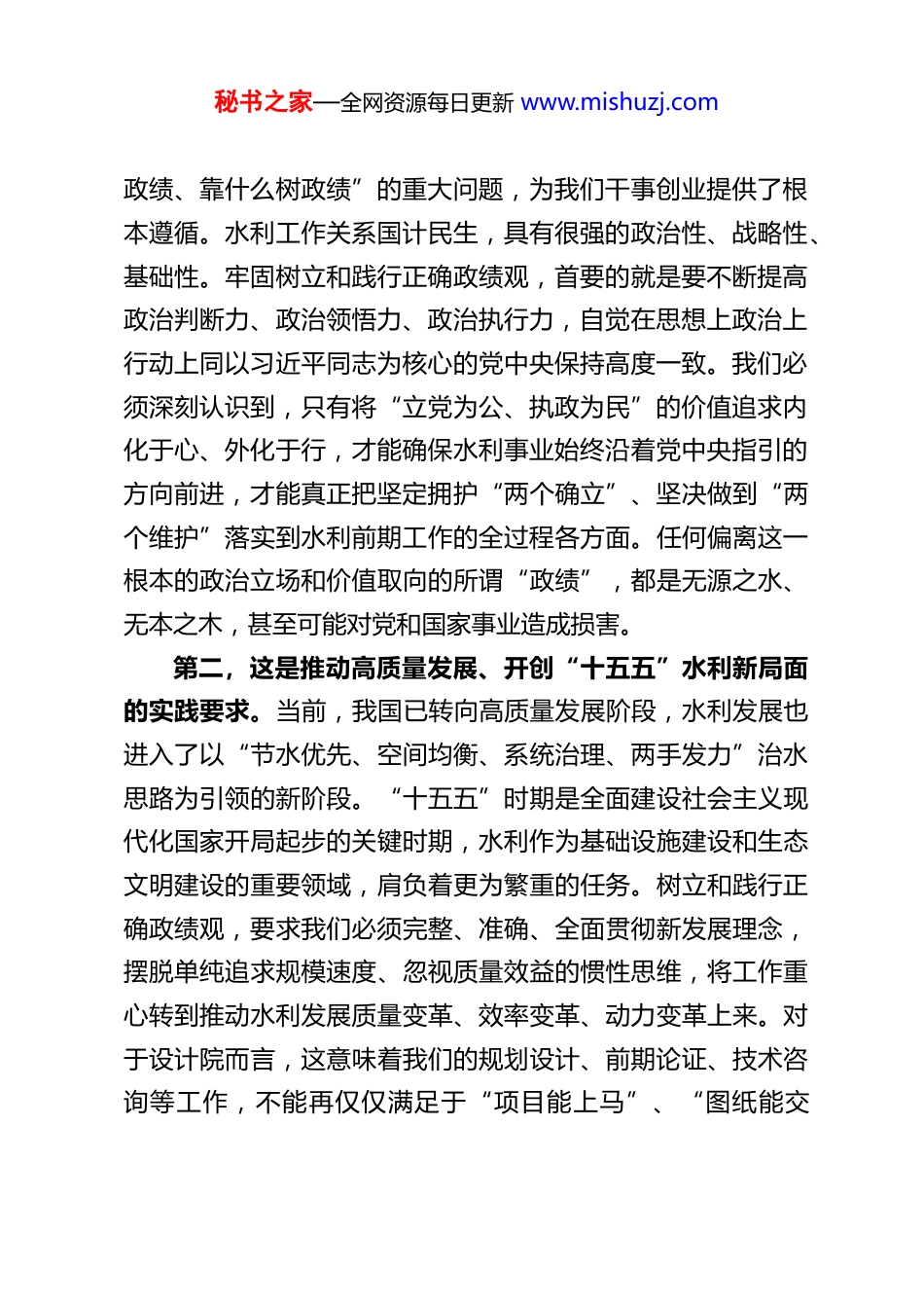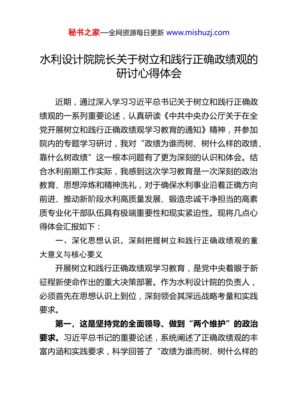秘书之家—全网资源每日更新 www.mishuzj.com水利设计院院长关于树立和践行正确政绩观的研讨心得体会近期,通过深入学习习近平总书记关于树立和践行正确政绩观的一系列重要论述,认真研读《中共中央办公厅关于在全党开展树立和践行正确政绩观学习教育的通知》精神,并参加院内的专题学习研讨,我对“政绩为谁而树、树什么样的政绩、靠什么树政绩”这一根本问题有了更为深刻的认识和体会。结合水利前期工作实际,我感到这次学习教育是一次深刻的政治教育、思想淬炼和精神洗礼,对于确保水利事业沿着正确方向前进、推动新阶段水利高质量发展、锻造忠诚干净担当的高素质专业化干部队伍具有极端重要性和现实紧迫性。现将几点心得体会汇报如下:一、深化思想认识,深刻把握树立和践行正确政绩观的重大意义与核心要义开展树立和践行正确政绩观学习教育,是党中央着眼于新征程新使命作出的重大决策部署。作为水利设计院的负责人,必须首先在思想认识上到位,深刻领会其深远战略考量和实践要求。第一,这是坚持党的全面领导、做到“两个维护”的政治要求。习近平总书记的重要论述,系统阐述了正确政绩观的丰富内涵和实践要求,科学回答了“政绩为谁而树、树什么样的秘书之家—全网资源每日更新 www.mishuzj.com政绩、靠什么树政绩”的重大问题,为我们干事创业提供了根本遵循。水利工作关系国计民生,具有很强的政治性、战略性、基础性。牢固树立和践行正确政绩观,首要的就是要不断提高政治判断力、政治领悟力、政治执行力,自觉在思想上政治上行动上同以习近平同志为核心的党中央保持高度一致。我们必须深刻认识到,只有将“立党为公、执政为民”的价值追求内化于心、外化于行,才能确保水利事业始终沿着党中央指引的方向前进,才能真正把坚定拥护“两个确立”、坚决做到“两个维护”落实到水利前期工作的全过程各方面。任何偏离这一根本的政治立场和价值取向的所谓“政绩”,都是无源之水、无本之木,甚至可能对党和国家事业造成损害。第二,这是推动高质量发展、开创“十五五”水利新局面的实践要求。当前,我国已转向高质量发展阶段,水利发展也进入了以“节水优先、空间均衡、系统治理、两手发力”治水思路为引领的新阶段。“十五五”时期是全面建设社会主义现代化国家开局起步的关键时期,水利作为基础设施建设和生态文明建设的重要领域,肩负着更为繁重的任务。树立和践行正确政绩观,要求我们必须完整、准确、全面贯彻新发展理念,摆脱单纯追求规模速度、忽视质量效益的惯性思维,将工作重心转到推动水利发展质量变革、效率变革、动力变革上来。对于设计院而言,这意味着我们的规划设计、前期论证、技术咨询等工作,不能再仅仅满足于“项目能上马”、“图纸能交秘书之家—全网资源每日更新 www.mishuzj.com付”,而必须更加注重系统性、前瞻性、战略性,更加注重水资源水生态水环境统筹,更加注重工程的全生命周期效益,努力提供更多优质水利公共产品,以高质量的前期工作支撑水利高质量发展,为“十五五”水利开好局、起好步奠定坚实基础。第三,这是锻造过硬队伍、践行“以人民为中心”发展思想的内在要求。政绩观是党员干部党性修养、宗旨意识、能力作风的集中体现。设计院是水利技术人才聚集地,干部职工的政绩观直接影响到水利工程的前期质量、建设成效乃至长远运行。开展学习教育,就是要引导全院干部职工,特别是领导干部和项目负责人,时刻牢记“为民造福是最大政绩”,始终把人民放在心中最高位置。水利工程功在当代、利在千秋,直接关系到人民群众的防洪安全、饮水安全、粮食安全和生态安全。我们必须深刻反思,在工作中是否存在重技术轻民生、重显绩轻潜绩、重当前轻长远的倾向?是否真正做到了“科学决策、真抓实干”?只有树立了正确的政绩观,才能激发干部职工干事创业的正能量,才能打造出一支政治强、业务精、作风硬、敢担当的水利前期铁军,才能确保我们规划和设计的每一项工程都经得起历史、实践和人民的检验。二、坚持问题导向,深入查摆水利前期工作中可能存在的政绩观偏差对照正确政绩观的要求,结合设计院的工作性质和特点,我们必须勇于刀刃向内,深入...