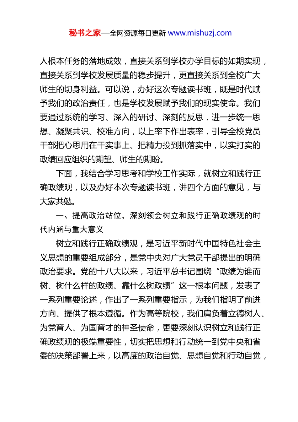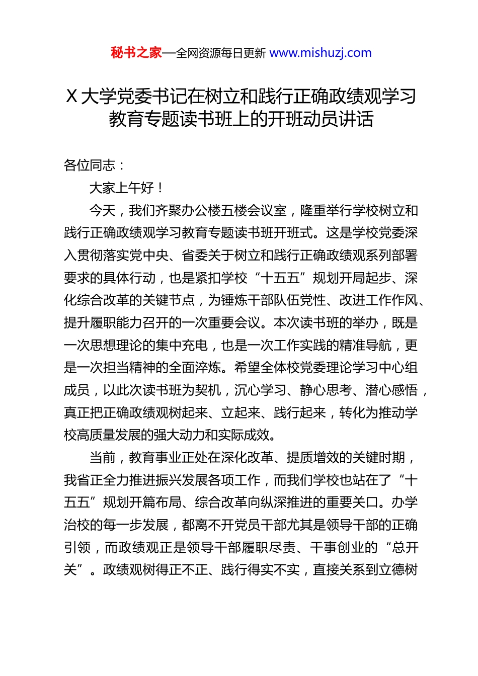 秘书之家—全网资源每日更新 www.mishuzj.comX 大学党委书记在树立和践行正确政绩观学习教育专题读书班上的开班动员讲话各位同志:大家上午好!今天,我们齐聚办公楼五楼会议室,隆重举行学校树立和践行正确政绩观学习教育专题读书班开班式。这是学校党委深入贯彻落实党中央、省委关于树立和践行正确政绩观系列部署要求的具体行动,也是紧扣学校“十五五”规划开局起步、深化综合改革的关键节点,为锤炼干部队伍党性、改进工作作风、提升履职能力召开的一次重要会议。本次读书班的举办,既是一次思想理论的集中充电,也是一次工作实践的精准导航,更是一次担当精神的全面淬炼。希望全体校党委理论学习中心组成员,以此次读书班为契机,沉心学习、静心思考、潜心感悟,真正把正确政绩观树起来、立起来、践行起来,转化为推动学校高质量发展的强大动力和实际成效。当前,教育事业正处在深化改革、提质增效的关键时期,我省正全力推进振兴发展各项工作,而我们学校也站在了“十五五”规划开篇布局、综合改革向纵深推进的重要关口。办学治校的每一步发展,都离不开党员干部尤其是领导干部的正确引领,而政绩观正是领导干部履职尽责、干事创业的“总开关”。政绩观树得正不正、践行得实不实,直接关系到立德树秘书之家—全网资源每日更新 www.mishuzj.com人根本任务的落地成效,直接关系到学校办学目标的如期实现,直接关系到学校发展质量的稳步提升,更直接关系到全校广大师生的切身利益。可以说,办好这次专题读书班,既是时代赋予我们的政治责任,也是学校发展赋予我们的现实使命。我们要通过系统的学习、深入的研讨、深刻的反思,进一步统一思想、凝聚共识、校准方向,以上率下作出表率,引导全校党员干部把心思用在干实事上、把精力投到抓落实中,以实打实的政绩回应组织的期望、师生的期盼。下面,我结合学习思考和学校工作实际,就树立和践行正确政绩观,以及办好本次专题读书班,讲四个方面的意见,与大家共勉。一、提高政治站位,深刻领会树立和践行正确政绩观的时代内涵与重大意义树立和践行正确政绩观,是习近平新时代中国特色社会主义思想的重要组成部分,是党中央对广大党员干部提出的明确政治要求。党的十八大以来,习近平总书记围绕“政绩为谁而树、树什么样的政绩、靠什么树政绩”这一根本问题,发表了一系列重要论述,作出了一系列重要指示,为我们指明了前进方向、提供了根本遵循。作为高等院校,我们肩负着立德树人、为党育人、为国育才的神圣使命,更要深刻认识树立和践行正确政绩观的极端重要性,切实把思想和行动统一到党中央和省委的决策部署上来,以高度的政治自觉、思想自觉和行动自觉,秘书之家—全网资源每日更新 www.mishuzj.com将正确政绩观融入办学治校全过程、各方面。第一,树立和践行正确政绩观,是践行“两个维护”的必然要求。政绩观问题,本质上是政治立场问题、党性修养问题。检验一名党员干部的政绩观,首先要看其是否始终同以习近平同志为核心的党中央保持高度一致,是否把贯彻落实党中央决策部署作为根本的政治任务。教育是国之大计、党之大计,高校作为意识形态工作的重要阵地,必须始终坚持社会主义办学方向,把党的领导贯穿于学校发展的各领域、各环节。举办本次专题读书班,就是要引导全体党员干部从政治高度把握政绩观,不断提高政治判断力、政治领悟力、政治执行力,把树立和践行正确政绩观作为践行“两个维护”的具体实践,确保学校的各项工作始终沿着党中央指引的方向前进,确保省委的各项部署要求在学校落地生根、开花结果。第二,树立和践行正确政绩观,是推动学校高质量发展的迫切需要。发展是第一要务,高质量发展是新时代教育事业的核心要求。当前,学校正处于爬坡过坎、提质增效的关键阶段,“十五五”规划的蓝图已经绘就,“特色化、融合化、数智化、国际化”的发展思路已经明确,深化综合改革、优化专业结构、强化人才培养、推进产教融合等一系列重点工作亟待推进。在这样的关键时期,尤其需要一支政绩观端正、敢担当、善作为的干部队伍。如果政绩观出现偏差,搞形式主义、做表面文章,急功近利、贪大求快,就会偏离学校发...