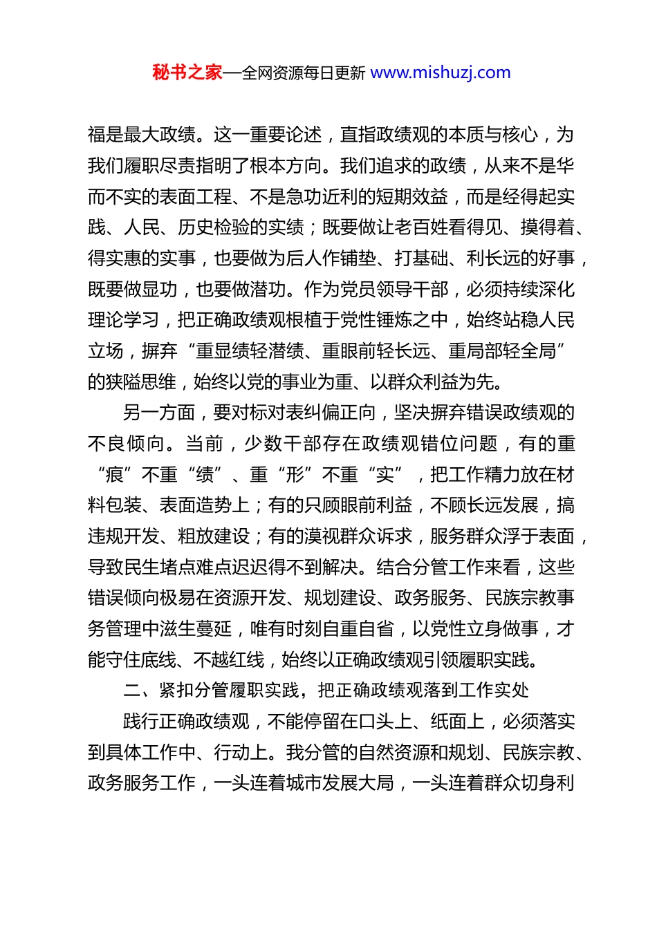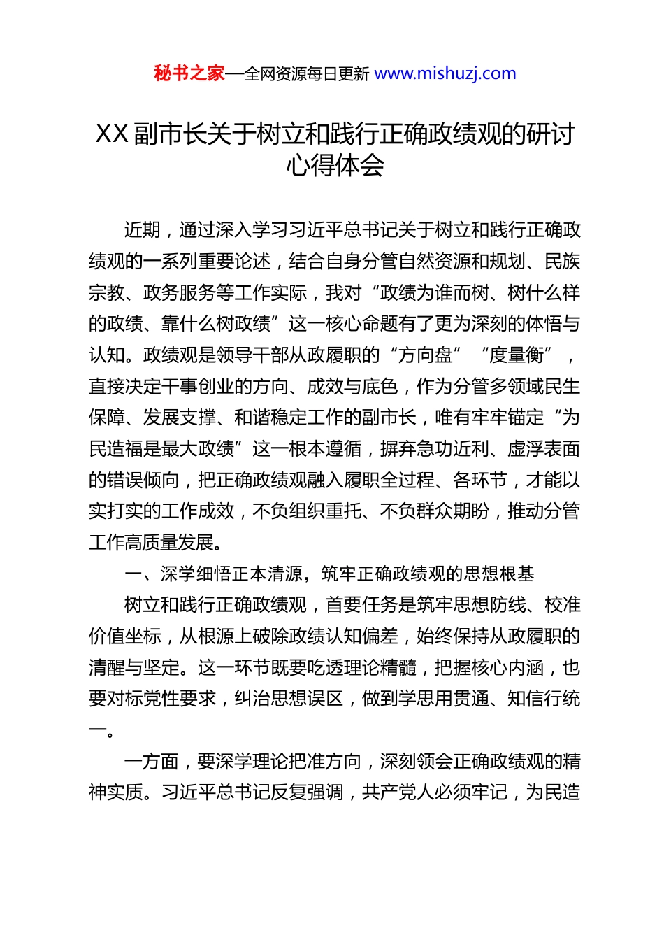 秘书之家—全网资源每日更新 www.mishuzj.comXX 副市长关于树立和践行正确政绩观的研讨心得体会近期,通过深入学习习近平总书记关于树立和践行正确政绩观的一系列重要论述,结合自身分管自然资源和规划、民族宗教、政务服务等工作实际,我对“政绩为谁而树、树什么样的政绩、靠什么树政绩”这一核心命题有了更为深刻的体悟与认知。政绩观是领导干部从政履职的“方向盘”“度量衡”,直接决定干事创业的方向、成效与底色,作为分管多领域民生保障、发展支撑、和谐稳定工作的副市长,唯有牢牢锚定“为民造福是最大政绩”这一根本遵循,摒弃急功近利、虚浮表面的错误倾向,把正确政绩观融入履职全过程、各环节,才能以实打实的工作成效,不负组织重托、不负群众期盼,推动分管工作高质量发展。一、深学细悟正本清源,筑牢正确政绩观的思想根基树立和践行正确政绩观,首要任务是筑牢思想防线、校准价值坐标,从根源上破除政绩认知偏差,始终保持从政履职的清醒与坚定。这一环节既要吃透理论精髓,把握核心内涵,也要对标党性要求,纠治思想误区,做到学思用贯通、知信行统一。一方面,要深学理论把准方向,深刻领会正确政绩观的精神实质。习近平总书记反复强调,共产党人必须牢记,为民造秘书之家—全网资源每日更新 www.mishuzj.com福是最大政绩。这一重要论述,直指政绩观的本质与核心,为我们履职尽责指明了根本方向。我们追求的政绩,从来不是华而不实的表面工程、不是急功近利的短期效益,而是经得起实践、人民、历史检验的实绩;既要做让老百姓看得见、摸得着、得实惠的实事,也要做为后人作铺垫、打基础、利长远的好事,既要做显功,也要做潜功。作为党员领导干部,必须持续深化理论学习,把正确政绩观根植于党性锤炼之中,始终站稳人民立场,摒弃“重显绩轻潜绩、重眼前轻长远、重局部轻全局”的狭隘思维,始终以党的事业为重、以群众利益为先。另一方面,要对标对表纠偏正向,坚决摒弃错误政绩观的不良倾向。当前,少数干部存在政绩观错位问题,有的重“痕”不重“绩”、重“形”不重“实”,把工作精力放在材料包装、表面造势上;有的只顾眼前利益,不顾长远发展,搞违规开发、粗放建设;有的漠视群众诉求,服务群众浮于表面,导致民生堵点难点迟迟得不到解决。结合分管工作来看,这些错误倾向极易在资源开发、规划建设、政务服务、民族宗教事务管理中滋生蔓延,唯有时刻自重自省,以党性立身做事,才能守住底线、不越红线,始终以正确政绩观引领履职实践。二、紧扣分管履职实践,把正确政绩观落到工作实处践行正确政绩观,不能停留在口头上、纸面上,必须落实到具体工作中、行动上。我分管的自然资源和规划、民族宗教、政务服务工作,一头连着城市发展大局,一头连着群众切身利秘书之家—全网资源每日更新 www.mishuzj.com益,既是保障高质量发展的基础支撑,也是维护社会和谐、服务民生福祉的关键抓手,必须立足岗位职责,把正确政绩观贯穿工作全过程,做到守土有责、守土尽责、守土负责。(一)深耕自然资源和规划工作,坚守生态底线、赋能长远发展自然资源和规划工作是城市发展的“定盘星”,关乎生态安全、发展空间、民生宜居,践行正确政绩观,核心是坚持守底线、优布局、惠民生,杜绝短视开发、违规建设,实现资源利用与长远发展的有机统一。一是严守资源保护红线,筑牢生态安全屏障。始终坚持绿水青山就是金山银山的理念,严格落实耕地保护、生态保护红线管控等硬任务,坚决杜绝为了短期政绩违规占地、盲目开发,以最严格的制度守护好自然资源家底,兼顾当前发展需求与长远生态效益,让绿色成为高质量发展的鲜明底色。二是科学统筹规划布局,提升城市发展质效。立足城市发展实际,摒弃贪大求洋、盲目扩张的错误规划思路,坚持以人为本、因地制宜,统筹生产、生活、生态三大空间,优化城乡规划布局,既保障重点项目、民生工程用地需求,也兼顾群众宜居、生态涵养,让规划既有前瞻性、科学性,更有温度、接地气。三是推动资源集约高效利用,夯实发展根基。摒弃粗放式资源利用模式,聚焦土地节约集约利用、矿产资源有序开发等重点,盘活闲置低效资源,破解发展用地...