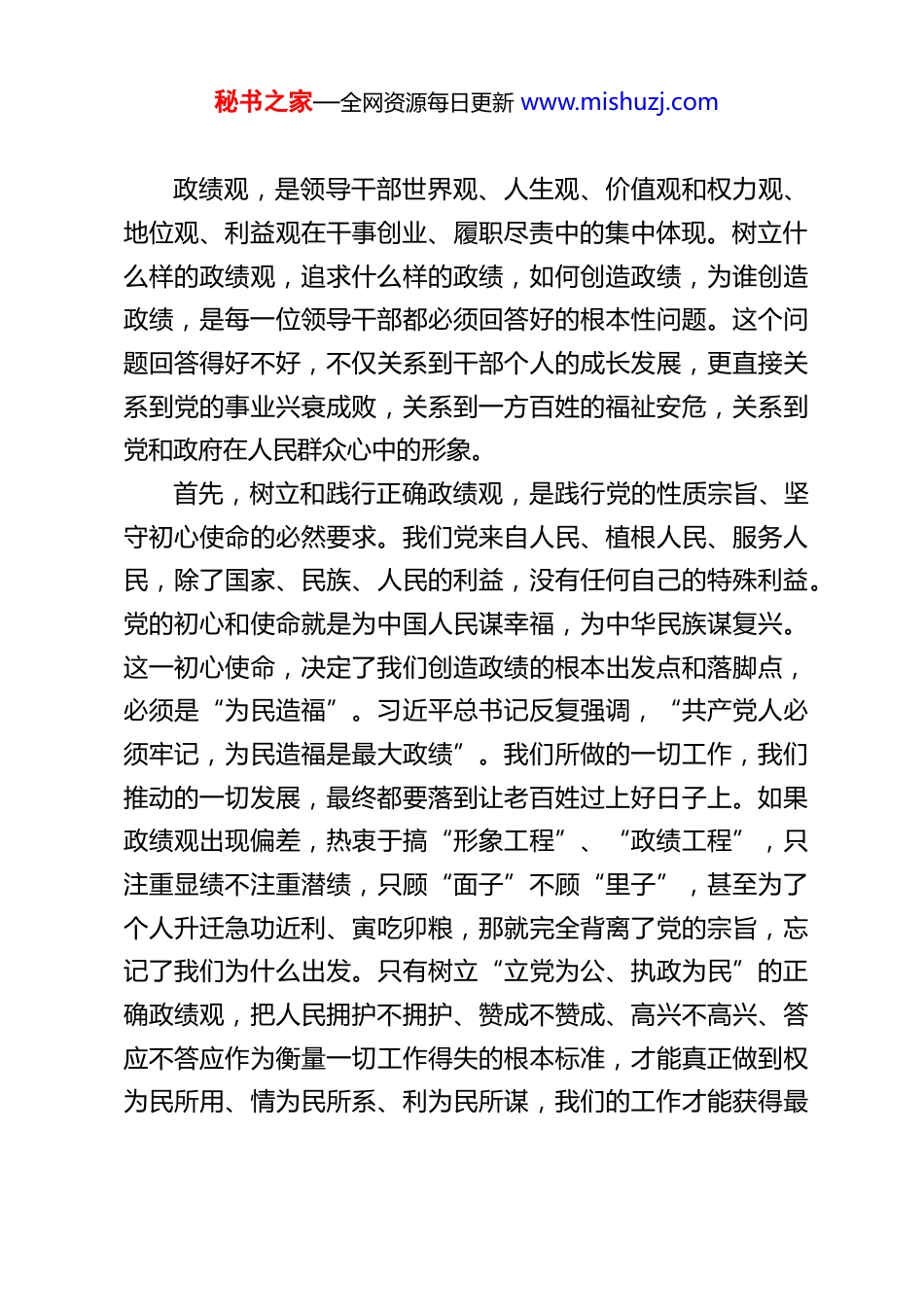 秘书之家—全网资源每日更新 www.mishuzj.com市委书记在市领导干部树立和践行正确政绩观学习教育读书班开班式上的开班动员讲话同志们:今天,我们在这里举办全市领导干部树立和践行正确政绩观学习教育读书班,主要目的是利用两天时间,让大家暂时从繁忙的事务性工作中抽出身来,静心学习、深入思考、交流研讨,集中、系统、深入地重温、领会、咀嚼习近平总书记关于树立和践行正确政绩观的一系列重要论述和指示要求,进一步统一思想、深化认识、校准偏差、凝聚合力,为推动 XX 高质量发展、谱写中国式现代化 XX 篇章奠定坚实的思想基础和政治保障。这次读书班,是在“十五五”规划开局起步的关键节点,是在我们全力推动转型发展攻坚突破的重要时期,也是在各项任务交织叠加、千头万绪的繁忙阶段举办的,充分体现了市委对这项工作的高度重视,也体现了抓好“关键少数”、以“头雁领航”带动“群雁齐飞”的坚定决心。希望大家珍惜这次难得的学习机会,端正态度、沉心静气,真正学有所思、学有所悟、学有所得。下面,结合个人学习体会和全市工作实际,我讲几点意见与大家共勉。一、提高政治站位,深刻认识树立和践行正确政绩观的极端重要性和现实紧迫性秘书之家—全网资源每日更新 www.mishuzj.com政绩观,是领导干部世界观、人生观、价值观和权力观、地位观、利益观在干事创业、履职尽责中的集中体现。树立什么样的政绩观,追求什么样的政绩,如何创造政绩,为谁创造政绩,是每一位领导干部都必须回答好的根本性问题。这个问题回答得好不好,不仅关系到干部个人的成长发展,更直接关系到党的事业兴衰成败,关系到一方百姓的福祉安危,关系到党和政府在人民群众心中的形象。首先,树立和践行正确政绩观,是践行党的性质宗旨、坚守初心使命的必然要求。我们党来自人民、植根人民、服务人民,除了国家、民族、人民的利益,没有任何自己的特殊利益。党的初心和使命就是为中国人民谋幸福,为中华民族谋复兴。这一初心使命,决定了我们创造政绩的根本出发点和落脚点,必须是“为民造福”。习近平总书记反复强调,“共产党人必须牢记,为民造福是最大政绩”。我们所做的一切工作,我们推动的一切发展,最终都要落到让老百姓过上好日子上。如果政绩观出现偏差,热衷于搞“形象工程”、“政绩工程”,只注重显绩不注重潜绩,只顾“面子”不顾“里子”,甚至为了个人升迁急功近利、寅吃卯粮,那就完全背离了党的宗旨,忘记了我们为什么出发。只有树立“立党为公、执政为民”的正确政绩观,把人民拥护不拥护、赞成不赞成、高兴不高兴、答应不答应作为衡量一切工作得失的根本标准,才能真正做到权为民所用、情为民所系、利为民所谋,我们的工作才能获得最秘书之家—全网资源每日更新 www.mishuzj.com广泛、最深厚、最可靠的群众基础。其次,树立和践行正确政绩观,是推动高质量发展、推进中国式现代化 XX 实践的内在需要。当前,我国经济发展已进入高质量发展阶段。高质量发展,是体现新发展理念的发展,是创新成为第一动力、协调成为内生特点、绿色成为普遍形态、开放成为必由之路、共享成为根本目的的发展。推动高质量发展,是一场涉及发展方式、经济结构、增长动力的深刻变革,不可能一蹴而就,需要保持历史耐心和战略定力,需要多做打基础、利长远、惠民生的工作。如果政绩观不端正,仍然抱着“速度情结”、“规模偏好”,习惯于铺摊子、上项目、搞“数字游戏”,那么发展模式就难以真正转变,结构性问题就会积重难返,生态环境的承载压力就会越来越大,发展的协调性、包容性、可持续性就无法保证。对于 XX 而言,我们正处在转型升级、爬坡过坎的关键时期,传统优势产业面临调整,新动能培育需要时间,历史遗留问题有待化解,民生短板亟待补齐。在这样的发展阶段,尤其需要我们树立符合高质量发展要求的政绩观,把工作的着力点放到推动发展质量变革、效率变革、动力变革上来,放到解决发展不平衡不充分问题上来,坚定不移走生态优先、绿色发展的路子,努力创造经得起实践、人民、历史检验的实绩,为“十五五”乃至更长远的发展蓄积动能、筑牢根基。再次,树立和践行正确政绩观,是...