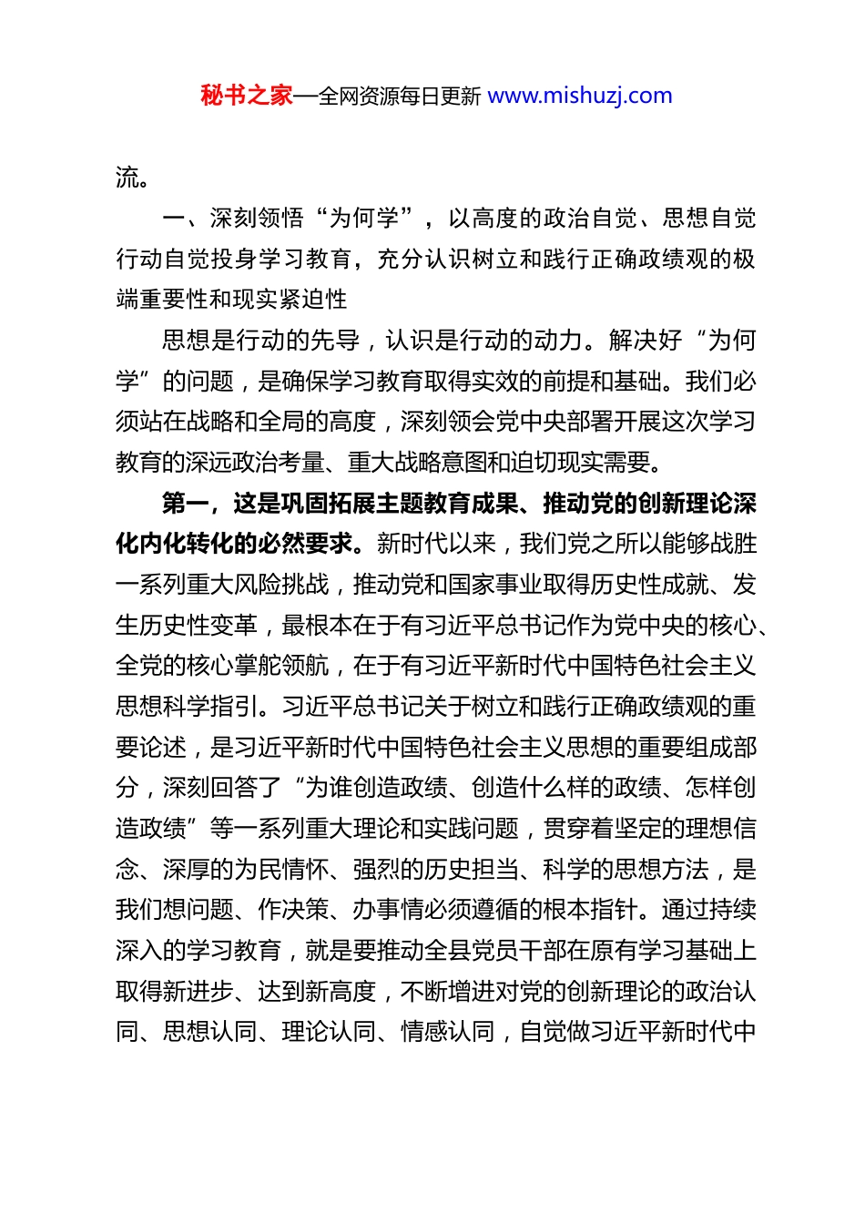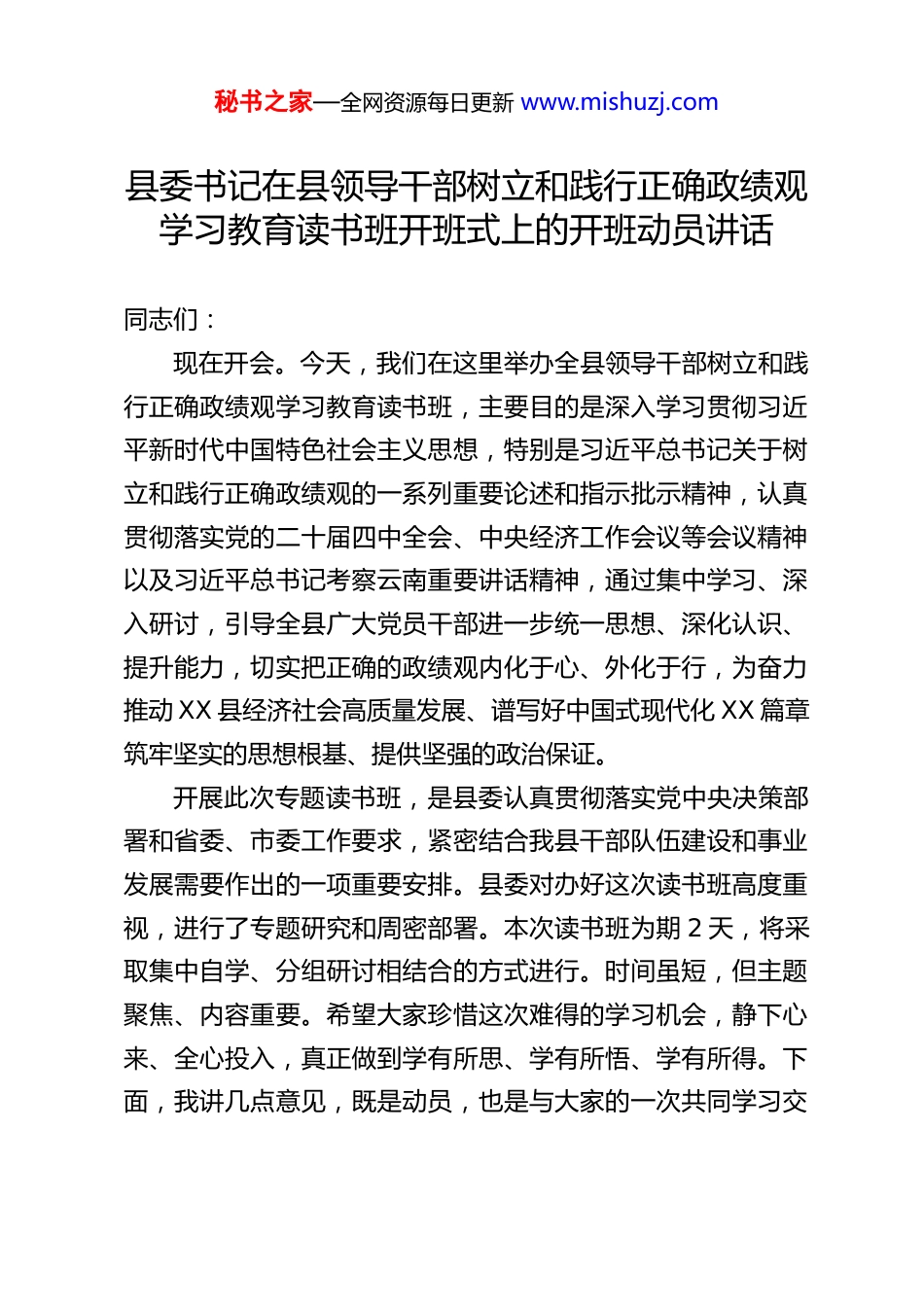 秘书之家—全网资源每日更新 www.mishuzj.com县委书记在县领导干部树立和践行正确政绩观学习教育读书班开班式上的开班动员讲话同志们:现在开会。今天,我们在这里举办全县领导干部树立和践行正确政绩观学习教育读书班,主要目的是深入学习贯彻习近平新时代中国特色社会主义思想,特别是习近平总书记关于树立和践行正确政绩观的一系列重要论述和指示批示精神,认真贯彻落实党的二十届四中全会、中央经济工作会议等会议精神以及习近平总书记考察云南重要讲话精神,通过集中学习、深入研讨,引导全县广大党员干部进一步统一思想、深化认识、提升能力,切实把正确的政绩观内化于心、外化于行,为奋力推动 XX 县经济社会高质量发展、谱写好中国式现代化 XX 篇章筑牢坚实的思想根基、提供坚强的政治保证。开展此次专题读书班,是县委认真贯彻落实党中央决策部署和省委、市委工作要求,紧密结合我县干部队伍建设和事业发展需要作出的一项重要安排。县委对办好这次读书班高度重视,进行了专题研究和周密部署。本次读书班为期 2 天,将采取集中自学、分组研讨相结合的方式进行。时间虽短,但主题聚焦、内容重要。希望大家珍惜这次难得的学习机会,静下心来、全心投入,真正做到学有所思、学有所悟、学有所得。下面,我讲几点意见,既是动员,也是与大家的一次共同学习交秘书之家—全网资源每日更新 www.mishuzj.com流。一、深刻领悟“为何学”,以高度的政治自觉、思想自觉行动自觉投身学习教育,充分认识树立和践行正确政绩观的极端重要性和现实紧迫性思想是行动的先导,认识是行动的动力。解决好“为何学”的问题,是确保学习教育取得实效的前提和基础。我们必须站在战略和全局的高度,深刻领会党中央部署开展这次学习教育的深远政治考量、重大战略意图和迫切现实需要。第一,这是巩固拓展主题教育成果、推动党的创新理论深化内化转化的必然要求。新时代以来,我们党之所以能够战胜一系列重大风险挑战,推动党和国家事业取得历史性成就、发生历史性变革,最根本在于有习近平总书记作为党中央的核心、全党的核心掌舵领航,在于有习近平新时代中国特色社会主义思想科学指引。习近平总书记关于树立和践行正确政绩观的重要论述,是习近平新时代中国特色社会主义思想的重要组成部分,深刻回答了“为谁创造政绩、创造什么样的政绩、怎样创造政绩”等一系列重大理论和实践问题,贯穿着坚定的理想信念、深厚的为民情怀、强烈的历史担当、科学的思想方法,是我们想问题、作决策、办事情必须遵循的根本指针。通过持续深入的学习教育,就是要推动全县党员干部在原有学习基础上取得新进步、达到新高度,不断增进对党的创新理论的政治认同、思想认同、理论认同、情感认同,自觉做习近平新时代中秘书之家—全网资源每日更新 www.mishuzj.com国特色社会主义思想的坚定信仰者和忠实实践者,确保全县各项工作始终沿着正确方向前进。第二,这是适应新形势新任务、推动 XX 县高质量发展行稳致远的迫切需要。当前,世界百年未有之大变局加速演进,我国发展进入战略机遇和风险挑战并存、不确定难预料因素增多的时期。从我县情况看,我们既面临着国家重大战略叠加、产业转型升级、城乡融合发展等一系列重大机遇,也存在着经济总量不大、产业结构不优、创新能力不强、民生领域仍有短板、防范化解风险压力较大等现实挑战。在这样一个爬坡过坎、攻坚克难的关键阶段,干部的精神状态、能力素质和政绩观直接关系到发展的成效与成色。如果政绩观出现偏差,就可能导致发展偏离航向,追求短期效应、忽视长远谋划,热衷“显绩”、冷落“潜绩”,甚至搞劳民伤财的“形象工程”、“政绩工程”,最终损害的是人民群众的利益,贻误的是 XX 县的发展大局。因此,必须通过学习教育,引导广大干部牢固树立符合新发展理念、适应高质量发展要求的正确政绩观,增强推动高质量发展、服务群众、防范化解风险的本领,激发干事创业的精气神,凝聚起攻坚克难、奋勇争先的强大合力。第三,这是加强干部队伍思想政治建设、锻造忠诚干净担当高素质干部队伍的关键举措。政治路线确定之后,干部就是决定的因素。干部的党性修养、...