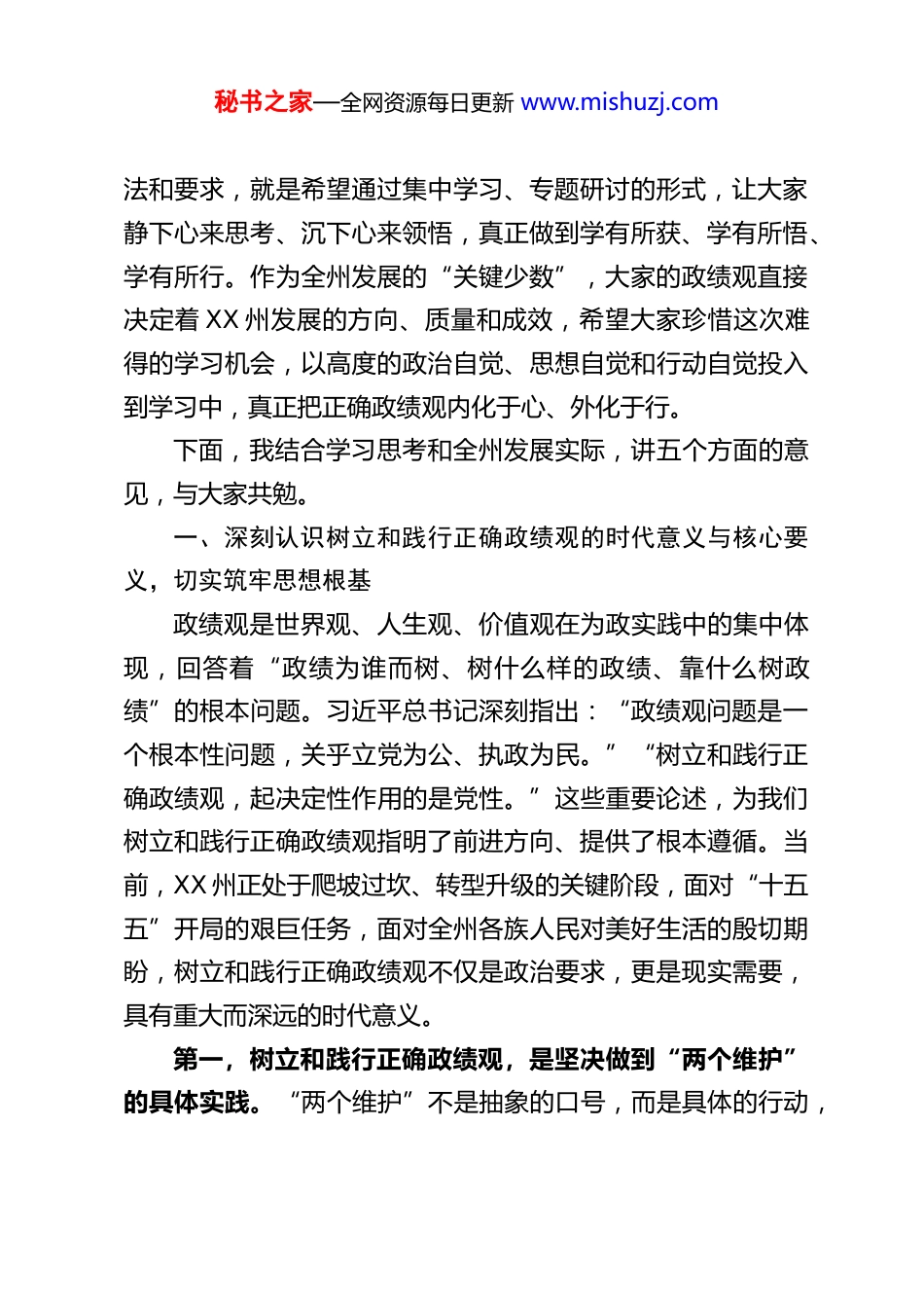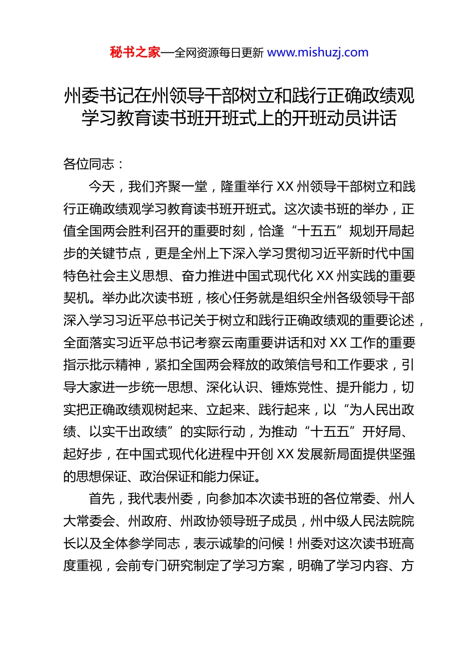 秘书之家—全网资源每日更新 www.mishuzj.com州委书记在州领导干部树立和践行正确政绩观学习教育读书班开班式上的开班动员讲话各位同志:今天,我们齐聚一堂,隆重举行 XX 州领导干部树立和践行正确政绩观学习教育读书班开班式。这次读书班的举办,正值全国两会胜利召开的重要时刻,恰逢“十五五”规划开局起步的关键节点,更是全州上下深入学习贯彻习近平新时代中国特色社会主义思想、奋力推进中国式现代化 XX 州实践的重要契机。举办此次读书班,核心任务就是组织全州各级领导干部深入学习习近平总书记关于树立和践行正确政绩观的重要论述,全面落实习近平总书记考察云南重要讲话和对 XX 工作的重要指示批示精神,紧扣全国两会释放的政策信号和工作要求,引导大家进一步统一思想、深化认识、锤炼党性、提升能力,切实把正确政绩观树起来、立起来、践行起来,以“为人民出政绩、以实干出政绩”的实际行动,为推动“十五五”开好局、起好步,在中国式现代化进程中开创 XX 发展新局面提供坚强的思想保证、政治保证和能力保证。首先,我代表州委,向参加本次读书班的各位常委、州人大常委会、州政府、州政协领导班子成员,州中级人民法院院长以及全体参学同志,表示诚挚的问候!州委对这次读书班高度重视,会前专门研究制定了学习方案,明确了学习内容、方秘书之家—全网资源每日更新 www.mishuzj.com法和要求,就是希望通过集中学习、专题研讨的形式,让大家静下心来思考、沉下心来领悟,真正做到学有所获、学有所悟、学有所行。作为全州发展的“关键少数”,大家的政绩观直接决定着 XX 州发展的方向、质量和成效,希望大家珍惜这次难得的学习机会,以高度的政治自觉、思想自觉和行动自觉投入到学习中,真正把正确政绩观内化于心、外化于行。下面,我结合学习思考和全州发展实际,讲五个方面的意见,与大家共勉。一、深刻认识树立和践行正确政绩观的时代意义与核心要义,切实筑牢思想根基政绩观是世界观、人生观、价值观在为政实践中的集中体现,回答着“政绩为谁而树、树什么样的政绩、靠什么树政绩”的根本问题。习近平总书记深刻指出:“政绩观问题是一个根本性问题,关乎立党为公、执政为民。”“树立和践行正确政绩观,起决定性作用的是党性。”这些重要论述,为我们树立和践行正确政绩观指明了前进方向、提供了根本遵循。当前,XX 州正处于爬坡过坎、转型升级的关键阶段,面对“十五五”开局的艰巨任务,面对全州各族人民对美好生活的殷切期盼,树立和践行正确政绩观不仅是政治要求,更是现实需要,具有重大而深远的时代意义。第一,树立和践行正确政绩观,是坚决做到“两个维护”的具体实践。“两个维护”不是抽象的口号,而是具体的行动,秘书之家—全网资源每日更新 www.mishuzj.com体现在每一项决策、每一次部署、每一份实绩中。习近平总书记关于正确政绩观的重要论述,是习近平新时代中国特色社会主义思想的重要组成部分,是我们做好一切工作的思想指南。全州各级领导干部树立和践行正确政绩观,就是要把学习贯彻总书记重要论述与考察云南重要讲话、对 XX 工作的重要指示批示精神结合起来,始终在思想上政治上行动上同以习近平同志为核心的党中央保持高度一致,始终做到党中央提倡的坚决响应、党中央决定的坚决执行、党中央禁止的坚决不做,确保XX 州的发展始终沿着总书记指引的方向前进。这既是政治纪律,也是政治规矩,更是检验我们政治判断力、政治领悟力、政治执行力的重要标尺。第二,树立和践行正确政绩观,是推动 XX 州高质量发展、奋进中国式现代化的迫切需要。“十五五”时期是我国全面建设社会主义现代化国家的关键时期,也是 XX 州补齐发展短板、厚植发展优势、实现高质量发展的黄金时期。当前,XX 州的发展既面临着全国两会释放的政策机遇、云南建设“三个定位”的战略机遇,也面临着产业结构不优、发展动能不足、民生短板突出、边疆治理任务繁重等现实挑战。解决这些问题,推动高质量发展,迫切需要我们树立正确的政绩观。如果政绩观出现偏差,搞急功近利、弄虚作假的“形象工程”“政绩工程”,不仅会贻误发展时机,还会给全州发展...