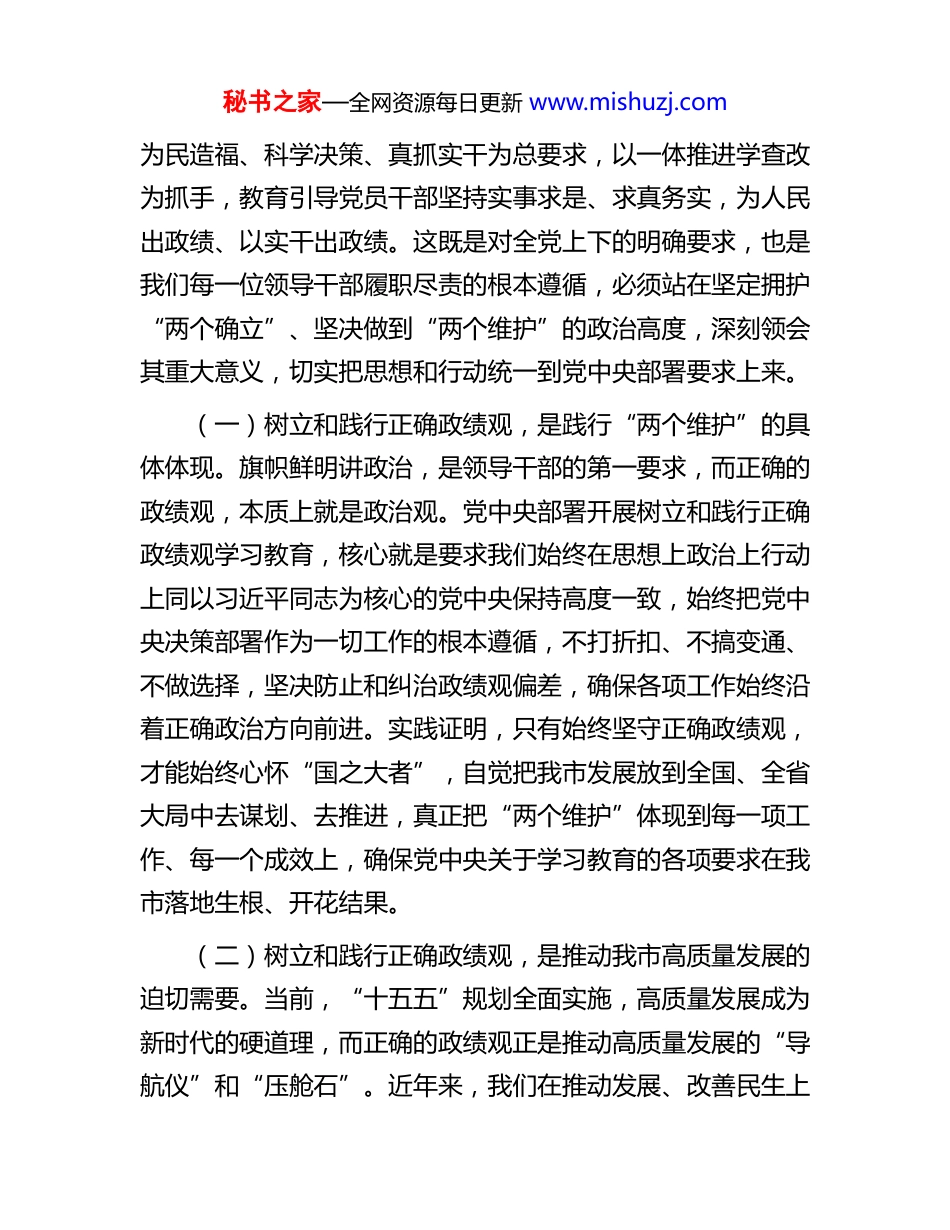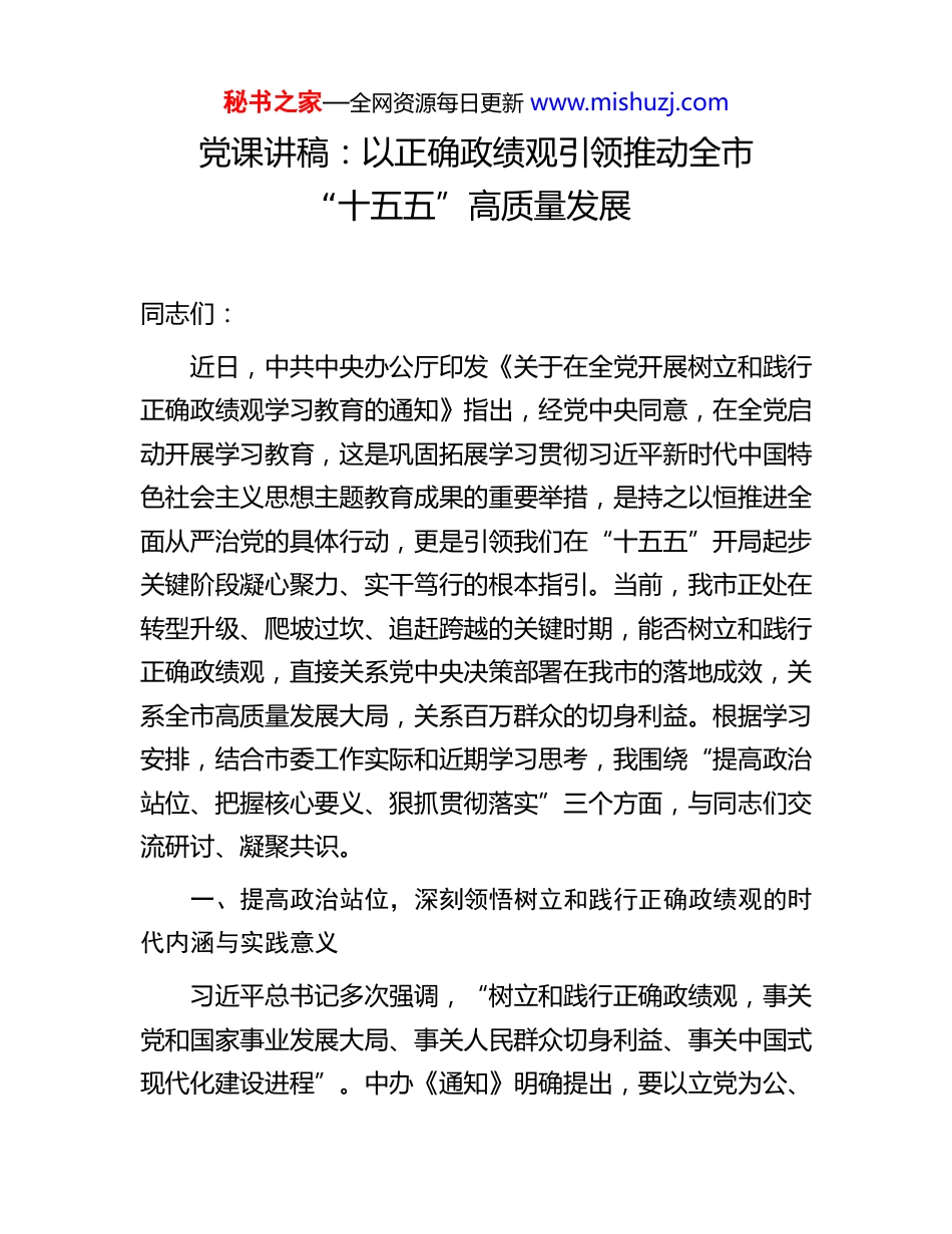秘书之家—全网资源每日更新 www.mishuzj.com党课讲稿:以正确政绩观引领推动全市“十五五”高质量发展同志们:近日,中共中央办公厅印发《关于在全党开展树立和践行正确政绩观学习教育的通知》指出,经党中央同意,在全党启动开展学习教育,这是巩固拓展学习贯彻习近平新时代中国特色社会主义思想主题教育成果的重要举措,是持之以恒推进全面从严治党的具体行动,更是引领我们在“十五五”开局起步关键阶段凝心聚力、实干笃行的根本指引。当前,我市正处在转型升级、爬坡过坎、追赶跨越的关键时期,能否树立和践行正确政绩观,直接关系党中央决策部署在我市的落地成效,关系全市高质量发展大局,关系百万群众的切身利益。根据学习安排,结合市委工作实际和近期学习思考,我围绕“提高政治站位、把握核心要义、狠抓贯彻落实”三个方面,与同志们交流研讨、凝聚共识。一、提高政治站位,深刻领悟树立和践行正确政绩观的时代内涵与实践意义习近平总书记多次强调,“树立和践行正确政绩观,事关党和国家事业发展大局、事关人民群众切身利益、事关中国式现代化建设进程”。中办《通知》明确提出,要以立党为公、秘书之家—全网资源每日更新 www.mishuzj.com为民造福、科学决策、真抓实干为总要求,以一体推进学查改为抓手,教育引导党员干部坚持实事求是、求真务实,为人民出政绩、以实干出政绩。这既是对全党上下的明确要求,也是我们每一位领导干部履职尽责的根本遵循,必须站在坚定拥护“两个确立”、坚决做到“两个维护”的政治高度,深刻领会其重大意义,切实把思想和行动统一到党中央部署要求上来。(一)树立和践行正确政绩观,是践行“两个维护”的具体体现。旗帜鲜明讲政治,是领导干部的第一要求,而正确的政绩观,本质上就是政治观。党中央部署开展树立和践行正确政绩观学习教育,核心就是要求我们始终在思想上政治上行动上同以习近平同志为核心的党中央保持高度一致,始终把党中央决策部署作为一切工作的根本遵循,不打折扣、不搞变通、不做选择,坚决防止和纠治政绩观偏差,确保各项工作始终沿着正确政治方向前进。实践证明,只有始终坚守正确政绩观,才能始终心怀“国之大者”,自觉把我市发展放到全国、全省大局中去谋划、去推进,真正把“两个维护”体现到每一项工作、每一个成效上,确保党中央关于学习教育的各项要求在我市落地生根、开花结果。(二)树立和践行正确政绩观,是推动我市高质量发展的迫切需要。当前,“十五五”规划全面实施,高质量发展成为新时代的硬道理,而正确的政绩观正是推动高质量发展的“导航仪”和“压舱石”。近年来,我们在推动发展、改善民生上秘书之家—全网资源每日更新 www.mishuzj.com取得了一定成效,但也要清醒看到,一些干部身上还存在政绩观偏差的苗头性、倾向性问题:有的急功近利、急于求成,热衷于搞“形象工程”“面子工程”,忽视打基础、利长远的工作;有的重数字、轻实效,搞“数字注水”“虚假政绩”,看似热闹红火,实则没有真正惠及群众;有的重发展、轻民生,片面追求经济指标,对群众急难愁盼问题回应不及时、解决不到位;有的重部署、轻落实,“只留痕不留绩”“只表态不行动”,导致一些好政策、好举措流于形式。这些问题,不仅影响了我市发展质效,更损害了党同人民群众的血肉联系。越是任务艰巨、挑战严峻,我们越要树立和践行正确政绩观,以功成不必在我、功成必定有我的境界,多做打基础、利长远、惠民生的实事,推动我市高质量发展行稳致远。(三)树立和践行正确政绩观,是践行初心使命、厚植为民情怀的必然要求。中办《通知》强调,要坚持民生为大,为群众多办实事,让群众可感可及。习近平总书记深刻指出,“为民造福是最大政绩”,这深刻回答了“为谁树政绩”的根本问题,彰显了共产党人的初心和使命。我们党的一切工作,都是为了实现好、维护好、发展好最广大人民的根本利益,政绩好不好,不是看汇报材料厚不厚、数字指标高不高,关键要看群众脸上的笑容多不多、实际获得感强不强。作为市委领导班子成员,作为全市发展的“领头雁”,我们必须始终牢记初心使命,把群众满意作为衡量政绩的最高标准,坚...