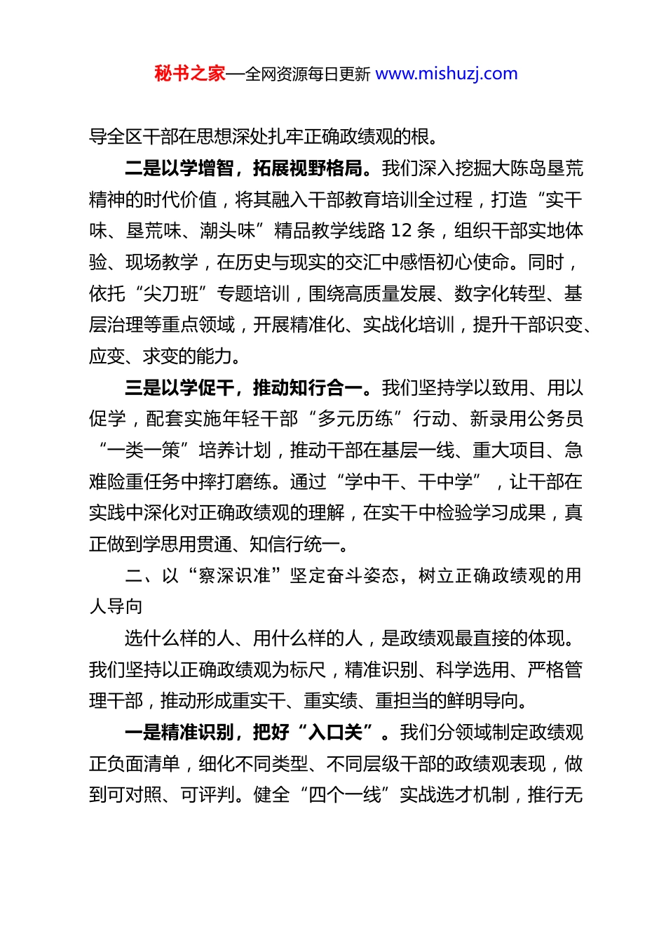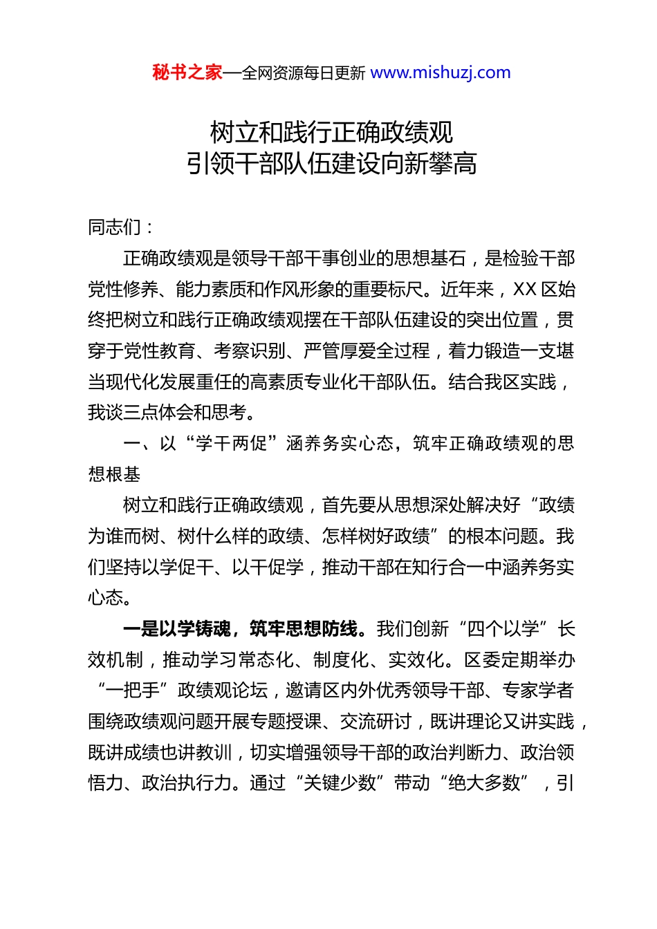 秘书之家—全网资源每日更新 www.mishuzj.com树立和践行正确政绩观引领干部队伍建设向新攀高同志们:正确政绩观是领导干部干事创业的思想基石,是检验干部党性修养、能力素质和作风形象的重要标尺。近年来,XX 区始终把树立和践行正确政绩观摆在干部队伍建设的突出位置,贯穿于党性教育、考察识别、严管厚爱全过程,着力锻造一支堪当现代化发展重任的高素质专业化干部队伍。结合我区实践,我谈三点体会和思考。一、以“学干两促”涵养务实心态,筑牢正确政绩观的思想根基树立和践行正确政绩观,首先要从思想深处解决好“政绩为谁而树、树什么样的政绩、怎样树好政绩”的根本问题。我们坚持以学促干、以干促学,推动干部在知行合一中涵养务实心态。一是以学铸魂,筑牢思想防线。我们创新“四个以学”长效机制,推动学习常态化、制度化、实效化。区委定期举办“一把手”政绩观论坛,邀请区内外优秀领导干部、专家学者围绕政绩观问题开展专题授课、交流研讨,既讲理论又讲实践,既讲成绩也讲教训,切实增强领导干部的政治判断力、政治领悟力、政治执行力。通过“关键少数”带动“绝大多数”,引秘书之家—全网资源每日更新 www.mishuzj.com导全区干部在思想深处扎牢正确政绩观的根。二是以学增智,拓展视野格局。我们深入挖掘大陈岛垦荒精神的时代价值,将其融入干部教育培训全过程,打造“实干味、垦荒味、潮头味”精品教学线路 12 条,组织干部实地体验、现场教学,在历史与现实的交汇中感悟初心使命。同时,依托“尖刀班”专题培训,围绕高质量发展、数字化转型、基层治理等重点领域,开展精准化、实战化培训,提升干部识变、应变、求变的能力。三是以学促干,推动知行合一。我们坚持学以致用、用以促学,配套实施年轻干部“多元历练”行动、新录用公务员“一类一策”培养计划,推动干部在基层一线、重大项目、急难险重任务中摔打磨练。通过“学中干、干中学”,让干部在实践中深化对正确政绩观的理解,在实干中检验学习成果,真正做到学思用贯通、知信行统一。二、以“察深识准”坚定奋斗姿态,树立正确政绩观的用人导向选什么样的人、用什么样的人,是政绩观最直接的体现。我们坚持以正确政绩观为标尺,精准识别、科学选用、严格管理干部,推动形成重实干、重实绩、重担当的鲜明导向。一是精准识别,把好“入口关”。我们分领域制定政绩观正负面清单,细化不同类型、不同层级干部的政绩观表现,做到可对照、可评判。健全“四个一线”实战选才机制,推行无秘书之家—全网资源每日更新 www.mishuzj.com任用考察,把干部放在改革发展稳定一线、项目建设一线、服务群众一线、急难险重任务一线进行常态化跟踪了解。做实“应用场景+专项调研”经常性考察,动态掌握干部日常表现和关键时刻表现,确保选准人、用对人。二是科学考核,用好“指挥棒”。我们充分发挥考核的导向作用,优化高质量发展政绩考核办法,量体裁衣设置差异化考核重点和权重,引导干部根据岗位职责和发展需要,明确“干什么、怎么干”。在考核中,既看显绩也看潜绩,既看当前也看长远,既看发展成效也看群众口碑,推动干部把心思和精力用在打基础、利长远、惠民生的实事上。三是长效追溯,守好“责任田”。我们深化潜绩追溯工作机制,严格执行离任交接“一单一书”制度,要求领导干部在离任前全面梳理任期内重点工作、未完成事项、潜在风险等,形成交接清单和责任书,做到“交得清楚、接得明白”。通过追溯机制,倒逼干部在任时履职尽责、善始善终,防止“拍脑袋决策、拍胸脯承诺、拍屁股走人”的现象发生。三、以“组织担当”激发昂扬状态,营造正确政绩观的干事氛围“十五五”规划战略事关全局和长远,战略主动才能赢得发展主动,而战略主动的关键取决于干部敢不敢拼、善不善闯。我们坚持以组织担当激发干部担当,为敢干事、能干事、干成事的干部撑腰鼓劲。秘书之家—全网资源每日更新 www.mishuzj.com一是鲜明用人导向,激励担当作为。我们健全“三看、三破、三到”选任干部机制,即看政治素质、看工作实绩、看群众口碑,破除论资排辈、平衡照顾、隐性台阶,到一线发现干部、到现场识别干部、到群众中了解...