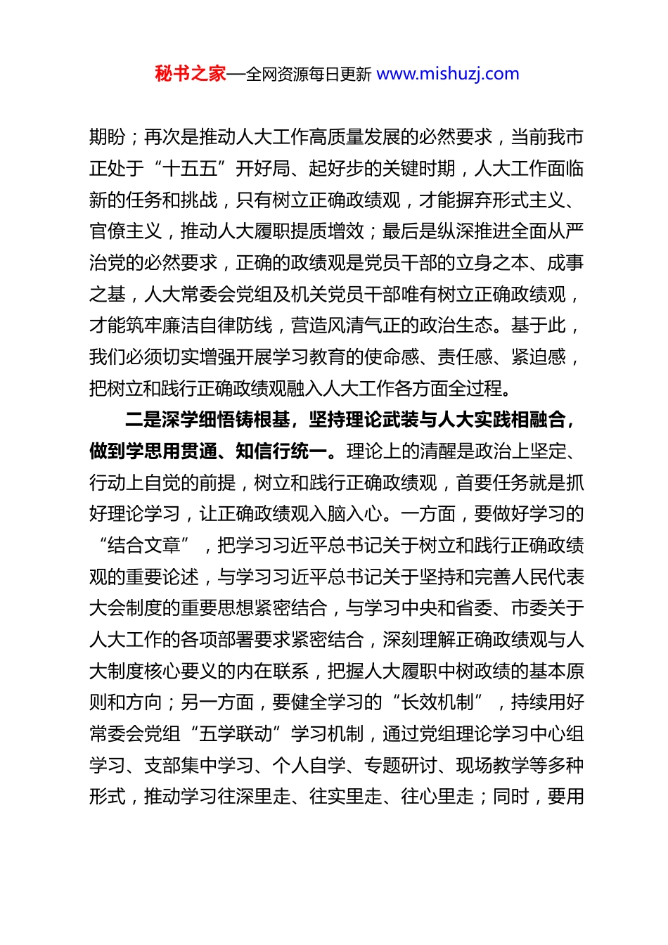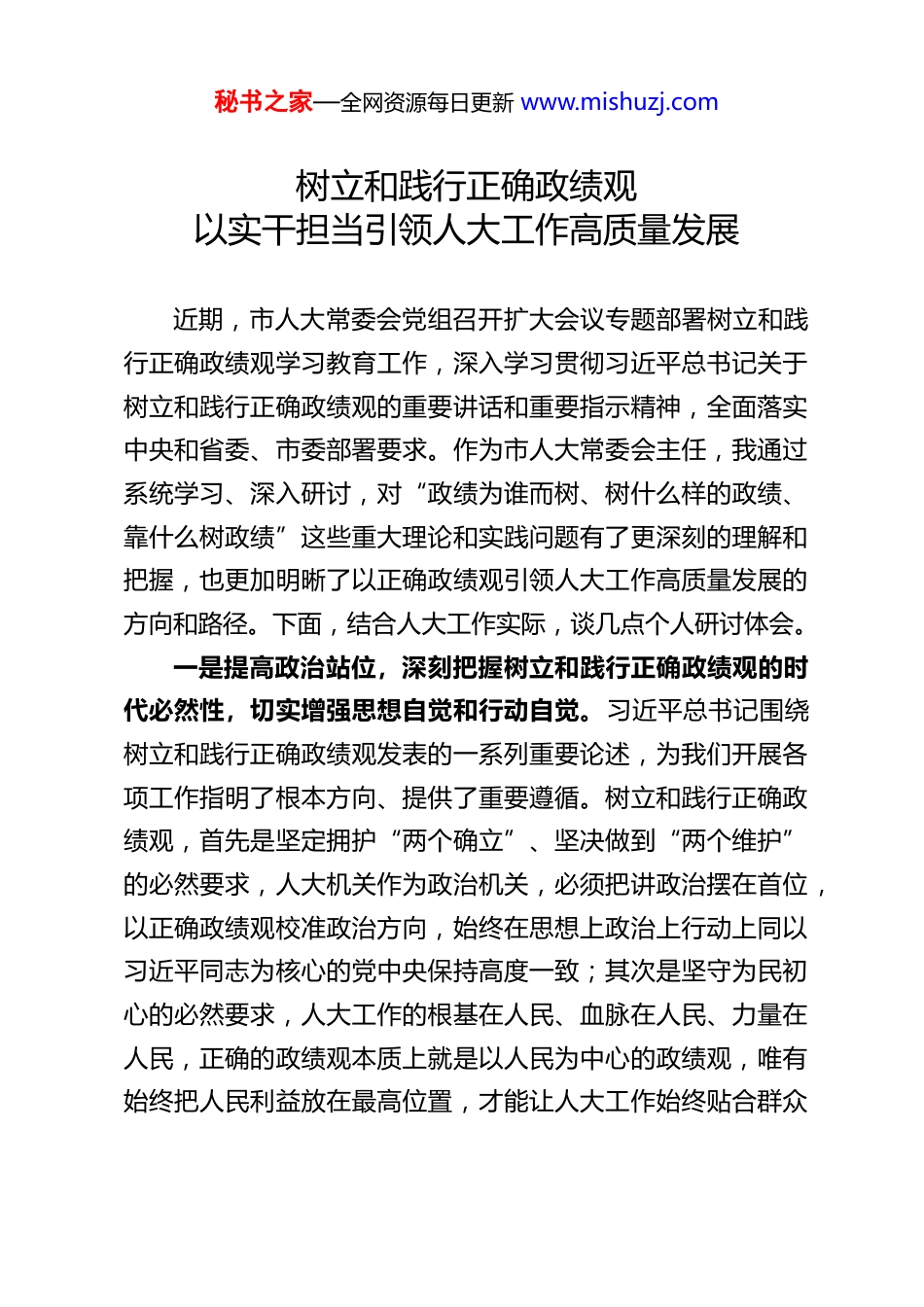 秘书之家—全网资源每日更新 www.mishuzj.com树立和践行正确政绩观以实干担当引领人大工作高质量发展近期,市人大常委会党组召开扩大会议专题部署树立和践行正确政绩观学习教育工作,深入学习贯彻习近平总书记关于树立和践行正确政绩观的重要讲话和重要指示精神,全面落实中央和省委、市委部署要求。作为市人大常委会主任,我通过系统学习、深入研讨,对“政绩为谁而树、树什么样的政绩、靠什么树政绩”这些重大理论和实践问题有了更深刻的理解和把握,也更加明晰了以正确政绩观引领人大工作高质量发展的方向和路径。下面,结合人大工作实际,谈几点个人研讨体会。一是提高政治站位,深刻把握树立和践行正确政绩观的时代必然性,切实增强思想自觉和行动自觉。习近平总书记围绕树立和践行正确政绩观发表的一系列重要论述,为我们开展各项工作指明了根本方向、提供了重要遵循。树立和践行正确政绩观,首先是坚定拥护“两个确立”、坚决做到“两个维护”的必然要求,人大机关作为政治机关,必须把讲政治摆在首位,以正确政绩观校准政治方向,始终在思想上政治上行动上同以习近平同志为核心的党中央保持高度一致;其次是坚守为民初心的必然要求,人大工作的根基在人民、血脉在人民、力量在人民,正确的政绩观本质上就是以人民为中心的政绩观,唯有始终把人民利益放在最高位置,才能让人大工作始终贴合群众秘书之家—全网资源每日更新 www.mishuzj.com期盼;再次是推动人大工作高质量发展的必然要求,当前我市正处于“十五五”开好局、起好步的关键时期,人大工作面临新的任务和挑战,只有树立正确政绩观,才能摒弃形式主义、官僚主义,推动人大履职提质增效;最后是纵深推进全面从严治党的必然要求,正确的政绩观是党员干部的立身之本、成事之基,人大常委会党组及机关党员干部唯有树立正确政绩观,才能筑牢廉洁自律防线,营造风清气正的政治生态。基于此,我们必须切实增强开展学习教育的使命感、责任感、紧迫感,把树立和践行正确政绩观融入人大工作各方面全过程。二是深学细悟铸根基,坚持理论武装与人大实践相融合,做到学思用贯通、知信行统一。理论上的清醒是政治上坚定、行动上自觉的前提,树立和践行正确政绩观,首要任务就是抓好理论学习,让正确政绩观入脑入心。一方面,要做好学习的“结合文章”,把学习习近平总书记关于树立和践行正确政绩观的重要论述,与学习习近平总书记关于坚持和完善人民代表大会制度的重要思想紧密结合,与学习中央和省委、市委关于人大工作的各项部署要求紧密结合,深刻理解正确政绩观与人大制度核心要义的内在联系,把握人大履职中树政绩的基本原则和方向;另一方面,要健全学习的“长效机制”,持续用好常委会党组“五学联动”学习机制,通过党组理论学习中心组学习、支部集中学习、个人自学、专题研讨、现场教学等多种形式,推动学习往深里走、往实里走、往心里走;同时,要用秘书之家—全网资源每日更新 www.mishuzj.com好学习的“鲜活教材”,以正反典型案例为镜鉴,从先进典型中学习树立正确政绩观、真抓实干的好经验好做法,从反面案例中汲取急功近利、虚假政绩的深刻教训,引导机关党员干部明辨是非、校准偏差,切实把学习成果转化为树立正确政绩观的思想根基,转化为做好人大工作的实际能力。三是深查实改补短板,坚持问题导向与长效建设相衔接,推动学习教育走深走实。树立和践行正确政绩观,不能停留在理论学习层面,必须坚持问题导向,把学查改有机融合,以查促改、以改促干。首先,要广开言路找准问题,对照中央和省委、市委部署要求,结合人大履职实际,通过座谈交流、调研走访、书面征求等多种方式,广泛听取人大代表、基层群众、基层人大的意见建议,重点查摆在树立正确政绩观方面存在的思想认识偏差、履职担当不足、工作作风不实等问题,做到把问题找准、找实、找具体,不回避、不遮掩;其次,要精准施策整改问题,针对查摆出的问题,建立问题清单、责任清单、整改清单,明确整改时限、整改措施、责任人员,实行挂图作战、销号管理,对能立即整改的立行立改,对需要长期整改的持续用力、久久为功,确保整改工作不走过场、取得...