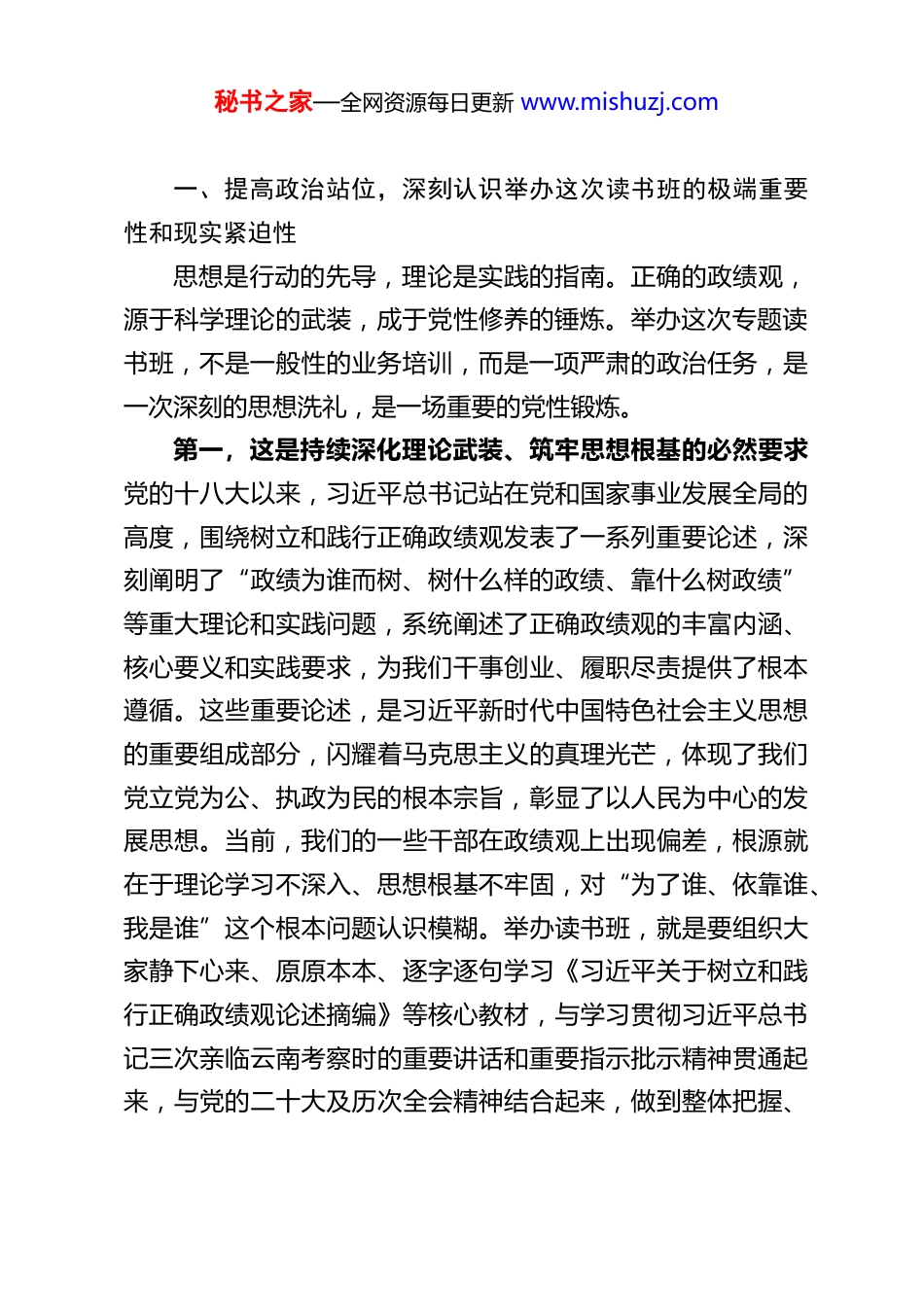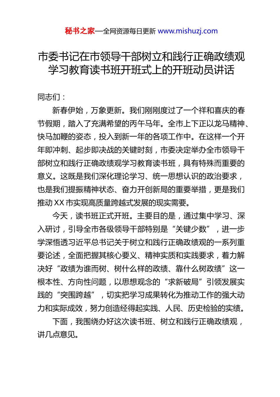 秘书之家—全网资源每日更新 www.mishuzj.com市委书记在市领导干部树立和践行正确政绩观学习教育读书班开班式上的开班动员讲话同志们:新春伊始,万象更新。我们刚刚度过了一个祥和喜庆的春节假期,踏入了充满希望的丙午马年。全市上下正以龙马精神、快马加鞭的姿态,投入到新一年的各项工作中。在这样一个开年即冲刺、起步即决战的关键时刻,市委决定举办全市领导干部树立和践行正确政绩观学习教育读书班,具有特殊而重要的意义。这既是我们深化理论学习、统一思想认识的政治要求,也是我们提振精神状态、奋力开创新局的重要举措,更是我们推动 XX 市实现高质量跨越式发展的现实需要。今天,读书班正式开班。主要目的是,通过集中学习、深入研讨,引导全市各级领导干部特别是“关键少数”,进一步学深悟透习近平总书记关于树立和践行正确政绩观的一系列重要论述,全面把握其核心要义、精神实质和实践要求,着力解决好“政绩为谁而树、树什么样的政绩、靠什么树政绩”这一根本性、方向性问题,以思想观念的“求新破局”引领发展实践的“突围跨越”,切实把学习成果转化为推动工作的强大动力和实际成效,努力创造经得起实践、人民、历史检验的实绩。下面,我围绕办好这次读书班、树立和践行正确政绩观,讲几点意见。秘书之家—全网资源每日更新 www.mishuzj.com一、提高政治站位,深刻认识举办这次读书班的极端重要性和现实紧迫性思想是行动的先导,理论是实践的指南。正确的政绩观,源于科学理论的武装,成于党性修养的锤炼。举办这次专题读书班,不是一般性的业务培训,而是一项严肃的政治任务,是一次深刻的思想洗礼,是一场重要的党性锻炼。第一,这是持续深化理论武装、筑牢思想根基的必然要求党的十八大以来,习近平总书记站在党和国家事业发展全局的高度,围绕树立和践行正确政绩观发表了一系列重要论述,深刻阐明了“政绩为谁而树、树什么样的政绩、靠什么树政绩”等重大理论和实践问题,系统阐述了正确政绩观的丰富内涵、核心要义和实践要求,为我们干事创业、履职尽责提供了根本遵循。这些重要论述,是习近平新时代中国特色社会主义思想的重要组成部分,闪耀着马克思主义的真理光芒,体现了我们党立党为公、执政为民的根本宗旨,彰显了以人民为中心的发展思想。当前,我们的一些干部在政绩观上出现偏差,根源就在于理论学习不深入、思想根基不牢固,对“为了谁、依靠谁、我是谁”这个根本问题认识模糊。举办读书班,就是要组织大家静下心来、原原本本、逐字逐句学习《习近平关于树立和践行正确政绩观论述摘编》等核心教材,与学习贯彻习近平总书记三次亲临云南考察时的重要讲话和重要指示批示精神贯通起来,与党的二十大及历次全会精神结合起来,做到整体把握、秘书之家—全网资源每日更新 www.mishuzj.com融会贯通。通过系统深入的学习,从党的创新理论中悟规律、明方向、学方法、增智慧,真正搞清楚什么是党和人民需要的好事实事,什么是符合新发展理念、推动高质量发展的事,从而在思想深处扎下正确政绩观的根子,不断增强树立和践行正确政绩观的政治自觉、思想自觉、行动自觉。第二,这是推动高质量发展、奋力实现跨越的迫切需要。当前,XX 市正处在转型升级、爬坡过坎的关键时期,既面临国家重大战略叠加、政策红利释放等难得机遇,也面临区域竞争加剧、自身发展不平衡不充分等严峻挑战。推动高质量跨越式发展,是我们必须扛起的政治责任和发展使命。而高质量发展,必须是体现正确政绩观的发展。如果政绩观出现偏差,发展就容易走偏,甚至可能陷入“形象工程”“政绩工程”的泥潭,或者患上“换挡焦虑”,追求脱离实际的盲目攀比和速度情结,最终损害的是发展根基和群众利益。我们要实现的发展,是创新成为第一动力、协调成为内生特点、绿色成为普遍形态、开放成为必由之路、共享成为根本目的的发展。这要求我们必须牢固树立符合新发展理念的政绩观,把注意力集中到解决发展不平衡不充分问题上来,集中到提升发展质量和效益上来。举办这次读书班,就是要引导大家从思想根源上纠偏正向,自觉把新发展理念作为“指挥棒”“红绿灯”,贯穿到经济社会发展的全过程...