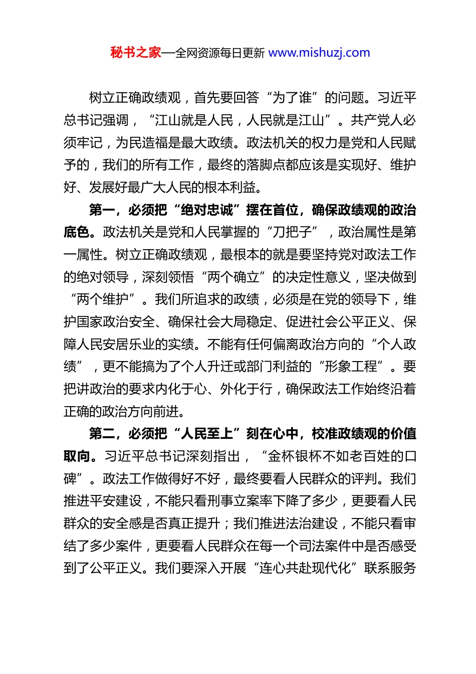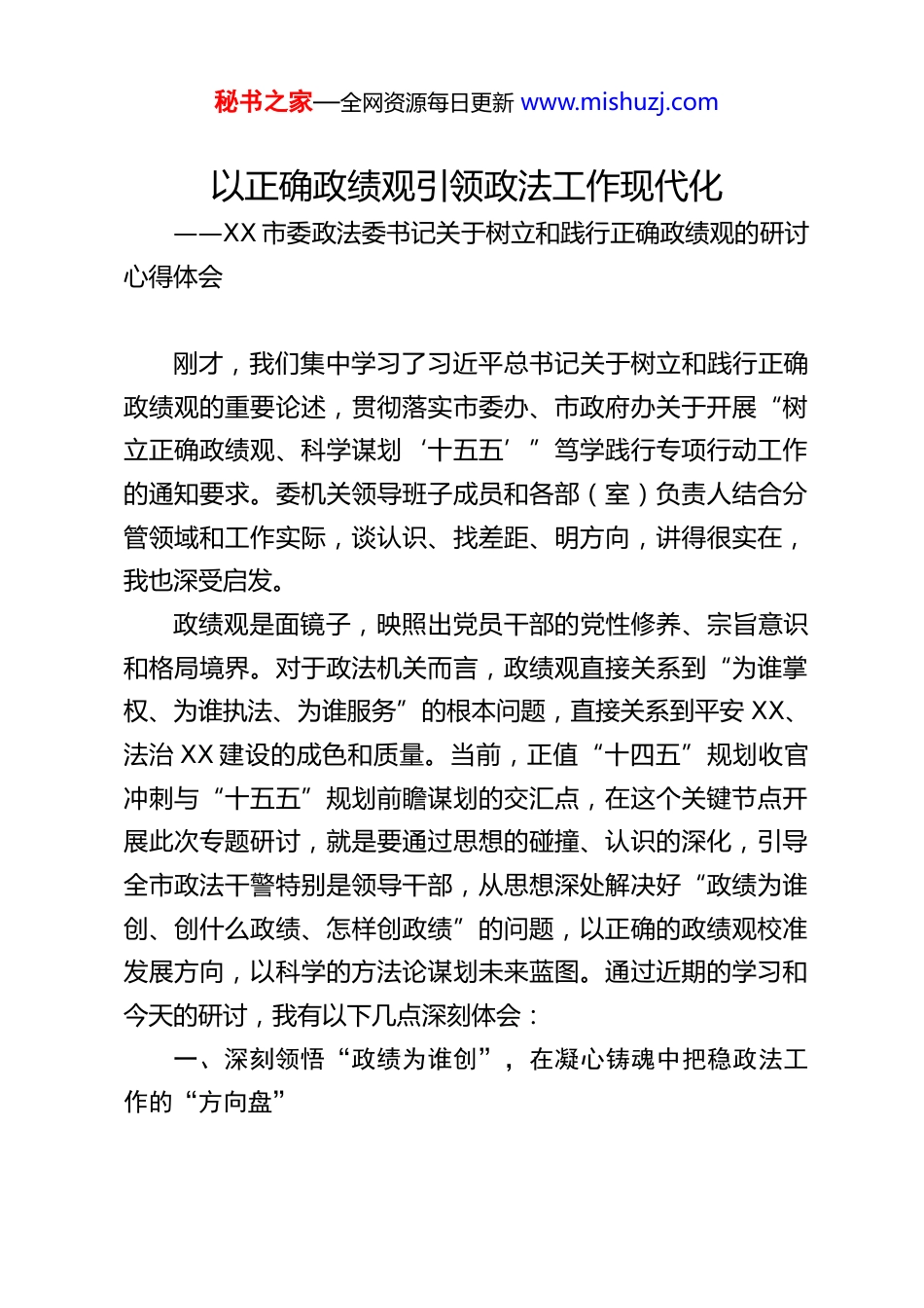 秘书之家—全网资源每日更新 www.mishuzj.com以正确政绩观引领政法工作现代化——XX 市委政法委书记关于树立和践行正确政绩观的研讨心得体会刚才,我们集中学习了习近平总书记关于树立和践行正确政绩观的重要论述,贯彻落实市委办、市政府办关于开展“树立正确政绩观、科学谋划‘十五五’”笃学践行专项行动工作的通知要求。委机关领导班子成员和各部(室)负责人结合分管领域和工作实际,谈认识、找差距、明方向,讲得很实在,我也深受启发。政绩观是面镜子,映照出党员干部的党性修养、宗旨意识和格局境界。对于政法机关而言,政绩观直接关系到“为谁掌权、为谁执法、为谁服务”的根本问题,直接关系到平安 XX、法治 XX 建设的成色和质量。当前,正值“十四五”规划收官冲刺与“十五五”规划前瞻谋划的交汇点,在这个关键节点开展此次专题研讨,就是要通过思想的碰撞、认识的深化,引导全市政法干警特别是领导干部,从思想深处解决好“政绩为谁创、创什么政绩、怎样创政绩”的问题,以正确的政绩观校准发展方向,以科学的方法论谋划未来蓝图。通过近期的学习和今天的研讨,我有以下几点深刻体会:一、深刻领悟“政绩为谁创”,在凝心铸魂中把稳政法工作的“方向盘”秘书之家—全网资源每日更新 www.mishuzj.com树立正确政绩观,首先要回答“为了谁”的问题。习近平总书记强调,“江山就是人民,人民就是江山”。共产党人必须牢记,为民造福是最大政绩。政法机关的权力是党和人民赋予的,我们的所有工作,最终的落脚点都应该是实现好、维护好、发展好最广大人民的根本利益。第一,必须把“绝对忠诚”摆在首位,确保政绩观的政治底色。政法机关是党和人民掌握的“刀把子”,政治属性是第一属性。树立正确政绩观,最根本的就是要坚持党对政法工作的绝对领导,深刻领悟“两个确立”的决定性意义,坚决做到“两个维护”。我们所追求的政绩,必须是在党的领导下,维护国家政治安全、确保社会大局稳定、促进社会公平正义、保障人民安居乐业的实绩。不能有任何偏离政治方向的“个人政绩”,更不能搞为了个人升迁或部门利益的“形象工程”。要把讲政治的要求内化于心、外化于行,确保政法工作始终沿着正确的政治方向前进。第二,必须把“人民至上”刻在心中,校准政绩观的价值取向。习近平总书记深刻指出,“金杯银杯不如老百姓的口碑”。政法工作做得好不好,最终要看人民群众的评判。我们推进平安建设,不能只看刑事立案率下降了多少,更要看人民群众的安全感是否真正提升;我们推进法治建设,不能只看审结了多少案件,更要看人民群众在每一个司法案件中是否感受到了公平正义。我们要深入开展“连心共赴现代化”联系服务秘书之家—全网资源每日更新 www.mishuzj.com群众工作,放下架子、扑下身子,深入基层、深入群众,特别是要关注那些涉及到群众切身利益的“急难愁盼”问题。比如,在矛盾纠纷化解中,是简单“压下去”还是真正“解开了”?在执法司法过程中,是冷硬横推还是释法明理、温情执法?这些都直接关系到人民群众的获得感、幸福感、安全感。只有始终站在人民立场上想问题、作决策、办事情,我们的政绩才能真正得到人民认可。第三,必须把“初心使命”融入血脉,强化政绩观的责任担当。为中国人民谋幸福,为中华民族谋复兴,是中国共产党人的初心和使命。具体到政法工作,就是要把“维护稳定、促进发展、守护正义”作为我们这一代政法人义不容辞的责任。不能有“躺平”心态,满足于过得去、不出事,更要有“功成不必在我、功成必定有我”的境界。既要做好当前维护安全稳定的“显功”,也要甘于做打基础、利长远的“潜功”,比如深化司法体制改革、加强基层基础建设、提升干警能力素质等,这些工作虽然短期内可能看不到明显的“政绩”,但却是政法事业长远发展的根基。二、科学把握“创什么政绩”,在服务大局中找准政法工作的“着力点”“十五五”时期是我国开启全面建设社会主义现代化国家新征程的关键五年,也是我市建设现代化区域中心城市的重要时期。政法工作如何围绕中心、服务大局,创造经得起历史和实秘书之家—全网资源每日更新 www.mishuzj.com践检验的政绩,...
