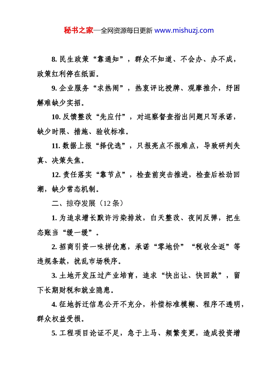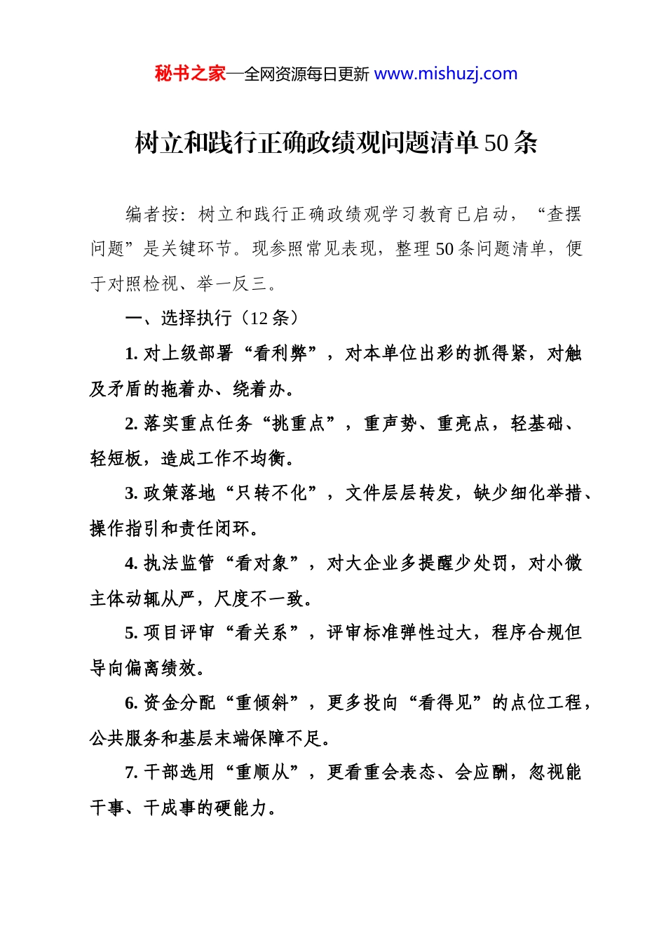 秘书之家—全网资源每日更新 www.mishuzj.com树立和践行正确政绩观问题清单 50 条 编者按:树立和践行正确政绩观学习教育已启动,“查摆问题”是关键环节。现参照常见表现,整理 50 条问题清单,便于对照检视、举一反三。一、选择执行(12 条)1.对上级部署“看利弊”,对本单位出彩的抓得紧,对触及矛盾的拖着办、绕着办。2.落实重点任务“挑重点”,重声势、重亮点,轻基础、轻短板,造成工作不均衡。3.政策落地“只转不化”,文件层层转发,缺少细化举措、操作指引和责任闭环。4.执法监管“看对象”,对大企业多提醒少处罚,对小微主体动辄从严,尺度不一致。5.项目评审“看关系”,评审标准弹性过大,程序合规但导向偏离绩效。6.资金分配“重倾斜”,更多投向“看得见”的点位工程,公共服务和基层末端保障不足。7.干部选用“重顺从”,更看重会表态、会应酬,忽视能干事、干成事的硬能力。秘书之家—全网资源每日更新 www.mishuzj.com8.民生政策“靠通知”,群众不知道、不会办、办不成,政策红利停在纸面。9.企业服务“求热闹”,热衷评比授牌、观摩推介,纾困解难缺少实招。10.反馈整改“先应付”,对巡察督查指出问题只写承诺,缺少时限、措施、验收标准。11.数据上报“择优选”,只报亮点不报难点,导致研判失真、决策失焦。12.责任落实“靠节点”,检查前突击推进,检查后松劲回潮,缺少常态机制。二、掠夺发展(12 条)1.为追求增长默许污染排放,白天整改、夜间反弹,把生态账当“缓一缓”。2.招商引资一味拼优惠,承诺“零地价”“税收全返”等违规条款,扰乱市场秩序。3.土地开发压过产业培育,追求“快出让、快回款”,留下长期财税和就业隐患。4.征地拆迁信息公开不充分,补偿标准模糊、程序不透明,群众权益受损。5.工程项目论证不足,急于上马、频繁变更,造成投资增秘书之家—全网资源每日更新 www.mishuzj.com加、工期拉长。6.老旧小区改造偏“刷外墙”,管网老化、停车难、消防通道等顽疾久治不愈。7.农田水利久拖不修,却把资金优先用于“看起来气派”的楼堂馆所或景观提升。8.文化遗产保护过度商业化,重门票重业态,轻原真性轻公共性。9.城市治理重铺装重景观,盲道、人行道被占用长期无人管,精细管理落空。10.民生项目重采购轻运营,设备“买得贵、用得少”,后续维护无人管、资金无保障。11.基层公共服务点位建设追求数量,运行队伍、服务内容、绩效管理跟不上。12.应急、防灾、公共安全等底线投入不足,平时欠账不补,出事才临时加码。三、重显绩轻潜绩(13 条)1.群众反映强烈的问题“整一次”,专项检查一阵风,过后照旧、反复出现。2.网络留言“回复快”,办理慢、办不成,承诺口径漂亮、解决路径缺失。秘书之家—全网资源每日更新 www.mishuzj.com3.群众意见“套模板”,没有明确承办、办理时限、整改举措,实质内容空泛。4.下基层调研“走线路”,点位提前安排、群众不敢讲真话,调研变成拍照留痕。5.协调机制“挂牌多”,实际推进仍在部门间推诿,事项久拖、责任不清。6.创新工作“买设备”,平台建了、系统上了,人才缺、制度缺、场景缺,闲置浪费。7.热线工单“转一转”,缺少督办权和回访核验,群众反复来电仍无结果。8.对长期坚守一线的“苦干型”干部激励不足,导向变成“谁会说谁占先”。9.乡村振兴重打造“样板点”,把资源集中在少数村,大多数村提升乏力。10.惠民政策重覆盖不重精准,困难群体识别不细、帮扶衔接不畅。11.社区治理“挂牌满墙”,常态化服务少,网格走访流于形式,矛盾化解不及时。12.基层减负“口头重视”,报表台账换形式叠加,实际负担没有下降。秘书之家—全网资源每日更新 www.mishuzj.com13.风险防控停留在会议和文件,隐患排查不深、预案演练不实,底线意识不强。四、重声势轻实效(13 条)1.习惯用开会发文推动工作,任务拆解不细、责任链条不清,执行端无抓手。2.喜欢搞启动仪式、集中宣传,后续跟踪督导缺位,工作“开场热、收场冷”。3.工作推进“喊得响”,推进节奏“断断续续”,缺少持续攻坚和过程管控。4.安全检查重台账轻现场,隐患排查走马观花,风险识别不精准。5.事故之后才搞“全覆...