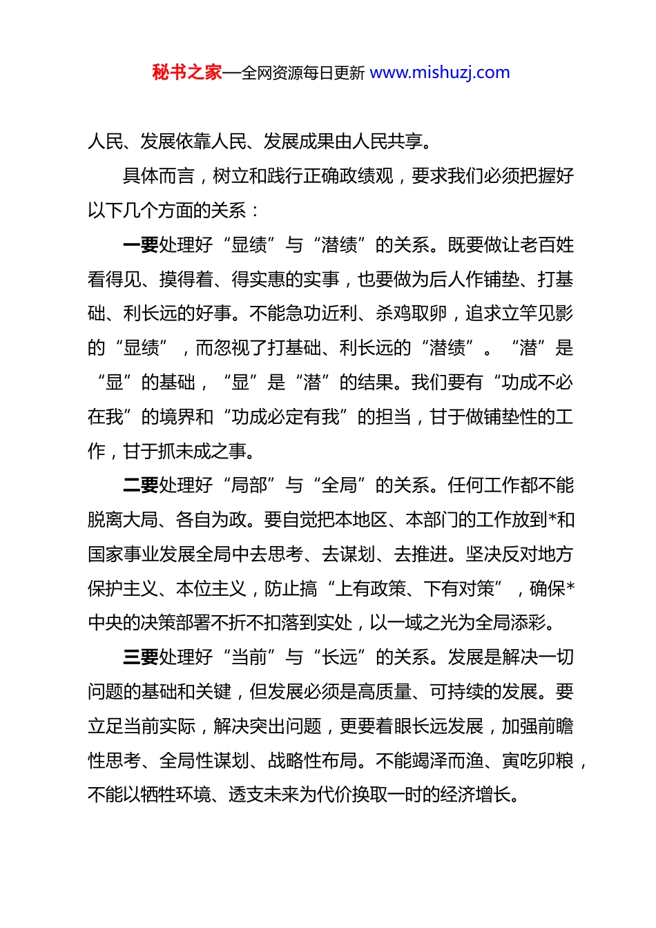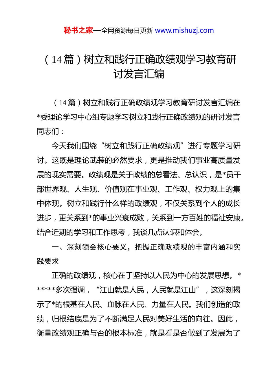 秘书之家—全网资源每日更新 www.mishuzj.com(14 篇)树立和践行正确政绩观学习教育研讨发言汇编(14 篇)树立和践行正确政绩观学习教育研讨发言汇编在*委理论学习中心组专题学习树立和践行正确政绩观的研讨发言同志们:今天我们围绕“树立和践行正确政绩观”进行专题学习研讨。这既是理论武装的必然要求,更是推动我们事业高质量发展的现实需要。政绩观是关于政绩的总看法、总认识,是*员干部世界观、人生观、价值观在事业观、工作观、权力观上的集中体现。树立和践行什么样的政绩观,不仅关系到个人的成长进步,更关系到*的事业兴衰成败,关系到一方百姓的福祉安康。结合近期的学习和工作思考,我谈几点认识和体会。一、深刻领会核心要义,把握正确政绩观的丰富内涵和实践要求正确的政绩观,核心在于坚持以人民为中心的发展思想。******多次强调,“江山就是人民,人民就是江山”,这深刻揭示了*的根基在人民、血脉在人民、力量在人民。我们创造的政绩,归根结底是为了不断满足人民对美好生活的向往。因此,衡量政绩观正确与否的根本标准,就是看是否做到了发展为了秘书之家—全网资源每日更新 www.mishuzj.com人民、发展依靠人民、发展成果由人民共享。具体而言,树立和践行正确政绩观,要求我们必须把握好以下几个方面的关系:一要处理好“显绩”与“潜绩”的关系。既要做让老百姓看得见、摸得着、得实惠的实事,也要做为后人作铺垫、打基础、利长远的好事。不能急功近利、杀鸡取卵,追求立竿见影的“显绩”,而忽视了打基础、利长远的“潜绩”。“潜”是“显”的基础,“显”是“潜”的结果。我们要有“功成不必在我”的境界和“功成必定有我”的担当,甘于做铺垫性的工作,甘于抓未成之事。二要处理好“局部”与“全局”的关系。任何工作都不能脱离大局、各自为政。要自觉把本地区、本部门的工作放到*和国家事业发展全局中去思考、去谋划、去推进。坚决反对地方保护主义、本位主义,防止搞“上有政策、下有对策”,确保*中央的决策部署不折不扣落到实处,以一域之光为全局添彩。三要处理好“当前”与“长远”的关系。发展是解决一切问题的基础和关键,但发展必须是高质量、可持续的发展。要立足当前实际,解决突出问题,更要着眼长远发展,加强前瞻性思考、全局性谋划、战略性布局。不能竭泽而渔、寅吃卯粮,不能以牺牲环境、透支未来为代价换取一时的经济增长。秘书之家—全网资源每日更新 www.mishuzj.com四要处理好“速度”与“质量”的关系。在推动发展中,要保持一定的增长速度,但绝不能唯 gdp 论英雄。要完整、准确、全面贯彻新发展理念,把发展质量问题摆在更为突出的位置,着力推动创新发展、协调发展、绿色发展、开放发展、共享发展,努力实现更高质量、更有效率、更加公平、更可持续、更为安全的发展。二、坚持问题导向,深刻检视政绩观方面存在的偏差和不足对照正确政绩观的要求,我们必须清醒地认识到,在实际工作中,一些*员干部在政绩观上还存在这样那样的问题,需要我们高度重视、深刻反思、切实加以纠正。一要检视否存在“急功近利”的倾向。有的干部热衷于搞“短平快”项目,喜欢做“显山露水”的事,对周期长、见效慢的基础性工作缺乏耐心和恒心,甚至搞“形象工程”、“政绩工程”,追求表面的轰轰烈烈,不顾实际效果和群众感受。二要检视是否存在“重硬轻软”的倾向。有的干部把主要精力放在看得见、摸得着的硬件建设上,对优化营商环境、提升治理效能、涵养文明风尚等“软实力”建设重视不够、投入不足,导致发展不平衡、不协调。三要检视是否存在“重上轻下”的倾向。有的干部只注重秘书之家—全网资源每日更新 www.mishuzj.com对上负责,看上级眼色行事,热衷于搞“亮点”、出“经验”,希望得到上级的肯定和表扬,而对群众的急难愁盼问题关心不够、解决不力,甚至脱离实际、脱离群众。四要检视是否存在“因循守旧”的倾向。有的干部思想不够解放,习惯于按部就班、墨守成规,缺乏改革创新、攻坚克难的锐气和担当,面对新形势新任务新要求,办法不多、措施不实,工作打不开局面。五要检视是否存在“统计造假”的倾向。有的干部为了追求所谓...