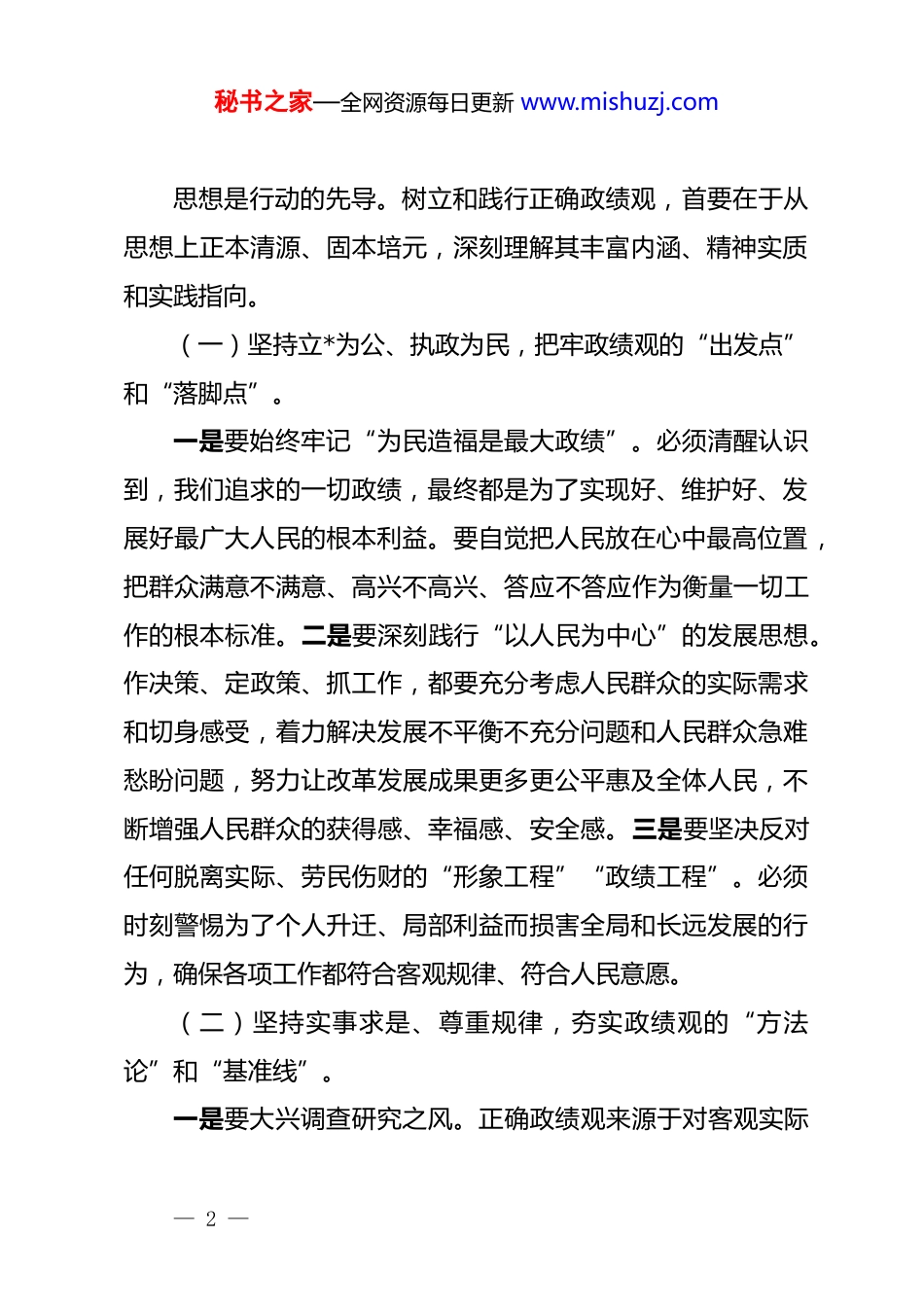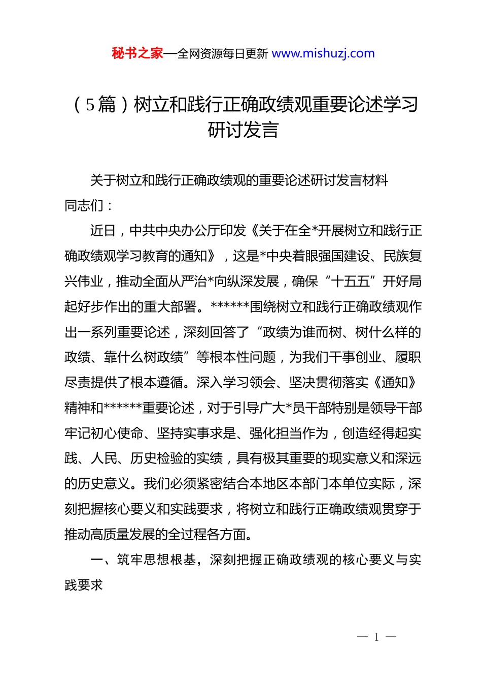 秘书之家—全网资源每日更新 www.mishuzj.com(5 篇)树立和践行正确政绩观重要论述学习研讨发言关于树立和践行正确政绩观的重要论述研讨发言材料同志们:近日,中共中央办公厅印发《关于在全*开展树立和践行正确政绩观学习教育的通知》,这是*中央着眼强国建设、民族复兴伟业,推动全面从严治*向纵深发展,确保“十五五”开好局起好步作出的重大部署。******围绕树立和践行正确政绩观作出一系列重要论述,深刻回答了“政绩为谁而树、树什么样的政绩、靠什么树政绩”等根本性问题,为我们干事创业、履职尽责提供了根本遵循。深入学习领会、坚决贯彻落实《通知》精神和******重要论述,对于引导广大*员干部特别是领导干部牢记初心使命、坚持实事求是、强化担当作为,创造经得起实践、人民、历史检验的实绩,具有极其重要的现实意义和深远的历史意义。我们必须紧密结合本地区本部门本单位实际,深刻把握核心要义和实践要求,将树立和践行正确政绩观贯穿于推动高质量发展的全过程各方面。一、筑牢思想根基,深刻把握正确政绩观的核心要义与实践要求— 1 —秘书之家—全网资源每日更新 www.mishuzj.com思想是行动的先导。树立和践行正确政绩观,首要在于从思想上正本清源、固本培元,深刻理解其丰富内涵、精神实质和实践指向。(一)坚持立*为公、执政为民,把牢政绩观的“出发点”和“落脚点”。一是要始终牢记“为民造福是最大政绩”。必须清醒认识到,我们追求的一切政绩,最终都是为了实现好、维护好、发展好最广大人民的根本利益。要自觉把人民放在心中最高位置,把群众满意不满意、高兴不高兴、答应不答应作为衡量一切工作的根本标准。二是要深刻践行“以人民为中心”的发展思想。作决策、定政策、抓工作,都要充分考虑人民群众的实际需求和切身感受,着力解决发展不平衡不充分问题和人民群众急难愁盼问题,努力让改革发展成果更多更公平惠及全体人民,不断增强人民群众的获得感、幸福感、安全感。三是要坚决反对任何脱离实际、劳民伤财的“形象工程”“政绩工程”。必须时刻警惕为了个人升迁、局部利益而损害全局和长远发展的行为,确保各项工作都符合客观规律、符合人民意愿。(二)坚持实事求是、尊重规律,夯实政绩观的“方法论”和“基准线”。一是要大兴调查研究之风。正确政绩观来源于对客观实际— 2 —秘书之家—全网资源每日更新 www.mishuzj.com的准确把握。必须坚持一切从实际出发,深入基层、深入群众、深入一线,掌握真实情况,发现真问题,听取真意见,使各项决策和工作部署建立在扎实的调研基础之上。二是要遵循经济社会发展客观规律。推动发展、创造政绩,必须尊重自然规律、经济规律、社会规律,不蛮干、不盲动,不搞“竭泽而渔”“寅吃卯粮”,追求实实在在、没有水分的发展,实现速度、结构、质量、效益、安全的有机统一。三是要保持历史耐心和战略定力。树立“功成不必在我、功成必定有我”的境界,多做打基础、利长远、惠民生的事,甘于做铺垫性的工作,甘于抓未成之事,不贪一时之功、不图一时之名,创造出真正对历史负责、对人民负责的业绩。(三)坚持系统观念、统筹兼顾,把握政绩观的“全局观”和“协同性”。一是要自觉服从服务于*和国家工作大局。必须胸怀“国之大者”,善于把本地区本部门的工作融入*和国家事业全局来思考和谋划,确保*中央重大决策部署不折不扣落到实处,在服务全局中体现自身价值、创造过硬政绩。二是要完整、准确、全面贯彻新发展理念。将创新、协调、绿色、开放、共享的发展理念作为一个整体贯穿于政绩创造全过程,不能畸轻畸重,不能以牺牲环境、浪费资源、损害社会公平为代价换取经济增长。— 3 —秘书之家—全网资源每日更新 www.mishuzj.com三是要注重工作的整体性和关联性。处理好当前与长远、局部与全局、发展与安全、重点与一般等重大关系,加强前瞻性思考、全局性谋划、战略性布局、整体性推进,实现发展质量、结构、规模、速度、效益、安全相统一。二、聚焦突出问题,深入查摆在政绩观上存在的偏差与不足对照《通知》要求和******重要论述,我们必须坚持问题导向,发扬自我革命精神,深入查摆本地区本部门...