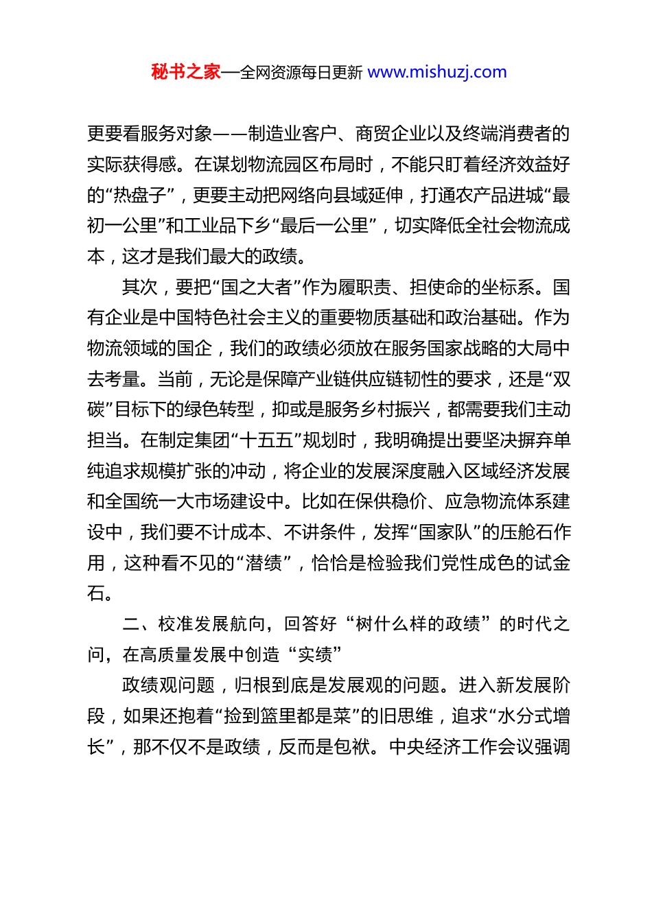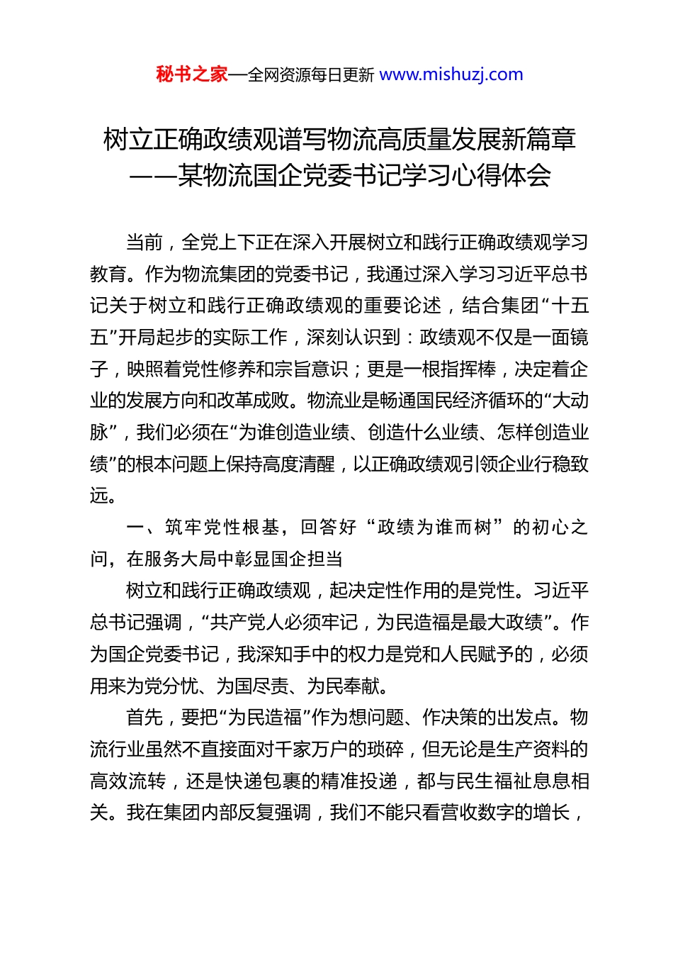 秘书之家—全网资源每日更新 www.mishuzj.com树立正确政绩观谱写物流高质量发展新篇章——某物流国企党委书记学习心得体会 当前,全党上下正在深入开展树立和践行正确政绩观学习教育。作为物流集团的党委书记,我通过深入学习习近平总书“记关于树立和践行正确政绩观的重要论述,结合集团 十五”五 开局起步的实际工作,深刻认识到:政绩观不仅是一面镜子,映照着党性修养和宗旨意识;更是一根指挥棒,决定着企“业的发展方向和改革成败。物流业是畅通国民经济循环的 大动”“脉 ,我们必须在 为谁创造业绩、创造什么业绩、怎样创造业”绩 的根本问题上保持高度清醒,以正确政绩观引领企业行稳致远。一、筑牢党性根基,回答好“政绩为谁而树”的初心之问,在服务大局中彰显国企担当树立和践行正确政绩观,起决定性作用的是党性。习近平“”总书记强调, 共产党人必须牢记,为民造福是最大政绩 。作为国企党委书记,我深知手中的权力是党和人民赋予的,必须用来为党分忧、为国尽责、为民奉献。“”首先,要把 为民造福 作为想问题、作决策的出发点。物流行业虽然不直接面对千家万户的琐碎,但无论是生产资料的高效流转,还是快递包裹的精准投递,都与民生福祉息息相关。我在集团内部反复强调,我们不能只看营收数字的增长,秘书之家—全网资源每日更新 www.mishuzj.com更要看服务对象——制造业客户、商贸企业以及终端消费者的实际获得感。在谋划物流园区布局时,不能只盯着经济效益好“”“的 热盘子 ,更要主动把网络向县域延伸,打通农产品进城 最”“”初一公里 和工业品下乡 最后一公里 ,切实降低全社会物流成本,这才是我们最大的政绩。“”其次,要把 国之大者 作为履职责、担使命的坐标系。国有企业是中国特色社会主义的重要物质基础和政治基础。作为物流领域的国企,我们的政绩必须放在服务国家战略的大局中“去考量。当前,无论是保障产业链供应链韧性的要求,还是 双”碳 目标下的绿色转型,抑或是服务乡村振兴,都需要我们主动“”担当。在制定集团 十五五 规划时,我明确提出要坚决摒弃单纯追求规模扩张的冲动,将企业的发展深度融入区域经济发展和全国统一大市场建设中。比如在保供稳价、应急物流体系建“”设中,我们要不计成本、不讲条件,发挥 国家队 的压舱石作“”用,这种看不见的 潜绩 ,恰恰是检验我们党性成色的试金石。二、校准发展航向,回答好“树什么样的政绩”的时代之问,在高质量发展中创造“实绩”政绩观问题,归根到底是发展观的问题。进入新发展阶“”“段,如果还抱着 捡到篮里都是菜 的旧思维,追求 水分式增”长 ,那不仅不是政绩,反而是包袱。中央经济工作会议强调秘书之家—全网资源每日更新 www.mishuzj.com“”要 追求实实在在、没有水分的增长 ,这对物流行业具有很强的针对性。一是“”要坚决摒弃 规模崇拜 ,追求有效益、有质量的增“”长。过去一段时间,物流行业存在 以规模论英雄 的倾向,一些企业盲目铺摊子、上项目,导致园区闲置、运力过剩,甚至“”“”出现 数字政绩虚假运单 的乱象。我在集团党委会上多次警“”示,这种 虚胖 的增长要不得。我们要的政绩,是主业核心竞争力的提升,是净资产收益率的改善,是服务实体经济的效能。今年,我们果断调整了考核指标体系,降低了单纯货量增长的权重,大幅增加了单票利润、客户满意度、单位 GDP 物流“”成本降幅等质量指标,引导各级干部从 拼价格、比注水 转“”向 拼服务、比效率 。二是“”“”要辩证看待 显绩 与 潜绩 ,多做打基础、利长远的事。物流基础设施建设投资大、回报周期长,比如智慧仓储的投入、多式联运体系的构建、新能源车队的替换,这些工作往往短期内看不到明显效果,甚至可能影响当期的利润报表。但“这是行业转型升级的必由之路。我经常跟大家讲,我们要有 功”“”成不必在我 的境界和 功成必定有我 的担当。就像栽树一样,我们不能只想着在树下乘凉,更要想着为后人植树。对于数字“”化底座建设、人才梯队培养、安全管理体系建设这些 潜绩 工程,我们要保持战略定力,一锤接着一锤敲,绝不...