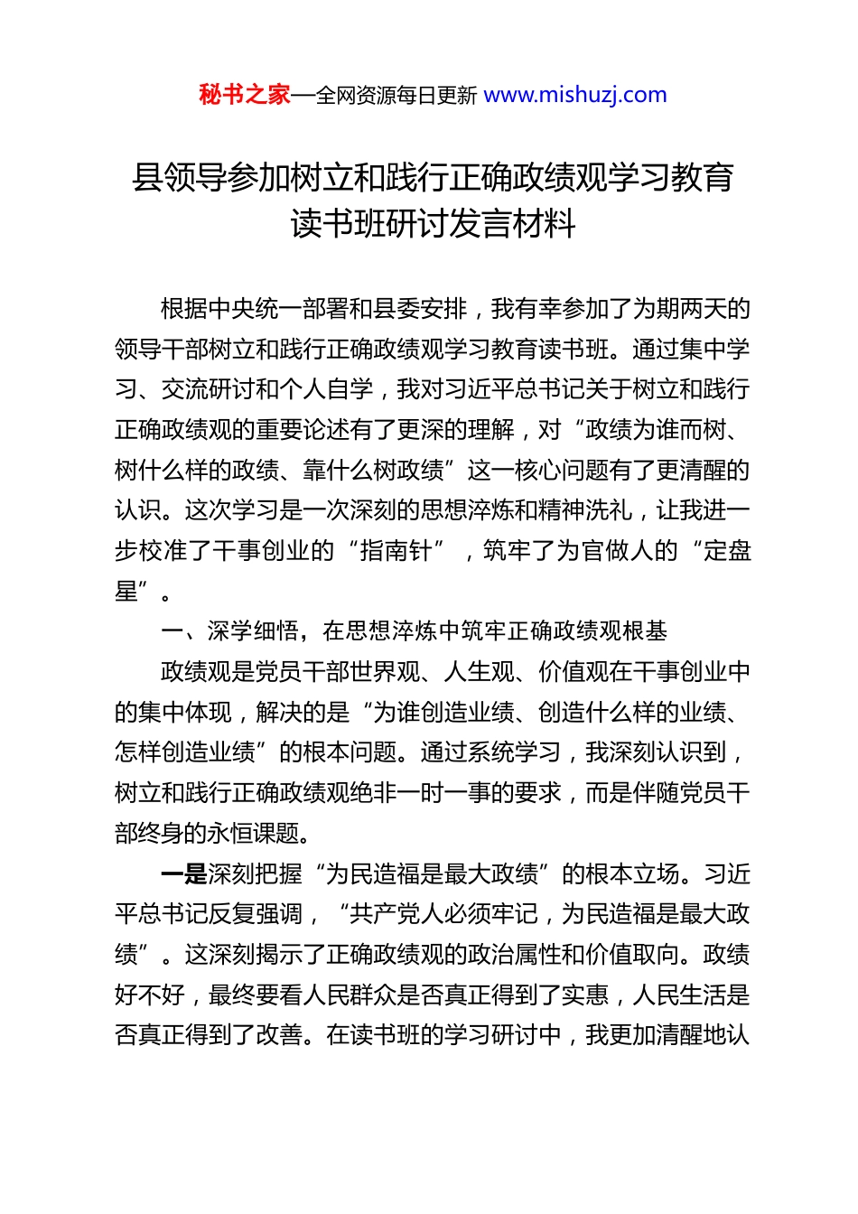 秘书之家—全网资源每日更新 www.mishuzj.com县领导参加树立和践行正确政绩观学习教育读书班研讨发言材料 根据中央统一部署和县委安排,我有幸参加了为期两天的领导干部树立和践行正确政绩观学习教育读书班。通过集中学习、交流研讨和个人自学,我对习近平总书记关于树立和践行正确政绩观的重要论述有了更深的理解,对“政绩为谁而树、树什么样的政绩、靠什么树政绩”这一核心问题有了更清醒的认识。这次学习是一次深刻的思想淬炼和精神洗礼,让我进一步校准了干事创业的“指南针”,筑牢了为官做人的“定盘星”。一、深学细悟,在思想淬炼中筑牢正确政绩观根基政绩观是党员干部世界观、人生观、价值观在干事创业中的集中体现,解决的是“为谁创造业绩、创造什么样的业绩、怎样创造业绩”的根本问题。通过系统学习,我深刻认识到,树立和践行正确政绩观绝非一时一事的要求,而是伴随党员干部终身的永恒课题。一是深刻把握“为民造福是最大政绩”的根本立场。习近平总书记反复强调,“共产党人必须牢记,为民造福是最大政绩”。这深刻揭示了正确政绩观的政治属性和价值取向。政绩好不好,最终要看人民群众是否真正得到了实惠,人民生活是否真正得到了改善。在读书班的学习研讨中,我更加清醒地认秘书之家—全网资源每日更新 www.mishuzj.com识到,任何脱离人民需求、忽视群众感受的“政绩”,都是无源之水、无本之木。必须始终站稳人民立场,把群众满意作为衡量一切工作的最高标准,把为民造福作为一切工作的出发点和落脚点,真正做到“民之所好好之,民之所恶恶之”。二是深刻把握“高质量发展是首要任务”的时代内涵。发展是解决一切问题的基础和关键,但新时代的发展必须是高质量的发展。中央明确要求,学习教育要引导党员干部“完整准确全面贯彻新发展理念,加快构建新发展格局,着力推动高质量发展”。这要求我们,谋划工作、推动发展,必须摆脱“唯GDP 论”的路径依赖,坚决摒弃以牺牲环境、透支未来为代价换取一时增长的做法。要树立正确的政绩观,就必须深刻理解高质量发展的丰富内涵,将创新、协调、绿色、开放、共享的新发展理念贯穿于决策和执行的全过程,追求更高质量、更有效率、更加公平、更可持续、更为安全的发展。三是深刻把握“真抓实干是根本路径”的实践要求。业绩都是干出来的,不是喊出来的。树立和践行正确政绩观,关键在于“践行”,核心在于“实干”。中央《通知》将“真抓实干”列为总要求之一,并强调要“为人民出政绩、以实干出政绩”。这警示我们,任何华而不实的“形象工程”、劳民伤财的“政绩工程”、脱离实际的“面子工程”,都是政绩观偏差的表现。必须大力弘扬求真务实、真抓实干的作风,察实情、出实招、求实效,以“时时放心不下”的责任感和“事事落实秘书之家—全网资源每日更新 www.mishuzj.com到位”的执行力,把党中央的决策部署和省、市、县委的工作要求落到实处,创造经得起实践、人民、历史检验的实绩。二、对标检视,在自我革命中查摆政绩观偏差树立和践行正确政绩观,既要靠教育引导,更要靠自我革命。读书班要求我们“对标对表、查摆不足”,这为我们提供了一面检视自身的镜子。我严格对照初心使命、新发展理念、实干要求和纪律规矩,进行了深刻的自检视宗旨意识牢不牢。回望入党初心,检视自己是否始终牢记“我是谁、为了谁、依靠谁”。在日常工作中,有时是否存在对群众急难愁盼问题回应不够及时、解决不够彻底的情况?在推动项目、制定政策时,是否真正做到了深入基层、问计于民,还是更多停留在文件传达和会议部署层面?通过反思,我认识到,宗旨意识的牢固程度,直接决定了政绩观的正确与否。必须时刻警惕脱离群众的危险,把群众的小事当作自己的大事来办,让工作成效更多更公平地惠及全体人民。二是对照新发展理念,检视发展思路对不对。面对推动高质量发展的时代命题,检视自己的发展理念是否与时俱进。在谋划工作时,是否还存在重速度轻质量、重显绩轻潜绩的思维惯性?在推动产业升级、生态保护、民生改善等方面,是否真正做到了统筹兼顾、系统推进?通过学习,我更加清晰地看到,发展思路的偏差是政绩观偏差的重要根源。...