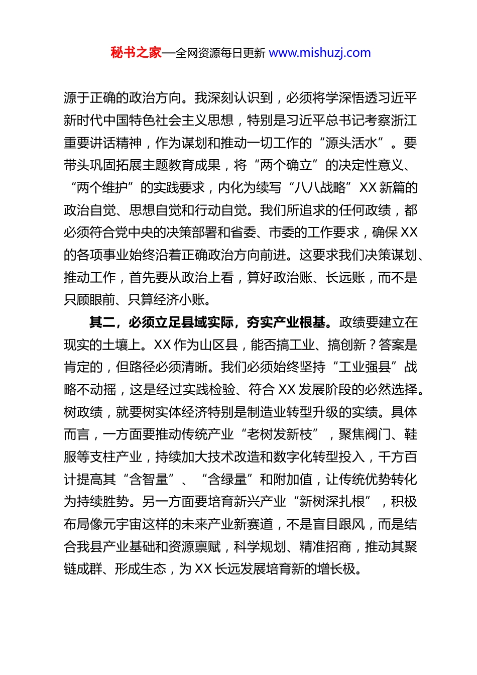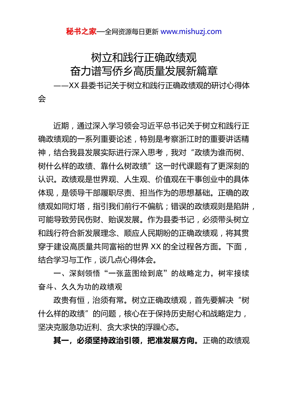 秘书之家—全网资源每日更新 www.mishuzj.com树立和践行正确政绩观奋力谱写侨乡高质量发展新篇章——XX 县委书记关于树立和践行正确政绩观的研讨心得体会近期,通过深入学习领会习近平总书记关于树立和践行正确政绩观的一系列重要论述,特别是考察浙江时的重要讲话精神,结合我县发展实际进行深入思考,我对“政绩为谁而树、树什么样的政绩、靠什么树政绩”这一时代课题有了更深刻的认识。政绩观是世界观、人生观、价值观在干事创业中的具体体现,是领导干部履职尽责、担当作为的思想基础。正确的政绩观如同灯塔,指引我们前行不偏航;错误的政绩观则是陷阱,可能导致劳民伤财、贻误发展。作为县委书记,必须带头树立和践行符合新发展理念、顺应人民期盼的正确政绩观,将其贯穿于建设高质量共同富裕的世界 XX 的全过程各方面。下面,结合学习与工作,谈几点心得体会。一、深刻领悟“一张蓝图绘到底”的战略定力,树牢接续奋斗、久久为功的政绩观政贵有恒,治须有常。树立正确政绩观,首先要解决“树什么样的政绩”的问题,核心在于保持历史耐心和战略定力,坚决克服急功近利、贪大求快的浮躁心态。其一,必须坚持政治引领,把准发展方向。正确的政绩观秘书之家—全网资源每日更新 www.mishuzj.com源于正确的政治方向。我深刻认识到,必须将学深悟透习近平新时代中国特色社会主义思想,特别是习近平总书记考察浙江重要讲话精神,作为谋划和推动一切工作的“源头活水”。要带头巩固拓展主题教育成果,将“两个确立”的决定性意义、“两个维护”的实践要求,内化为续写“八八战略”XX 新篇的政治自觉、思想自觉和行动自觉。我们所追求的任何政绩,都必须符合党中央的决策部署和省委、市委的工作要求,确保 XX的各项事业始终沿着正确政治方向前进。这要求我们决策谋划、推动工作,首先要从政治上看,算好政治账、长远账,而不是只顾眼前、只算经济小账。其二,必须立足县域实际,夯实产业根基。政绩要建立在现实的土壤上。XX 作为山区县,能否搞工业、搞创新?答案是肯定的,但路径必须清晰。我们必须始终坚持“工业强县”战略不动摇,这是经过实践检验、符合 XX 发展阶段的必然选择。树政绩,就要树实体经济特别是制造业转型升级的实绩。具体而言,一方面要推动传统产业“老树发新枝”,聚焦阀门、鞋服等支柱产业,持续加大技术改造和数字化转型投入,千方百计提高其“含智量”、“含绿量”和附加值,让传统优势转化为持续胜势。另一方面要培育新兴产业“新树深扎根”,积极布局像元宇宙这样的未来产业新赛道,不是盲目跟风,而是结合我县产业基础和资源禀赋,科学规划、精准招商,推动其聚链成群、形成生态,为 XX 长远发展培育新的增长极。秘书之家—全网资源每日更新 www.mishuzj.com其三,必须发挥独特优势,打响侨乡品牌。XX 最大的特色和优势在华侨。树立正确政绩观,必须把“华侨第一资源”这篇文章做深做实。我们要追求的政绩,是推动“地瓜经济”提能升级、促进华侨要素深度回流的政绩。这要求我们深入实施新时代华侨要素回流工程,不仅要在情感上、服务上贴近侨胞,更要在平台搭建、政策创新、营商环境优化上下硬功夫,勇做华侨资源回归的“第一进口地”。要把侨牌打成王牌,意味着要将华侨的资金、技术、人才、人脉网络等优势,有效转化为我县发展跨境电商、总部经济、国际贸易的强劲动力,真正把“侨力”变成推动 XX 共同富裕的“实力”。二、始终恪守“不矜不伐功成不居”的为民情怀,树牢造福于民、甘于潜绩的政绩观为民造福是最大政绩。树立正确政绩观,从根本上要回答“政绩为谁而树”的问题,必须坚持以人民为中心的发展思想,把群众满意作为衡量一切工作的根本标准。其一,必须坚持“百姓事即自己事”,用心用情解民忧。真正的政绩,是老百姓看得见、摸得着、感受得到的实惠。我们要把更多精力、财力投入到民生领域,积极回应群众在就业、教育、医疗、养老、住房等方面的“急难愁盼”。树立正确政绩观,就要求我们不仅要做显眼的“大工程”,更要办妥贴心的“关键小事”。比如,持续推进城乡公交一体化、老旧小区改造、农村饮用水提升等工程,虽然...