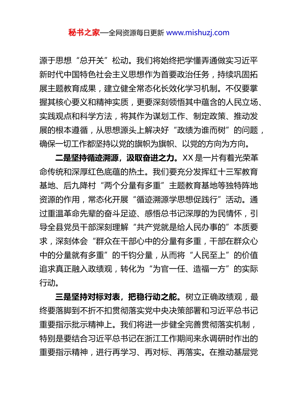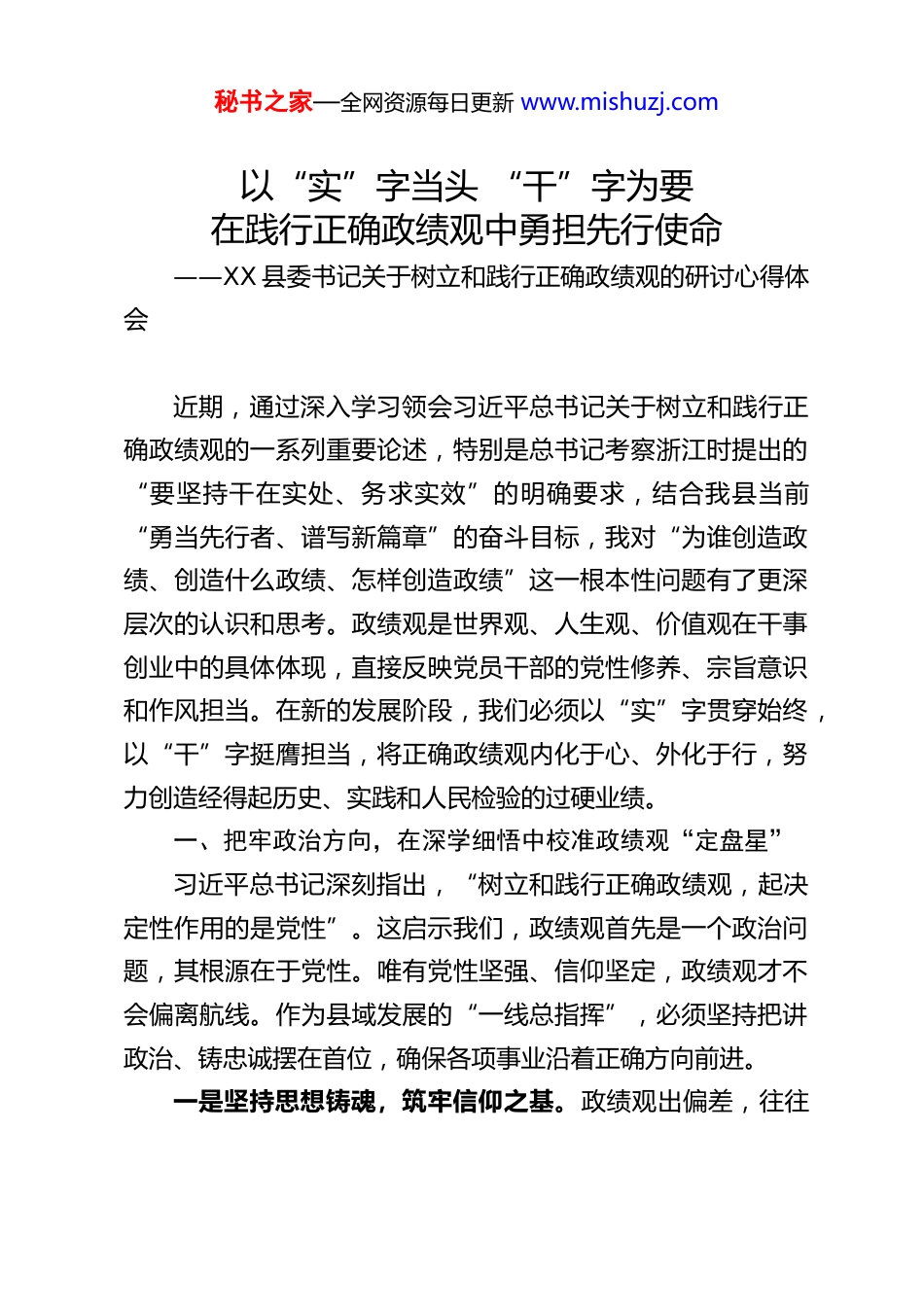秘书之家—全网资源每日更新 www.mishuzj.com以“实”字当头 “干”字为要在践行正确政绩观中勇担先行使命——XX 县委书记关于树立和践行正确政绩观的研讨心得体会近期,通过深入学习领会习近平总书记关于树立和践行正确政绩观的一系列重要论述,特别是总书记考察浙江时提出的“要坚持干在实处、务求实效”的明确要求,结合我县当前“勇当先行者、谱写新篇章”的奋斗目标,我对“为谁创造政绩、创造什么政绩、怎样创造政绩”这一根本性问题有了更深层次的认识和思考。政绩观是世界观、人生观、价值观在干事创业中的具体体现,直接反映党员干部的党性修养、宗旨意识和作风担当。在新的发展阶段,我们必须以“实”字贯穿始终,以“干”字挺膺担当,将正确政绩观内化于心、外化于行,努力创造经得起历史、实践和人民检验的过硬业绩。一、把牢政治方向,在深学细悟中校准政绩观“定盘星”习近平总书记深刻指出,“树立和践行正确政绩观,起决定性作用的是党性”。这启示我们,政绩观首先是一个政治问题,其根源在于党性。唯有党性坚强、信仰坚定,政绩观才不会偏离航线。作为县域发展的“一线总指挥”,必须坚持把讲政治、铸忠诚摆在首位,确保各项事业沿着正确方向前进。一是坚持思想铸魂,筑牢信仰之基。政绩观出偏差,往往秘书之家—全网资源每日更新 www.mishuzj.com源于思想“总开关”松动。我们将始终把学懂弄通做实习近平新时代中国特色社会主义思想作为首要政治任务,持续巩固拓展主题教育成果,建立健全常态化长效化学习机制。不仅要掌握其核心要义和精神实质,更要深刻领悟其中蕴含的人民立场、实践观点和科学方法,将其作为谋划工作、制定政策、推动发展的根本遵循,从思想源头上解决好“政绩为谁而树”的问题,确保一切工作都坚持以党的旗帜为旗帜、以党的方向为方向。二是坚持循迹溯源,汲取奋进之力。XX 是一片有着光荣革命传统和深厚红色底蕴的热土。我们要充分发挥红十三军教育基地、后九降村“两个分量有多重”主题教育基地等独特阵地资源的作用,常态化开展“循迹溯源学思想促践行”活动。通过重温革命先辈的奋斗足迹、感悟总书记深厚的为民情怀,引导全县党员干部深刻理解“共产党就是给人民办事的”本质要求,深刻体会“群众在干部心中的分量有多重,干部在群众心中的分量就有多重”的千钧分量,从而将“人民至上”的价值追求真正融入政绩观,转化为“为官一任、造福一方”的实际行动。三是坚持对标对表,把稳行动之舵。树立正确政绩观,最终要落脚到不折不扣贯彻落实党中央决策部署和习近平总书记重要指示批示精神上。我们将进一步健全完善贯彻落实机制,特别是要结合习近平总书记在浙江工作期间来永调研时作出的重要指示精神,进行再学习、再对标、再落实。在推动基层党秘书之家—全网资源每日更新 www.mishuzj.com建提质增效、民生产业高质量发展、永昆艺术活化复兴等具体工作中,都要自觉同党的基本理论、基本路线、基本方略对标对表,确保执行不偏向、不变通、不走样,以实实在在的工作成效诠释对“两个确立”的坚决拥护、“两个维护”的忠诚践行。二、聚焦实干担当,在推动发展中检验政绩观“试金石”发展是硬道理,是解决一切问题的基础和关键。但发展必须是高质量发展,是体现新发展理念的发展。总书记强调“新时代新阶段的发展必须贯彻新发展理念,必须是高质量发展”,这为我们树立和践行正确政绩观提供了实践标尺。我们必须坚决破除急功近利、投机取巧的心态,把心思和精力用在夯实发展基础、增强发展后劲上,追求实实在在、没有水分、利于长远的发展。一是以重大平台建设拓展城市能级。当前,XX 正处在“拥江融入、产城融合”的关键时期。我们将积极对标温州市“强城行动”三年计划,举全县之力推进温州北站高铁新城、温州北外滩等牵引性、标志性重大城市平台建设。这不是追求表面光鲜的“形象工程”,而是着眼于优化县域空间布局、提升综合承载能力、深度融入温州大都市区发展的战略抉择。通过高水平规划、高标准建设,真正激活沿江、西部、北部三大城市板块的发展活力,为高质量发展搭建坚实舞台。二是以新质生产力培育增强发展动能。面对新...