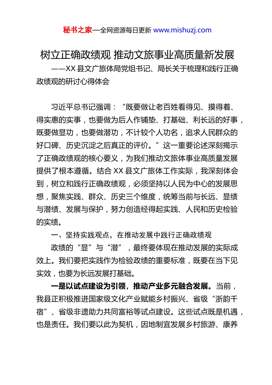 秘书之家—全网资源每日更新 www.mishuzj.com树立正确政绩观 推动文旅事业高质量新发展——XX 县文广旅体局党组书记、局长关于梳理和践行正确政绩观的研讨心得体会习近平总书记强调:“既要做让老百姓看得见、摸得着、得实惠的实事,也要做为后人作铺垫、打基础、利长远的好事,既要做显功,也要做潜功,不计较个人功名,追求人民群众的好口碑、历史沉淀之后真正的评价。”这一重要论述深刻揭示了正确政绩观的核心要义,为我们推动文旅体事业高质量发展提供了根本遵循。结合 XX 县文广旅体工作实际,我深刻体会到,树立和践行正确政绩观,必须坚持以人民为中心的发展思想,聚焦实践、群众、历史三个维度,统筹当前与长远、显绩与潜绩、发展与保护,努力创造经得起实践、人民和历史检验的实绩。一、坚持实践观点,在推动发展中践行正确政绩观政绩的“显”与“潜”,最终要体现在推动发展的实际成效上。我们要把实践作为检验政绩的重要标准,既要在当下见实效,也要为长远发展打基础。一是以试点建设为引领,推动产业多元融合发展。当前,我县正积极推进国家级文化产业赋能乡村振兴、省级“浙韵千宿”、省级非遗助力共同富裕等试点建设。这些试点既是机遇,也是责任。我们要以此为契机,因地制宜发展乡村旅游、康养秘书之家—全网资源每日更新 www.mishuzj.com旅居、文化创意等多元业态,推动文化产业与乡村经济深度融合,打造具有 XX 特色的文旅融合发展新模式。二是以“旅居 XX”计划为抓手,提升乡村旅游品质。在“拯救老屋”行动基础上,我们提出升级版“旅居 XX 计划”,旨在通过盘活闲置资源、提升服务品质、打造特色民宿集群,推动乡村旅游从“观光型”向“旅居型”转变。这不仅是提升游客体验的“显功”,更是为乡村长远发展打基础的“潜功”。三是以品牌建设为牵引,增强文旅发展影响力。我们要持续擦亮“在 XX 遇见美好”品牌,推动文旅产品提档升级,提升 XX 文旅的知名度和美誉度。通过节庆活动、媒体宣传、区域合作等多种方式,讲好 XX 故事,传播 XX 声音,让文旅发展成果更好地惠及群众、服务社会。二、坚持群众观点,在服务民生中践行正确政绩观人民群众的获得感、幸福感、安全感,是衡量政绩的根本尺度。我们要始终把为民造福作为最重要的政绩,推动文体服务普惠化、精准化发展,真正把工作做到群众心坎上。一是做实体育民生实事,提升群众健康水平。围绕“全民健身”目标,持续推进体育设施建设,完善城乡健身网络,组织开展群众性体育赛事活动,增强群众体质,丰富群众生活。体育不仅是民生,更是幸福感的来源。二是推进城市书房建设,打造群众精神家园。城市书房是公共文化服务的重要阵地,也是提升城市品位、涵养城市气质秘书之家—全网资源每日更新 www.mishuzj.com的重要载体。我们要高质量推进城市书房建设,优化布局、丰富藏书、提升服务,让群众在家门口就能享受优质的阅读资源。三是深化“文艺赋美”工程,丰富群众文化生活。通过文艺演出、展览展示、非遗体验等形式,推动优质文化资源下沉基层,丰富群众精神文化生活。要注重群众参与感、互动性,让文化惠民真正“走心”“入心”。三、坚持历史观点,在传承保护中践行正确政绩观正确政绩观不仅要看当下,更要看长远;不仅要看经济效益,更要看文化传承和历史价值。我们要扛起社会责任和历史担当,扎实做好“潜功”,为子孙后代留下宝贵的文化财富。一是挖掘农耕文化,延续历史文脉。XX 县拥有丰厚的农耕文化资源,这是我们独特的文化标识和精神根脉。要系统梳理、深入挖掘农耕文化内涵,推动农耕文化活态传承、创新发展,让传统文化在现代社会中焕发新生命。二是传承非遗技艺,增强文化自信。高腔、老屋等非物质文化遗产是 XX 文化的“活化石”。我们要加强非遗保护传承,推动非遗进校园、进社区、进景区,增强群众对本土文化的认同感和自豪感,坚定文化自信。三是筑牢文物安全防线,守护历史记忆。牢固树立“保护文物也是政绩”的理念,完善文物保护机制,强化日常巡查和监管,严厉打击文物违法行为,确保文物安全万无一失。要加大文物修缮力度,推动文物保护与利用相结合,让...
