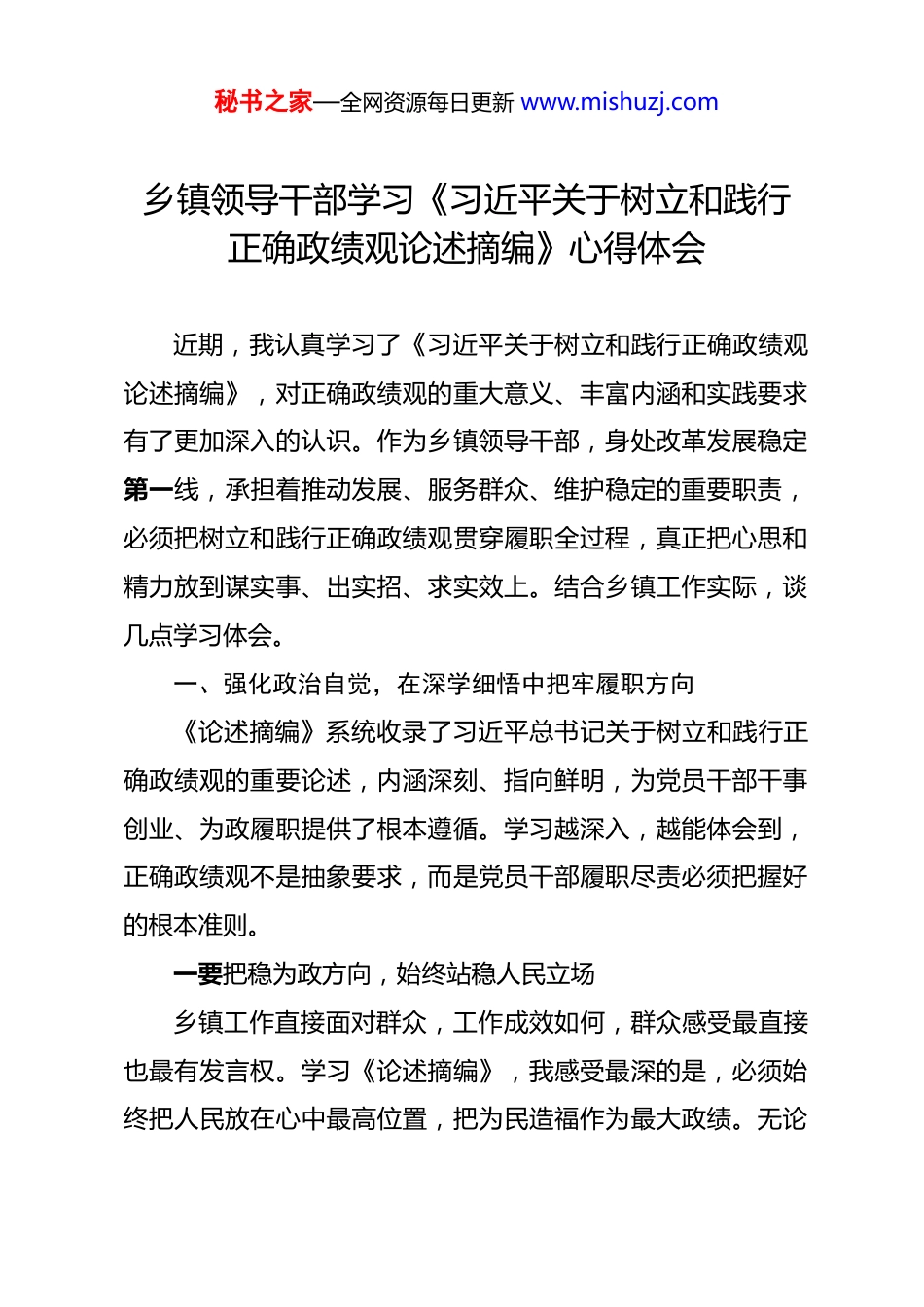 秘书之家—全网资源每日更新 www.mishuzj.com乡镇领导干部学习《习近平关于树立和践行正确政绩观论述摘编》心得体会 近期,我认真学习了《习近平关于树立和践行正确政绩观论述摘编》,对正确政绩观的重大意义、丰富内涵和实践要求有了更加深入的认识。作为乡镇领导干部,身处改革发展稳定第一线,承担着推动发展、服务群众、维护稳定的重要职责,必须把树立和践行正确政绩观贯穿履职全过程,真正把心思和精力放到谋实事、出实招、求实效上。结合乡镇工作实际,谈几点学习体会。一、强化政治自觉,在深学细悟中把牢履职方向《论述摘编》系统收录了习近平总书记关于树立和践行正确政绩观的重要论述,内涵深刻、指向鲜明,为党员干部干事创业、为政履职提供了根本遵循。学习越深入,越能体会到,正确政绩观不是抽象要求,而是党员干部履职尽责必须把握好的根本准则。一要把稳为政方向,始终站稳人民立场乡镇工作直接面对群众,工作成效如何,群众感受最直接也最有发言权。学习《论述摘编》,我感受最深的是,必须始终把人民放在心中最高位置,把为民造福作为最大政绩。无论秘书之家—全网资源每日更新 www.mishuzj.com是推动产业发展、完善基础设施,还是抓好基层治理、办好民生实事,都要从群众立场出发,顺应群众期待,重视群众感受,不能只盯着纸面上的数字和材料里的成效。只有真正把群众的操心事、烦心事、揪心事放在心上、抓在手上,工作才有根基,发展才有支撑,干部才有底气。二要校准干事标准,始终坚持求真务实正确政绩观最终体现在一个“实”字上,工作的成色也要靠一个“实”字来检验。乡镇工作千头万绪,既有必须抓紧推进的现实任务,也有需要持续用力的基础工作。学习《论述摘编》,我更加体会到,抓工作必须坚持从实际出发、按规律办事,不能脱离镇情实际盲目铺摊子、上项目,也不能把工作简单落到比速度、争排名上。凡是符合发展规律、契合群众意愿、经得起实践检验的事情,就应当稳扎稳打、持续推进;凡是华而不实、急功近利、透支后劲的做法,就必须坚决摒弃。只有把功夫下在实处,把工作做到深处,把成效落在细处,才能真正干出经得起检验的业绩。三要砥砺担当责任,始终做到知责尽责乡镇是抓落实的前沿,也是检验担当的阵地。学习《论述摘编》,让我更加认识到,正确政绩观既体现在思想认识上,也体现在责任担当上。面对发展中的难题、治理中的堵点、民秘书之家—全网资源每日更新 www.mishuzj.com生中的关切,不能回避矛盾,更不能等待观望,必须把该担的责任担起来,把该抓的工作抓起来,把该解决的问题解决好。对上级部署的任务,不能停留在传达上;对群众反映的问题,不能止步于回应上;对风险隐患和矛盾苗头,不能满足于发现上,而要是真正推动落地。干部有担当,工作才能推进;工作抓得实,发展才能见成效。二、坚持问题导向,在对照检视中找准偏差不足学习的过程,也是检视的过程。对照《论述摘编》要求,联系乡镇工作实际来看,一些影响高质量发展的思想偏差和作风问题,必须认真辨析、及时纠正。一要摒除急于求成的浮躁心态基层工作任务重、节奏快,越是在这种情况下,越要保持定力、稳扎稳打。现实中,有的工作过于看重短期变化,对需要长期积累的事情缺乏耐心;有的过于在意眼前成效,对后续发展考虑不够;有的只重表面改观,对内在提升用力不足。这类倾向如果得不到纠正,就容易使决策失之审慎,推进失之稳妥,工作失之扎实。乡镇抓工作,既要有抓当下的力度,也要有谋长远的眼光,不能只图一时之功,也不能只顾眼前之利。凡是需要长期投入、持续推进的事情,都要沉得住气、稳得住神,真正把基础打牢,把后劲蓄足。秘书之家—全网资源每日更新 www.mishuzj.com二要纠治重形轻效的虚化问题基层工作最怕形式代替落实、痕迹代替实绩。有的工作看起来动作不少、场面不小,实际解决的问题却不多,群众感受也不明显;有的把心思过多放在材料报送、台账整理和工作展示上,对实际成效缺少持续跟进。这类问题看上去是工作方式不够科学,根子上还是政绩观不够端正。乡镇工作没有捷径,群众也最看重实效。环境整治有没有保持常态,民生诉求有没有及时回应,...