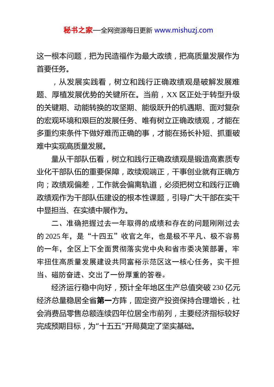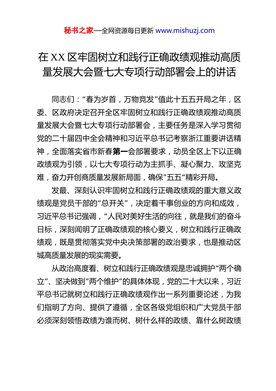 秘书之家—全网资源每日更新 www.mishuzj.com在 XX 区牢固树立和践行正确政绩观推动高质量发展大会暨七大专项行动部署会上的讲话 “”同志们: 春为岁首,万物竞发 值此十五五开局之年,区委、区政府决定召开全区牢固树立和践行正确政绩观推动高质量发展大会暨七大专项行动部署会,主要任务是深入学习贯彻党的二十届四中全会精神和习近平总书记考察浙江重要讲话精神,全面落实省市新春第一会部署要求,动员全区上下以正确政绩观为引领,以七大专项行动为主抓手、凝心聚力、攻坚克”“难,奋力开创商质量发展新局面,确保 五五 精彩开局。发最、深刻认识牢固树立和践行正确政绩观的重大意义政“”绩观是党员干部的 总开关 ,决定着干事创业的方向和成效,“习近平总书记强调, 人民对美好生活的向往,就是我们的奋斗日标,深刻闻明了正确政绩观的核心要义,树立和践行正确政绩观,既是贯彻落实党中央决策部署的政治要求,也是推动区城高质量发展的现实需要。“从政治高度看、树立和践行正确政绩观是忠诚拥护 两个确”””立 、坚决做到 两个维护 的具体体现,党的二十大以来,习近平总书记就树立和践行正确政绩观作出一系列重要论述,为我们指明了方向、提供了遵循,全区各级党组织和广大党员干部必须深刻领悟政绩为谁而树、树什么样的政绩、靠什么树政绩秘书之家—全网资源每日更新 www.mishuzj.com这一根本问题,把为民造福作为最大政绩,把高质量发展作为首要任务。,从发展实践看,树立和践行正确政绩观是破解发展难题、厚植发展优势的关键所在。当前,XX 区正处于转型升级的关键期、动能转换的攻坚期、能级跃升的机遇期、面对复杂的宏观环境和艰巨的发展任务、唯有树立正确政绩观,才能在多重约束条件下做好难而正确的事,才能在扬长补短、抓重破难中实现高质量发展。量从干部队伍看,树立和践行正确政绩观是锻造高素质专业化干部队伍的重要保障,政续观端正,干事创业就有正确方向;政绩观偏差,工作就会偏离轨道,必须把树立和践行正确政绩观作为干部队伍建设的根本性课题,引导广大干部在实干中显担当、在实绩中展作为。二、准确把握过去一年取得的成绩和存在的问题刚刚过去的 2025 年,是“十四五”收官之年,也是极不平凡、极不容易的一年,全区上下全面贯彻落实党中央和省市委决策部署,牢牢扭住高质量发展建设共同富裕示范区这一核心任务,实干担当、磁防奋进、交出了一份厚重的答卷。经济运行稳中向好,预计全年地区生产总值突破 230 亿元经济总量稳居全省第一方阵,固定资产投资保持合理增长,社会消费品零售总额连续四年位居全市前列,主要经济指标较好“”完成预期目标,为 十五五 开局莫定了坚实基础。秘书之家—全网资源每日更新 www.mishuzj.com-2 产业转型蹄疾现代产系化教字济、生命健康、电竞文娱等新兴产业蓬勃发展、高新技术产业投资、制造业投资年均增速分别达到 14 栋、2.3,创新动能持续增强。城市品质持续提升,大运河国家文化公园建设深入推进,城市有机更新取得阶段性成效,基础设施不断完善,城市综合承载能力显著增强。民生福祉日益增进,公共服务更加优质均衡,教育、医疗、养老等事业取得新进步。“步, 平安 Xx*建设纵深推进,社会大局和谐稳定。和党的建设全面加强,扎实开展学习贯彻习近平新时代中国特色社会主义思想主题教育,干部队伍精气神有效提振、政治生态持续向好。给在肯定成绩的同时,也要清醒认识到工作中存在的短板和不足,一是经济回升向好的基础还不够稳固,部分行业和金企业经营困难依然存在:二是新旧动能转换还需加速,战略性新兴产业比重有待提高;三是城市精细化管理水平有待提升,部分区域环境面貌仍需改善:四是少数干部担当意识不强、能力不足的问题依然存在。,对于这些问题,必须高度重视、切实加以解决。种三、全力以赴抓好七大专项行动落实落地为深入贯彻落实中央和省市部署要求,区委、区政府决定在全区开展七大专““项行动,作为 十五五 开局之年的主抓手、主引擎,以重点突破带动整体提升。秘书之家—全网资源每日更新 www.mishuzj.com第一深入实施抓项目促投资专项行动,项目...