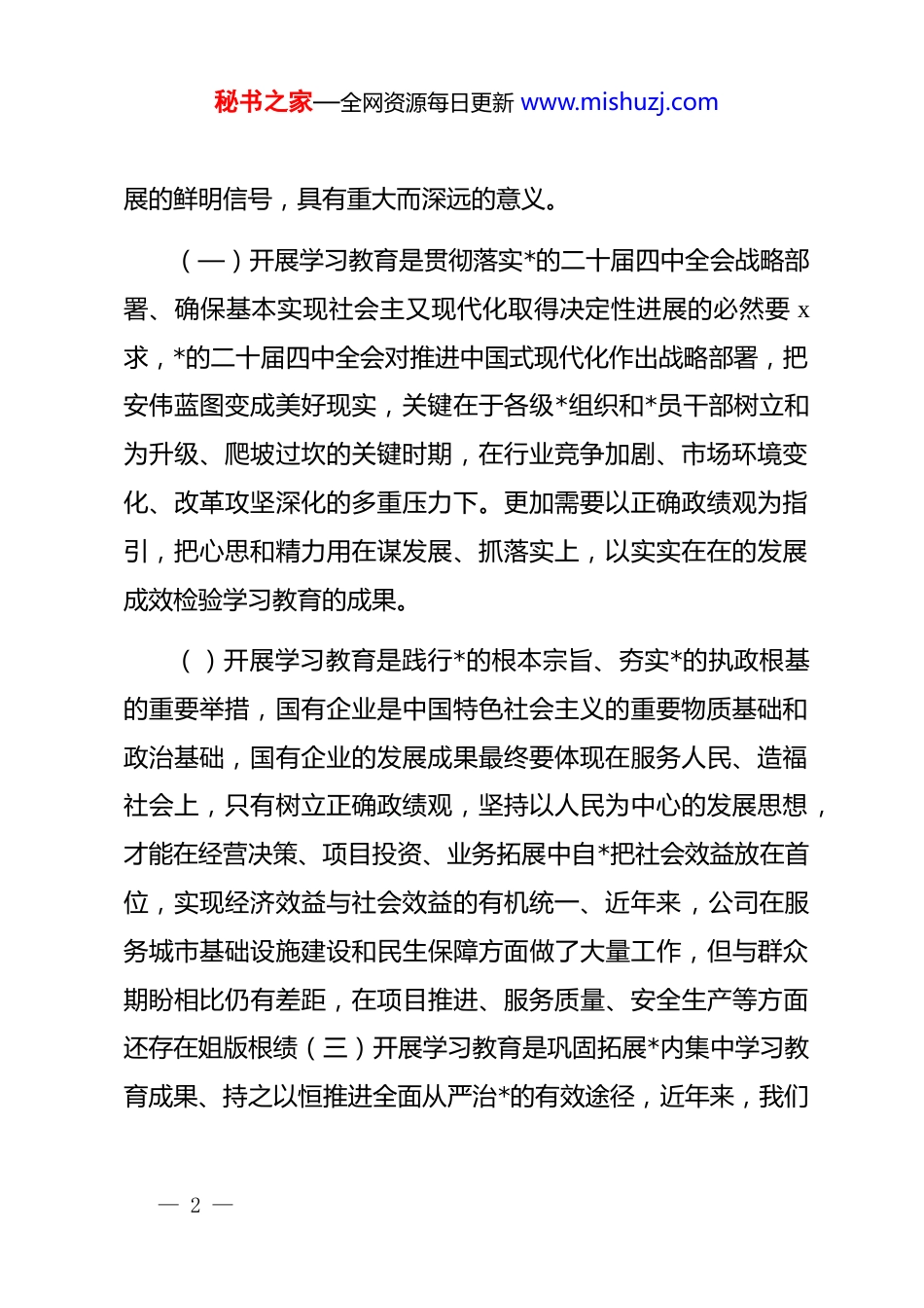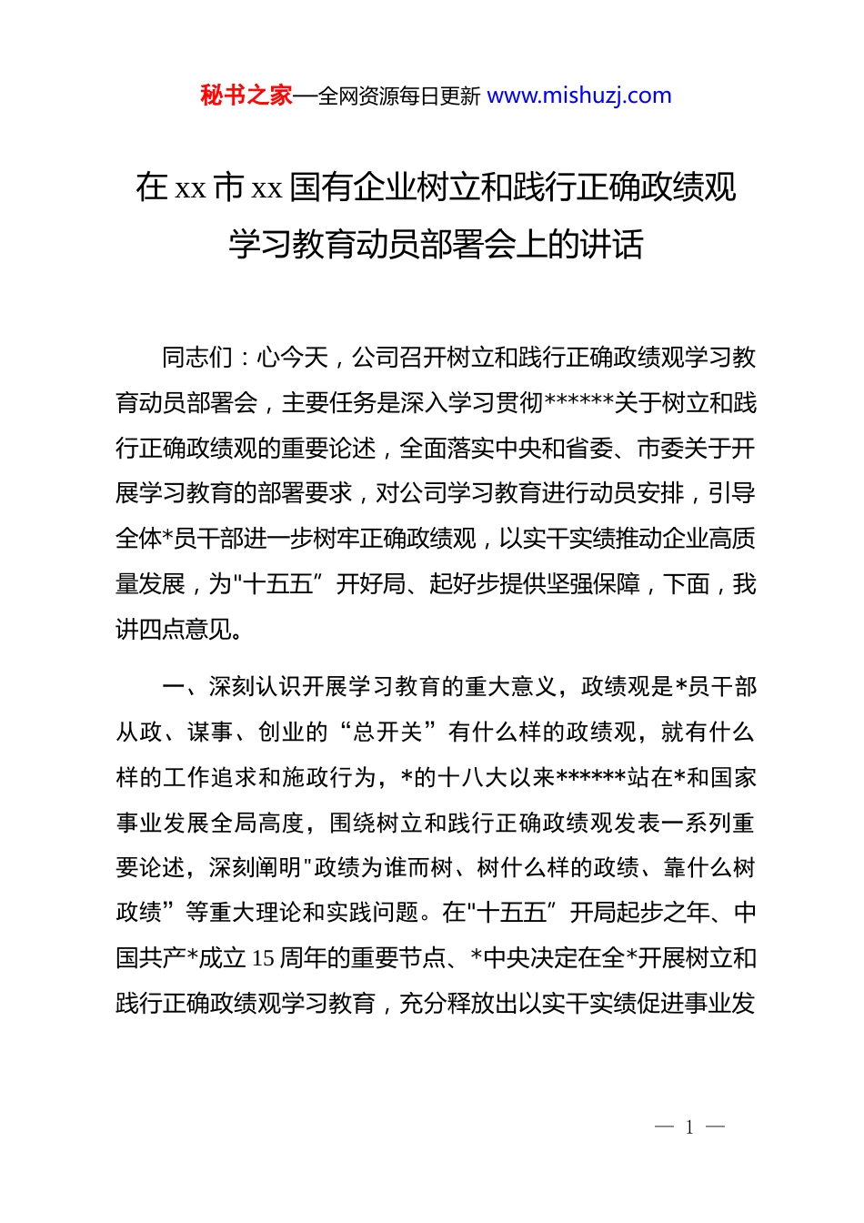 秘书之家—全网资源每日更新 www.mishuzj.com在 xx 市 xx 国有企业树立和践行正确政绩观学习教育动员部署会上的讲话同志们:心今天,公司召开树立和践行正确政绩观学习教育动员部署会,主要任务是深入学习贯彻******关于树立和践行正确政绩观的重要论述,全面落实中央和省委、市委关于开展学习教育的部署要求,对公司学习教育进行动员安排,引导全体*员干部进一步树牢正确政绩观,以实干实绩推动企业高质量发展,为"十五五”开好局、起好步提供坚强保障,下面,我讲四点意见。一、深刻认识开展学习教育的重大意义,政绩观是*员干部从政、谋事、创业的“总开关”有什么样的政绩观,就有什么样的工作追求和施政行为,*的十八大以来******站在*和国家事业发展全局高度,围绕树立和践行正确政绩观发表一系列重要论述,深刻阐明"政绩为谁而树、树什么样的政绩、靠什么树政绩”等重大理论和实践问题。在"十五五”开局起步之年、中国共产*成立 15 周年的重要节点、*中央决定在全*开展树立和践行正确政绩观学习教育,充分释放出以实干实绩促进事业发— 1 —秘书之家—全网资源每日更新 www.mishuzj.com展的鲜明信号,具有重大而深远的意义。(—)开展学习教育是贯彻落实*的二十届四中全会战略部署、确保基本实现社会主又现代化取得决定性进展的必然要 x求,*的二十届四中全会对推进中国式现代化作出战略部署,把安伟蓝图变成美好现实,关键在于各级*组织和*员干部树立和为升级、爬坡过坎的关键时期,在行业竞争加剧、市场环境变化、改革攻坚深化的多重压力下。更加需要以正确政绩观为指引,把心思和精力用在谋发展、抓落实上,以实实在在的发展成效检验学习教育的成果。()开展学习教育是践行*的根本宗旨、夯实*的执政根基的重要举措,国有企业是中国特色社会主义的重要物质基础和政治基础,国有企业的发展成果最终要体现在服务人民、造福社会上,只有树立正确政绩观,坚持以人民为中心的发展思想,才能在经营决策、项目投资、业务拓展中自*把社会效益放在首位,实现经济效益与社会效益的有机统一、近年来,公司在服务城市基础设施建设和民生保障方面做了大量工作,但与群众期盼相比仍有差距,在项目推进、服务质量、安全生产等方面还存在姐版根绩(三)开展学习教育是巩固拓展*内集中学习教育成果、持之以恒推进全面从严治*的有效途径,近年来,我们— 2 —秘书之家—全网资源每日更新 www.mishuzj.com先后开展了“不忘初心、牢记使命”zt 教育、*史学习教育、学习贯彻**************思想 zt 教育等,*员干部队伍的思想觉悟和*性修养不断提升。但也要清醒看到,政绩观偏差问题在一些干部身上依然存在:有的重显绩轻潜绩,热衷于”短平快“项目,对打基础、利长远的工作重视不够;有的重面子轻里子,道求表面光鲜、忽视内涵建设:有的重局部轻全局、只算部门小账不算公司大账;有的重部署轻落实,会议开了、文件发了就认为工作完成了,缺乏钉子精神,这些问题的存在、严重影响企业健康发展,必须通过学习教育加以解决。二、准确把握学习教育的目标要求中央明确了"立*为公、为民造福、科学决策、真抓实干的总要求,这是学习教育必须贺穿始终的主线,要深刻理解、准确把握、全面落实、把立*为公是根本立场,国有企业姓”*”,必须坚持*的领导、加强*的建设,把对*忠诚、为*分忧、为*尽责作为根本政治担当,要自觉在思想上政治上行动上同以***同志为核心的*中央保持高度一致,把企业发展融入*和国家事业大局,在服务城市发展战略、保障国计民生需求中找准定位、体现担当,要坚决克服”企特殊诊”的错误认识把彻中决策部署作为国之大者”不折不扣落实上级工作要求。— 3 —秘书之家—全网资源每日更新 www.mishuzj.com为民造福是价值取向,国有企业的发展成果由人民共享,服各人民,造福社会是企业的天职,要把群众满意作为衡量工作成效的根本标准,在经营决策中充分考虑群众利益,在项目推进中注重解决群众急难愁盼,在日常运营中不断提升服务质量。当前,公司承担着城市基础设施运营保障的重要职责,每一项业务 3 都关系群众切身利益,必须以群众是否满意作为检验政...