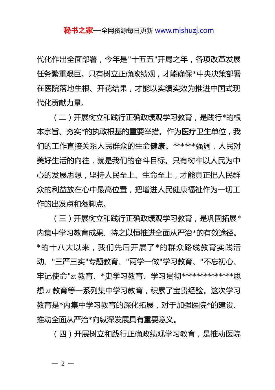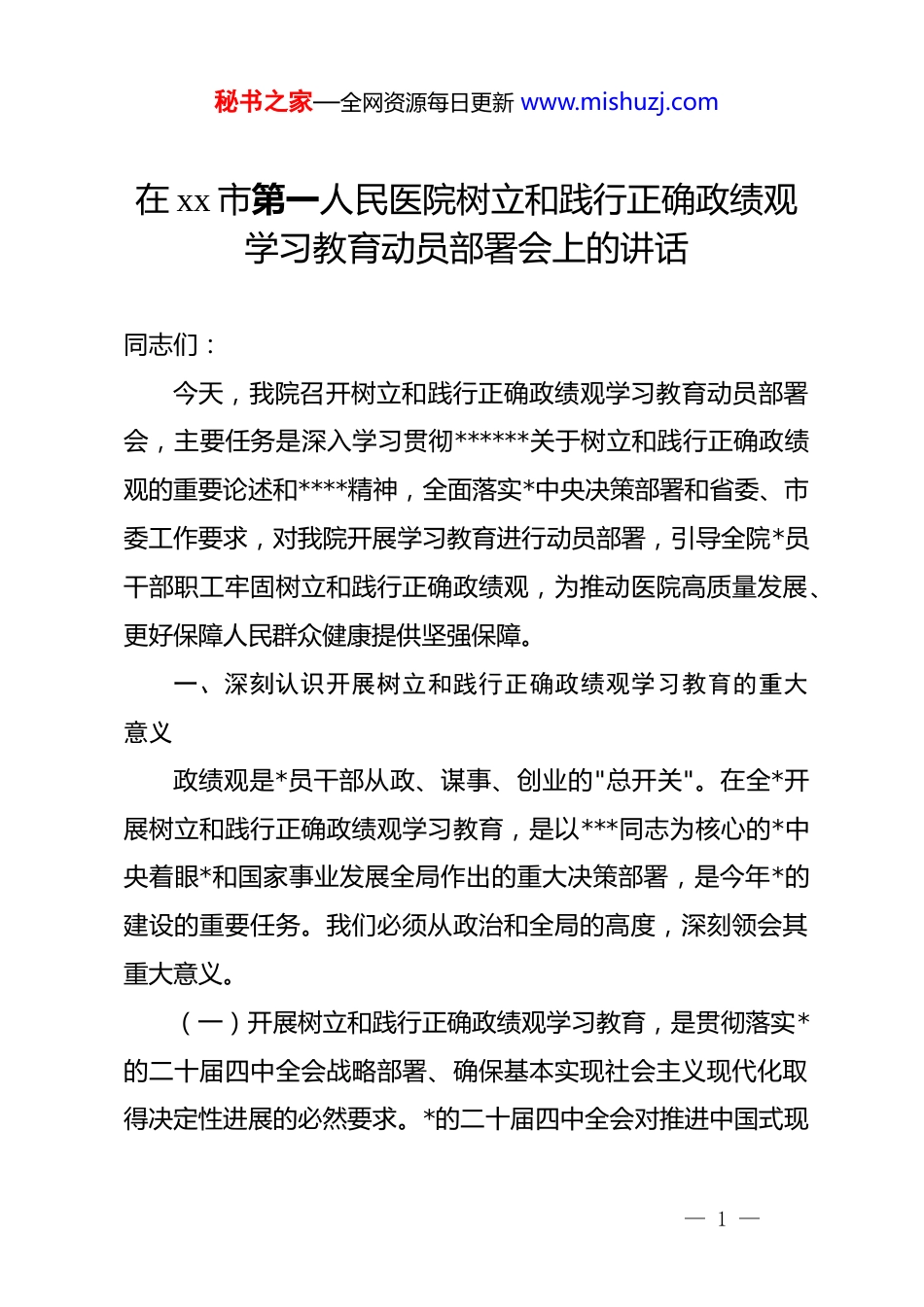 秘书之家—全网资源每日更新 www.mishuzj.com在 xx 市第一人民医院树立和践行正确政绩观学习教育动员部署会上的讲话同志们:今天,我院召开树立和践行正确政绩观学习教育动员部署会,主要任务是深入学习贯彻******关于树立和践行正确政绩观的重要论述和****精神,全面落实*中央决策部署和省委、市委工作要求,对我院开展学习教育进行动员部署,引导全院*员干部职工牢固树立和践行正确政绩观,为推动医院高质量发展、更好保障人民群众健康提供坚强保障。一、深刻认识开展树立和践行正确政绩观学习教育的重大意义政绩观是*员干部从政、谋事、创业的"总开关"。在全*开展树立和践行正确政绩观学习教育,是以***同志为核心的*中央着眼*和国家事业发展全局作出的重大决策部署,是今年*的建设的重要任务。我们必须从政治和全局的高度,深刻领会其重大意义。(一)开展树立和践行正确政绩观学习教育,是贯彻落实*的二十届四中全会战略部署、确保基本实现社会主义现代化取得决定性进展的必然要求。*的二十届四中全会对推进中国式现— 1 —秘书之家—全网资源每日更新 www.mishuzj.com代化作出全面部署,今年是"十五五"开局之年,各项改革发展任务繁重艰巨。只有树立正确政绩观,才能确保*中央决策部署在医院落地生根、开花结果,才能以实绩实效为推进中国式现代化贡献力量。(二)开展树立和践行正确政绩观学习教育,是践行*的根本宗旨、夯实*的执政根基的重要举措。作为医疗卫生单位,我们的工作直接关系人民群众的生命健康。******强调,人民对美好生活的向往,就是我们的奋斗目标。只有树牢以人民为中心的发展思想,坚持人民至上、生命至上,才能真正把人民群众的利益放在心中最高位置,把增进人民健康福祉作为一切工作的出发点和落脚点。(三)开展树立和践行正确政绩观学习教育,是巩固拓展*内集中学习教育成果、持之以恒推进全面从严治*的有效途径。*的十八大以来,我们先后开展了 *的群众路线教育实践活动、"三严三实"专题教育、"两学一做"学习教育、"不忘初心、牢记使命"zt 教育、*史学习教育、学习贯彻**************思想 zt 教育等一系列集中学习教育,积累了宝贵经验。这次学习教育是*内集中学习教育的深化拓展,对于加强医院*的建设、推动全面从严治*向纵深发展具有重要意义。(四)开展树立和践行正确政绩观学习教育,是推动医院— 2 —秘书之家—全网资源每日更新 www.mishuzj.com高质量发展、建设人民满意医院的迫切需要。当前,医院正处于转型发展的关键时期,学科建设、人才培养、服务提升等任务艰巨。能不能正确看待和衡量工作成效,是政绩观问题;能不能做出实实在在的工作业绩,也是政绩观问题。只有树立正确政绩观,才能克服急功近利、形式主义等不良倾向,才能以实干实绩推动医院各项事业迈上新台阶。二、准确把握树立和践行正确政绩观学习教育的目标要求根据中央和省委、市委部署,学习教育要牢牢把握"立*为公、为民造福、科学决策、真抓实干"的总要求,贯穿学习教育全过程各方面,一体贯彻、全面落实,推动学习教育扎实有效开展。一要深刻理解正确政绩观的核心内涵。正确政绩观必须回答好"政绩为谁而树、树什么样的政绩、靠什么树政绩"三个根本问题。"政绩为谁而树",就是要坚持人民至上,把人民群众满意不满意作为衡量工作成效的根本标准。"树什么样的政绩",就是要坚持高质量发展,创造经得起实践、人民、历史检验的实绩。"靠什么树政绩",就是要坚持求真务实、真抓实干,不搞花架子,不做表面文章。二要准确把握正确政绩观的实践要求。对于医疗卫生单位而言,正确政绩观体现在以下几个方面:一是要把提升医疗质— 3 —秘书之家—全网资源每日更新 www.mishuzj.com量作为最大的政绩。医疗质量是医院的生命线,必须始终把保障患者安全、提升诊疗水平放在首位,不能为了追求经济指标而牺牲医疗质量。二是要把改善患者体验作为重要的政绩。坚持以患者为中心,优化服务流程,改善就医环境,提升服务态度,让患者看病更方便、更舒心。三是要把推动学科发展作为长远的政绩。学科建设是医院发展的核心竞争力,必须立足长远、久久为功,不能急功近利、短...