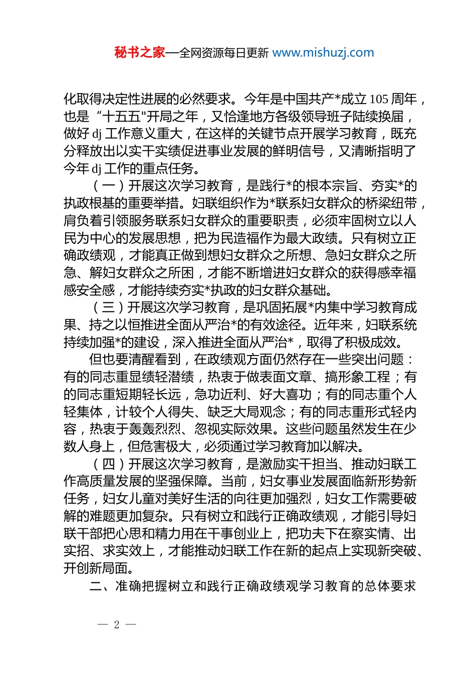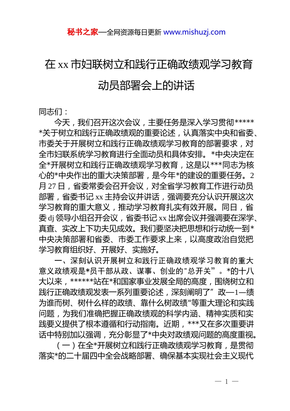 秘书之家—全网资源每日更新 www.mishuzj.com在 xx 市妇联树立和践行正确政绩观学习教育动员部署会上的讲话同志们:今天,我们召开这次会议,主要任务是深入学习贯彻******关于树立和践行正确政绩观的重要论述,认真落实中央和省委、市委关于开展树立和践行正确政绩观学习教育的部署要求,对全市妇联系统学习教育进行全面动员和具体安排。*中央决定在全*开展树立和践行正确政绩观学习教育,这是以***同志为核心的*中央作出的重大决策部署,是今年*的建设的重要任务。2月 27 日,省委常委会召开会议,对全省学习教育工作进行动员部署,省委书记 xx 主持会议并讲话,强调要充分认识开展这次学习教育的重大意义,推动学习教育扎实有效开展。同日,省委 dj 领导小组召开会议,省委书记 xx 出席会议并强调要在深学、真查、实改上下功夫见成效。我们要坚决把思想和行动统一到*中央决策部署和省委、市委工作要求上来,以高度政治自觉把学习教育组织好、开展好、实施好。一、深刻认识开展树立和践行正确政绩观学习教育的重大意义政绩观是*员干部从政、谋事、创业的"总开关”。*的十八大以来,******站在*和国家事业发展全局的高度,围绕树立和践行正确政绩观发表一系列重要论述,深刻阐明了”政—1—绩为谁而树、树什么样的政绩、靠什么树政绩"等重大理论和实践问题,为我们准确把握正确政绩观的科学内涵、精神实质和实践要义提供了根本遵循和行动指南。近期,***又在多次重要讲话中特别加以强调,充分彰显了*中央对政绩观问题的高度重视。(一)在全*开展树立和践行正确政绩观学习教育,是贯彻落实*的二十届四中全会战略部署、确保基本实现社会主义现代— 1 —秘书之家—全网资源每日更新 www.mishuzj.com化取得决定性进展的必然要求。今年是中国共产*成立 105 周年,也是“十五五"开局之年,又恰逢地方各级领导班子陆续换届,做好 dj 工作意义重大,在这样的关键节点开展学习教育,既充分释放出以实干实绩促进事业发展的鲜明信号,又清晰指明了今年 dj 工作的重点任务。(一)开展这次学习教育,是践行*的根本宗旨、夯实*的执政根基的重要举措。妇联组织作为*联系妇女群众的桥梁纽带,肩负着引领服务联系妇女群众的重要职责,必须牢固树立以人民为中心的发展思想,把为民造福作为最大政绩。只有树立正确政绩观,才能真正做到想妇女群众之所想、急妇女群众之所急、解妇女群众之所困,才能不断增进妇女群众的获得感幸福感安全感,才能持续夯实*执政的妇女群众基础。(三)开展这次学习教育,是巩固拓展*内集中学习教育成果、持之以恒推进全面从严治*的有效途径。近年来,妇联系统持续加强*的建设,深入推进全面从严治*,取得了积极成效。但也要清醒看到,在政绩观方面仍然存在一些突出问题:有的同志重显绩轻潜绩,热衷于做表面文章、搞形象工程;有的同志重短期轻长远,急功近利、好大喜功;有的同志重个人轻集体,计较个人得失、缺乏大局观念;有的同志重形式轻内容,热衷于轰轰烈烈、忽视实际效果。这些问题虽然发生在少数人身上,但危害极大,必须通过学习教育加以解决。(四)开展这次学习教育,是激励实干担当、推动妇联工作高质量发展的坚强保障。当前,妇女事业发展面临新形势新任务,妇女儿童对美好生活的向往更加强烈,妇女工作需要破解的难题更加复杂。只有树立和践行正确政绩观,才能引导妇联干部把心思和精力用在干事创业上,把功夫下在察实情、出实招、求实效上,才能推动妇联工作在新的起点上实现新突破、开创新局面。二、准确把握树立和践行正确政绩观学习教育的总体要求— 2 —秘书之家—全网资源每日更新 www.mishuzj.com开展学习教育,必须牢牢把握总要求,把”立*为公、为民造福、科学决策、真抓实干"总要求贯穿学习教育全过程各方面,一体贯彻、全面落实,推动学习教育扎实有效开展。(一)坚持立*为公,就要始终牢记妇联组织是*领导的人民团体,必须把*的领导贯穿妇联工作各方面全过程,自觉在思想上政治上行动上同以***同志为核心的*中央保持高度一致,要坚持用**************思想武装头脑、指导实践、推动工作,深刻领悟"两个确立"的决定性...