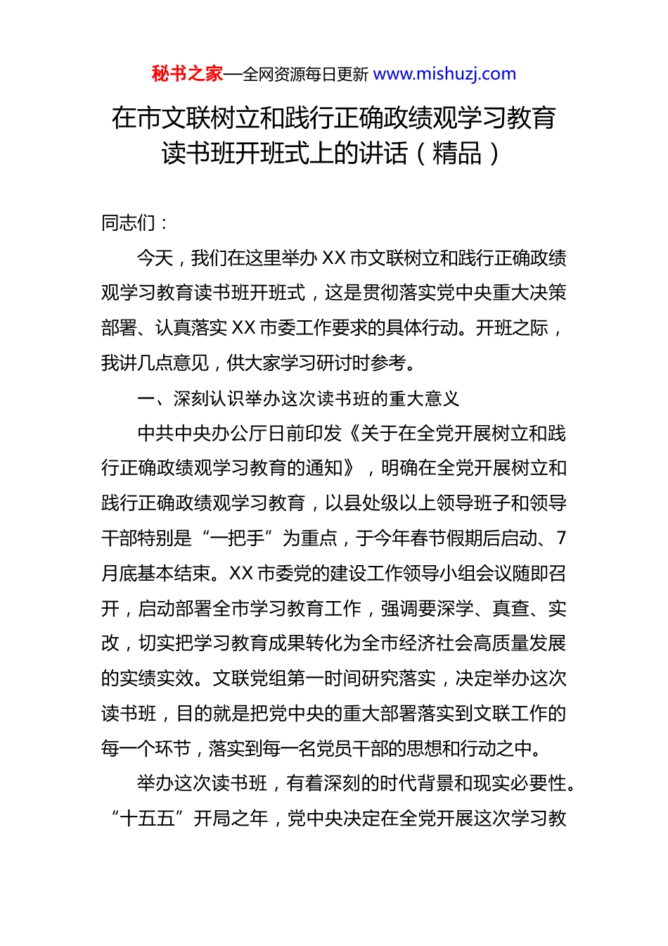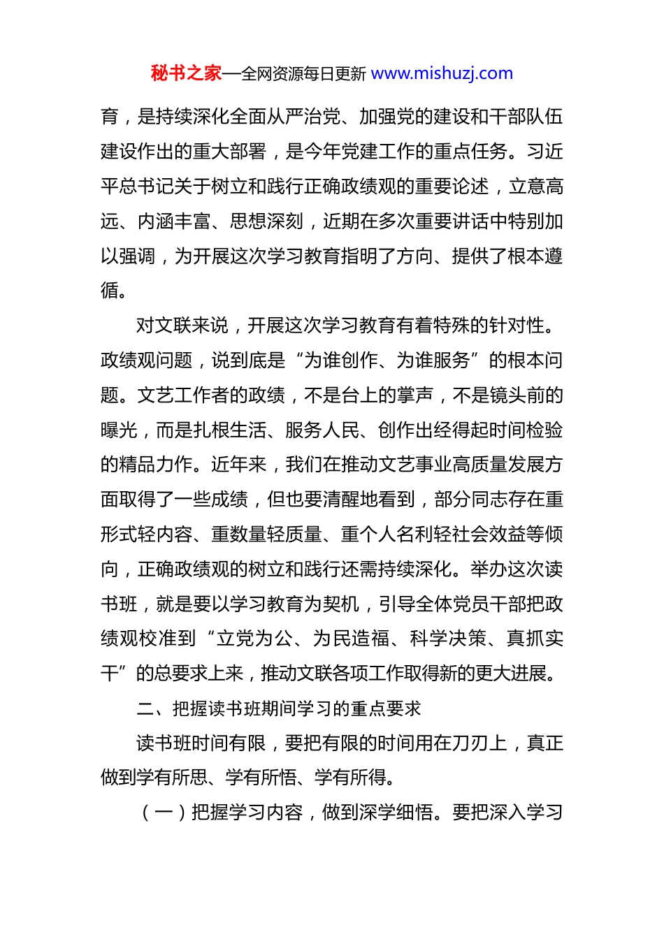 秘书之家—全网资源每日更新 www.mishuzj.com在市文联树立和践行正确政绩观学习教育读书班开班式上的讲话(精品)同志们:今天,我们在这里举办 XX 市文联树立和践行正确政绩观学习教育读书班开班式,这是贯彻落实党中央重大决策部署、认真落实 XX 市委工作要求的具体行动。开班之际,我讲几点意见,供大家学习研讨时参考。一、深刻认识举办这次读书班的重大意义中共中央办公厅日前印发《关于在全党开展树立和践行正确政绩观学习教育的通知》,明确在全党开展树立和践行正确政绩观学习教育,以县处级以上领导班子和领导干部特别是“一把手”为重点,于今年春节假期后启动、7月底基本结束。XX 市委党的建设工作领导小组会议随即召开,启动部署全市学习教育工作,强调要深学、真查、实改,切实把学习教育成果转化为全市经济社会高质量发展的实绩实效。文联党组第一时间研究落实,决定举办这次读书班,目的就是把党中央的重大部署落实到文联工作的每一个环节,落实到每一名党员干部的思想和行动之中。举办这次读书班,有着深刻的时代背景和现实必要性。“十五五”开局之年,党中央决定在全党开展这次学习教秘书之家—全网资源每日更新 www.mishuzj.com育,是持续深化全面从严治党、加强党的建设和干部队伍建设作出的重大部署,是今年党建工作的重点任务。习近平总书记关于树立和践行正确政绩观的重要论述,立意高远、内涵丰富、思想深刻,近期在多次重要讲话中特别加以强调,为开展这次学习教育指明了方向、提供了根本遵循。对文联来说,开展这次学习教育有着特殊的针对性。政绩观问题,说到底是“为谁创作、为谁服务”的根本问题。文艺工作者的政绩,不是台上的掌声,不是镜头前的曝光,而是扎根生活、服务人民、创作出经得起时间检验的精品力作。近年来,我们在推动文艺事业高质量发展方面取得了一些成绩,但也要清醒地看到,部分同志存在重形式轻内容、重数量轻质量、重个人名利轻社会效益等倾向,正确政绩观的树立和践行还需持续深化。举办这次读书班,就是要以学习教育为契机,引导全体党员干部把政绩观校准到“立党为公、为民造福、科学决策、真抓实干”的总要求上来,推动文联各项工作取得新的更大进展。二、把握读书班期间学习的重点要求读书班时间有限,要把有限的时间用在刀刃上,真正做到学有所思、学有所悟、学有所得。(一)把握学习内容,做到深学细悟。要把深入学习秘书之家—全网资源每日更新 www.mishuzj.com《习近平关于树立和践行正确政绩观论述摘编》作为核心任务,逐字逐句研读,深刻领会习近平总书记关于政绩观的系列重要论述的精髓要义。一是把握“为谁出政绩”这一根本问题,深刻理解“政绩为民”的价值取向,真正弄清楚文艺工作的出发点和落脚点始终是人民群众。二是把握“出什么样的政绩”这一核心问题,深刻理解“科学决策、真抓实干”的内在要求,防止和克服文艺工作中的急功近利、浮躁浮夸风气。三是把握“如何出政绩”这一实践问题,深刻理解“打基础、利长远”的工作导向,增强做好文艺工作的历史耐心和战略定力。与此同时,要贯通学习习近平总书记关于文艺工作的重要论述,将政绩观学习教育与深入学习习近平文化思想有机结合,做到相互印证、融会贯通。(二)把握学习方法,做到真学真悟。读书班不是走过场,不是念文件、抄笔记,而是要真正把自己摆进去、把职责摆进去、把工作摆进去,做到知行合一。要坚持集中学与自主学相结合,既认真参加集体研讨,也利用课余时间深入钻研原著原文,做到融会贯通。要坚持学习与思考相结合,带着问题学、联系实际学,对照“立党为公、为民造福、科学决策、真抓实干”总要求,认真检视自身在政绩观方面存在的问题和不足,做到学思并进。要坚持秘书之家—全网资源每日更新 www.mishuzj.com学习与交流相结合,在研讨发言中敞开心扉、坦诚交流,通过相互启发、碰撞思想,共同深化对正确政绩观的认识和理解,做到以学促悟。(三)把握学习纪律,做到严守规矩。读书班期间,全体参学人员要严格遵守学习纪律,按时参加各项学习活动,不得无故缺席、迟到早退。要保持手机静音,专心投入学习,不做与学习无关的事...