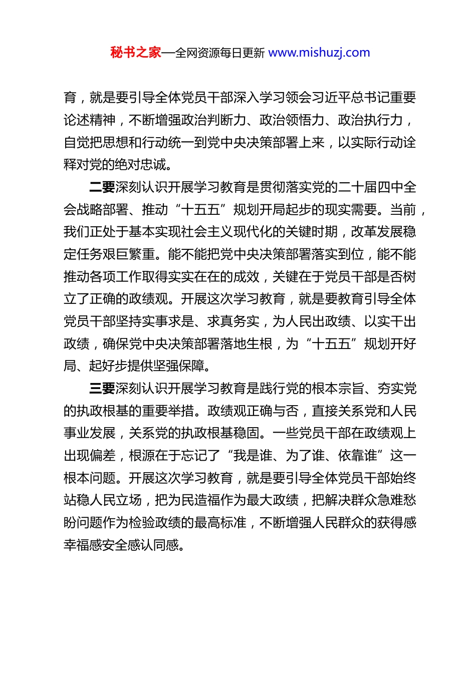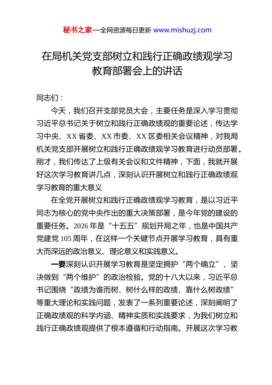 秘书之家—全网资源每日更新 www.mishuzj.com在局机关党支部树立和践行正确政绩观学习教育部署会上的讲话 同志们:今天,我们召开支部党员大会,主要任务是深入学习贯彻习近平总书记关于树立和践行正确政绩观的重要论述,传达学习中央、XX 省委、XX 市委、XX 区委相关会议精神,对我局机关党支部开展树立和践行正确政绩观学习教育进行动员部署。刚才,我们传达了上级有关会议和文件精神,下面,我就开展好这次学习教育讲几点,深刻认识开展树立和践行正确政绩观学习教育的重大意义在全党开展树立和践行正确政绩观学习教育,是以习近平同志为核心的党中央作出的重大决策部署,是今年党的建设的重要任务。2026 年是“十五五”规划开局之年,也是中国共产党建党 105 周年,在这样一个关键节点开展学习教育,具有重大而深远的政治意义、理论意义和实践意义。一要深刻认识开展学习教育是坚定拥护“两个确立”、坚决做到“两个维护”的政治检验。党的十八大以来,习近平总书记围绕“政绩为谁而树、树什么样的政绩、靠什么树政绩”等重大理论和实践问题,发表了一系列重要论述,深刻阐明了正确政绩观的科学内涵、精神实质和实践要求,为我们树立和践行正确政绩观提供了根本遵循和行动指南。开展这次学习教秘书之家—全网资源每日更新 www.mishuzj.com育,就是要引导全体党员干部深入学习领会习近平总书记重要论述精神,不断增强政治判断力、政治领悟力、政治执行力,自觉把思想和行动统一到党中央决策部署上来,以实际行动诠释对党的绝对忠诚。二要深刻认识开展学习教育是贯彻落实党的二十届四中全会战略部署、推动“十五五”规划开局起步的现实需要。当前,我们正处于基本实现社会主义现代化的关键时期,改革发展稳定任务艰巨繁重。能不能把党中央决策部署落实到位,能不能推动各项工作取得实实在在的成效,关键在于党员干部是否树立了正确的政绩观。开展这次学习教育,就是要教育引导全体党员干部坚持实事求是、求真务实,为人民出政绩、以实干出政绩,确保党中央决策部署落地生根,为“十五五”规划开好局、起好步提供坚强保障。三要深刻认识开展学习教育是践行党的根本宗旨、夯实党的执政根基的重要举措。政绩观正确与否,直接关系党和人民事业发展,关系党的执政根基稳固。一些党员干部在政绩观上出现偏差,根源在于忘记了“我是谁、为了谁、依靠谁”这一根本问题。开展这次学习教育,就是要引导全体党员干部始终站稳人民立场,把为民造福作为最大政绩,把解决群众急难愁盼问题作为检验政绩的最高标准,不断增强人民群众的获得感幸福感安全感认同感。秘书之家—全网资源每日更新 www.mishuzj.com四要深刻认识开展学习教育是巩固拓展党内集中学习教育成果、持之以恒推进全面从严治党的有效途径。近年来,我们先后开展了“不忘初心、牢记使命”主题教育、党史学习教育等党内集中学习教育,取得了显著成效。但也要清醒看到,政绩观偏差问题在一些党员干部中仍然不同程度存在,有的重显绩轻潜绩,有的急功近利搞形象工程,有的甚至弄虚作假欺上瞒下。开展这次学习教育,就是要发扬彻底的自我革命精神,深入查摆政绩观方面存在的突出问题,动真碰硬抓好整改整治,持续营造风清气正的良好政治生态。二、把握核心要义,全面落实树立和践行正确政绩观学习教育的目标要求开展这次学习教育,要牢牢把握“立党为公、为民造福、科学决策、真抓实干”的总要求,坚持学查改一体推进,着力在深学、真查、实改上下功夫见成效。一要坚持立党为公,把准政治方向。立党为公是正确政绩观的政治灵魂,回答的是“政绩为谁而树”的根本问题。全体党员干部要始终牢记党的宗旨,把党的事业放在心中最高位置,把对党忠诚、为党分忧、为党尽职、为民造福作为根本政治担当。要自觉在思想上政治上行动上同以习近平同志为核心的党中央保持高度一致,坚决贯彻落实党中央决策部署和上级党委工作要求,确保政绩创造的正确政治方向。秘书之家—全网资源每日更新 www.mishuzj.com二要坚持为民造福,站稳人民立场。为民造福是正确政绩观的价值追求,是党的根本宗旨在政绩观上的集中体现。全体党员干部要牢固树...