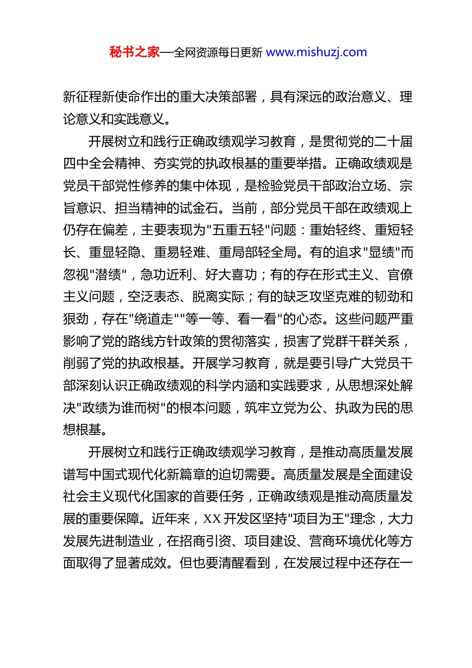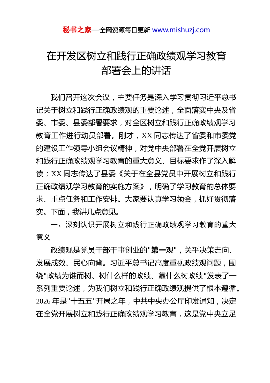 秘书之家—全网资源每日更新 www.mishuzj.com在开发区树立和践行正确政绩观学习教育部署会上的讲话 我们召开这次会议,主要任务是深入学习贯彻习近平总书记关于树立和践行正确政绩观的重要论述,全面落实中央及省委、市委、县委部署要求,对全区树立和践行正确政绩观学习教育工作进行动员部署。刚才,XX 同志传达了省委和市委党的建设工作领导小组会议精神,对党中央部署在全党开展树立和践行正确政绩观学习教育的重大意义、目标要求作了深入解读;XX 同志传达了县委《关于在全县党员中开展树立和践行正确政绩观学习教育的实施方案》,明确了学习教育的总体要求、重点任务和工作安排。大家要认真学习领会,抓好贯彻落实。下面,我讲几点意见。一、深刻认识开展树立和践行正确政绩观学习教育的重大意义政绩观是党员干部干事创业的"第一观",关乎决策走向、发展成效、民心向背。习近平总书记高度重视政绩观问题,围绕"政绩为谁而树、树什么样的政绩、靠什么树政绩"发表了一系列重要论述,为我们树立和践行正确政绩观提供了根本遵循。2026 年是"十五五"开局之年,中共中央办公厅印发通知,决定在全党开展树立和践行正确政绩观学习教育,这是党中央立足秘书之家—全网资源每日更新 www.mishuzj.com新征程新使命作出的重大决策部署,具有深远的政治意义、理论意义和实践意义。开展树立和践行正确政绩观学习教育,是贯彻党的二十届四中全会精神、夯实党的执政根基的重要举措。正确政绩观是党员干部党性修养的集中体现,是检验党员干部政治立场、宗旨意识、担当精神的试金石。当前,部分党员干部在政绩观上仍存在偏差,主要表现为"五重五轻"问题:重始轻终、重短轻长、重显轻隐、重易轻难、重局部轻全局。有的追求"显绩"而忽视"潜绩",急功近利、好大喜功;有的存在形式主义、官僚主义问题,空泛表态、脱离实际;有的缺乏攻坚克难的韧劲和狠劲,存在"绕道走""等一等、看一看"的心态。这些问题严重影响了党的路线方针政策的贯彻落实,损害了党群干群关系,削弱了党的执政根基。开展学习教育,就是要引导广大党员干部深刻认识正确政绩观的科学内涵和实践要求,从思想深处解决"政绩为谁而树"的根本问题,筑牢立党为公、执政为民的思想根基。开展树立和践行正确政绩观学习教育,是推动高质量发展谱写中国式现代化新篇章的迫切需要。高质量发展是全面建设社会主义现代化国家的首要任务,正确政绩观是推动高质量发展的重要保障。近年来,XX 开发区坚持"项目为王"理念,大力发展先进制造业,在招商引资、项目建设、营商环境优化等方面取得了显著成效。但也要清醒看到,在发展过程中还存在一秘书之家—全网资源每日更新 www.mishuzj.com些不容忽视的问题:有的项目重引进轻服务,企业落地后遇到的实际困难解决不够及时;有的工作重部署轻落实,跟踪问效机制不够健全;有的干部重当前轻长远,对打基础、利长远的工作重视不够。这些问题的根源,都可以追溯到政绩观上存在偏差。开展学习教育,就是要引导广大党员干部牢固树立正确政绩观,坚持实事求是、真抓实干,以正确政绩观引领高质量发展高效能治理,奋力谱写先进制造业开发区推进中国式现代化新篇章。开展树立和践行正确政绩观学习教育,是解决群众急难愁盼问题、增进民生福祉的内在要求。为民造福是最大政绩。正确政绩观的核心是以人民为中心,把人民对美好生活的向往作为奋斗目标。当前,群众在就业、教育、医疗、养老、住房等方面还有不少急难愁盼问题需要解决。开展学习教育,就是要引导广大党员干部弘扬"四下基层"优良传统,深入基层、深入群众、深入一线,倾听呼声、体察情绪、解决实际问题,把学习教育成果转化为解决群众急难愁盼问题的实际行动,不断增强人民群众的获得感、幸福感、安全感。二、准确把握树立和践行正确政绩观学习教育的目标任务根据中央部署和省委、市委、县委要求,这次学习教育以县处级以上领导班子和领导干部特别是"一把手"为重点,全体党员干部参加,从 2026 年春节假期后启动,7 月底基本结束。我们要紧扣"立党为公、为民造福、科学决策、真抓实干"总要秘书之家—全网资源每日更新 www.mishuzj.com求...