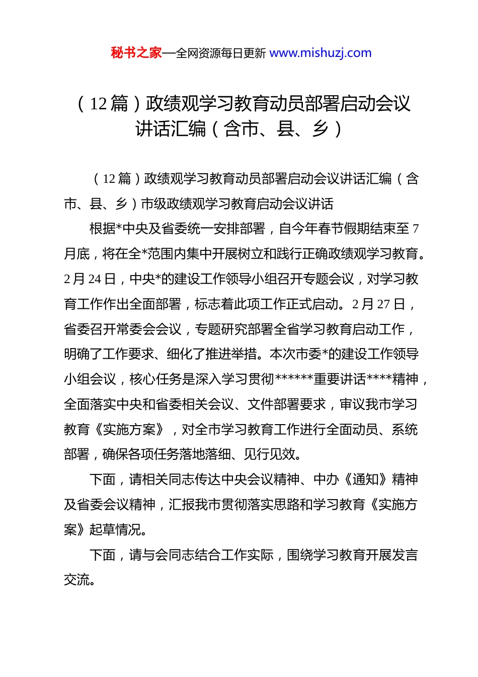秘书之家—全网资源每日更新 www.mishuzj.com(12 篇)政绩观学习教育动员部署启动会议讲话汇编(含市、县、乡)(12 篇)政绩观学习教育动员部署启动会议讲话汇编(含市、县、乡)市级政绩观学习教育启动会议讲话根据*中央及省委统一安排部署,自今年春节假期结束至 7月底,将在全*范围内集中开展树立和践行正确政绩观学习教育。2 月 24 日,中央*的建设工作领导小组召开专题会议,对学习教育工作作出全面部署,标志着此项工作正式启动。2 月 27 日,省委召开常委会会议,专题研究部署全省学习教育启动工作,明确了工作要求、细化了推进举措。本次市委*的建设工作领导小组会议,核心任务是深入学习贯彻******重要讲话****精神,全面落实中央和省委相关会议、文件部署要求,审议我市学习教育《实施方案》,对全市学习教育工作进行全面动员、系统部署,确保各项任务落地落细、见行见效。下面,请相关同志传达中央会议精神、中办《通知》精神及省委会议精神,汇报我市贯彻落实思路和学习教育《实施方案》起草情况。下面,请与会同志结合工作实际,围绕学习教育开展发言交流。秘书之家—全网资源每日更新 www.mishuzj.com刚才,相关同志传达了中央、省委有关会议及文件精神,详细汇报了我市贯彻落实意见和《实施方案》起草情况,与会同志作了很好的发言,提出的意见建议具有很强的针对性和可操作性,对《实施方案》原则同意。会后,请相关部门结合大家的发言,抓紧修改完善《实施方案》,按程序印发执行。在全*开展树立和践行正确政绩观学习教育,是今年*的建设工作的重点任务,事关全面从严治*向纵深推进,事关高质量发展全局。******高度重视此项工作,亲自确定学习教育主题、审定相关文件和工作安排,多次作出****批示,为我们开展好学习教育提供了根本遵循。中央领导同志在中央*的建设工作领导小组会议上,就抓实学习教育各项工作提出明确要求、作出具体部署。省委主要领导强调,要以高度的政治自觉扎实开展学习教育,以实干实绩推动区域高质量发展。全市各级*组织要切实提高政治站位,认真学习贯彻******重要讲话****精神,全面落实*中央和省委部署要求,以高度的责任感和使命感扎实开展此次学习教育,以正确政绩观引领各项事业高质量发展。下面,我强调三点意见。一、提高政治站位、深化思想认识,深刻把握开展学习教育的重大意义此次学习教育,是以***同志为核心的*中央作出的重大政秘书之家—全网资源每日更新 www.mishuzj.com治部署,是新时代加强*的建设、锤炼干部队伍的重要举措。各级*组织要切实把开展学习教育作为重要政治任务,摆上突出位置、抓实抓细抓好,切实把思想和行动统一到*中央决策部署上来。第一,开展学习教育,是深入学习、精准领悟、坚决践行******关于树立和践行正确政绩观重要论述的具体实践。*的十八大以来,******围绕树立和践行正确政绩观,发表一系列重要讲话、作出一系列****,深刻回答了“政绩为谁而树、树什么样的政绩、靠什么树政绩”等根本性问题,为广大*员干部履职尽责、干事创业提供了行动指南。我们要站在坚定拥护“两个确立”、坚决做到“两个维护”的政治高度,深学细悟、笃行实干,切实把******重要论述融入工作全过程、体现到具体行动上。第二,开展学习教育,是*中央在关键节点、重要阶段作出的战略性部署。今年是中国共产*成立 105 周年,是“十五五”开局起步的关键之年,也是市县乡领导班子集中换届后的第一年。在这样一个重要时间节点开展学习教育,既是全面从严治*、锻造过硬干部队伍的内在要求,也是应对新形势新挑战、推动事业高质量发展的迫切需要,对凝聚奋进力量、推进*和国家事业发展具有重大而深远的意义。我们要深刻认识开展学习教育秘书之家—全网资源每日更新 www.mishuzj.com的重要性和紧迫性,切实增强思想自觉、政治自觉、行动自觉,坚决把*中央部署要求落到实处。第三,开展学习教育,是深化干部能力作风建设、推动区域高质量发展的必然要求。此次学习教育明确提出“立*为公、为民造福、科学决策、真抓实干”的总要求,这既是深化干部能力作风建设的具体标准,也是衡量各级领导班子和领导干部履职...