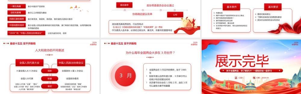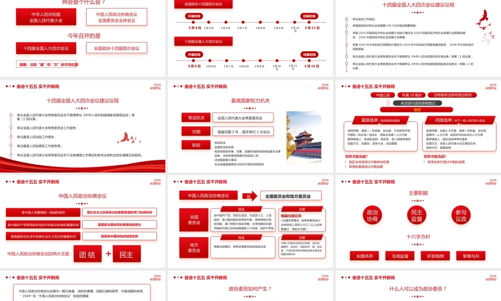 两会知识帖2026全国两会关于全国两会,你了解多少?一组知识帖一起学习汇报人:日期: 2026.XX奋进十五五 实干开新局2026全国两会中华人民共和国全国人民代表大会两会是个什么会?中国人民政治协商会议全国委员会全体会议十四届全国人大四次会议今年召开的是全国政协十四届四次会议提醒:注意“届”和“次”的不同位置奋进十五五 实干开新局2026全国两会 开幕时间 闭幕时间3 月 4 日3 月 5 日3 月 6 日3 月 7 日3 月 8 日3 月 9 日3 月 11 日3 月 10日全国政协十四届四次会议十四届全国人大四次会议 开幕时间 闭幕时间3 月 5 日3 月 6 日3 月 7 日3 月 8 日3 月 9 日3 月 10日3 月 12 日3 月 11日奋进十五五 实干开新局2026全国两会十四届全国人大四次会议建议议程审议政府工作报告 ;审查国民经济和社会发展第十五个五年规划纲要草案 ;审查 2025 年国民经济和社会发展计划执行情况与 2026 年国民经济和社会发展计划草案的报告、 2026 年国民经济和社会发展计划草案 ;审查 2025 年中央和地方预算执行情况与 2026 年中央和地方预算草案的报告、 2026 年中央和地方预算草案 ;审议全国人民代表大会常务委员会关于提请审议《中华人民共和国生态环境法典(草案)》的议案;审议全国人民代表大会常务委员会关于提请审议《中华人民共和国民族团结进步促进法(草案)》的议案;奋进十五五 实干开新局2026全国两会十四届全国人大四次会议建议议程审议全国人民代表大会常务委员会关于提请审议《中华人民共和国国家发展规划法(草案)》的议案 ;审议全国人民代表大会常务委员会工作报告;审议最高人民法院工作报告;审议最高人民检察院工作报告等。审议全国人民代表大会常务委员会关于法律清理工作情况和有关法律和决定处理意见的报告。奋进十五五 实干开新局2026全国两会最高国家权力机关常设机关全国人民代表大会常委委员会任期每届任期 5 年,每年举行 1 次会议职权修改宪法监督宪法的实施制定和修改刑事、民事、国家机构的和其他的基本法律选举、决定和罢免国家机构组成人员决定国家重大事项应当由最高国家权力机关行使的其他职权奋进十五五 实干开新局2026全国两会直接选举(选民直接投票选举)适用范围:县级( ( 包括县、自治县、不设区的市和市辖区 ) 和乡级 ( 包括乡、民族乡和镇 ) 人大代表推荐候选人:各选区选民、各政党、各人民团体提名投票方式:投票站;选举大会;流动票箱怎样才能当选?l选区全体选民过半数参加投票l获得投票选民过半数选票间接选举(由下一级人民代表大会选举)适用范围:全国人大代表,省级 ( 包括省、自治区、直辖市 ) 人大代表 , 设区的市和自治州人大代表推荐候选人:选区或选举单位提名投票方式:该级人民代表大会主席团主持选举方式:差额选举怎样才能当选?l获得全体代表过半数的选票中国公民年满 18 周岁没有被依法剥夺政治权利依法进行选民资格登记选民奋进十五五 实干开新局2026全国两会中国人民政治协商会议是中国人民爱国统一战线的组织是社会主义协商民主的重要渠道和专门协商机构是中国共产党领导的多党合作和政治协商的重要机构是国家治理体系的重要组成部分是我国政治生活中发扬社会主义民主的重要形式是具有中国特色的制度安排中国人民政治协商会议的两大主题 :团 结民主+奋进十五五 实干开新局2026全国两会中国人民政治协商会议全国委员会和地方委员会设全国委员会地方委员会由中国共产党、各民主党派、无党派人士、人民团体、各少数民族和各界的代表,香港特别行政区同胞、澳门特别行政区同胞、台湾同胞和归国侨胞的代表以及特别邀请的人士组成 , 设若干界别组成每届任期五年( 如遇非常情况 , 由常务委员会以全体组成人员的三分之二以上的多数通过,得延长任期)任期根据当地情况,参照全国委员会的组成决定组成中国人民政治协商会议的省、自治区、直辖市、自治州、设区的市、县、自治县、不设区的市和市辖区的地方委员会每届任期五年任期奋进十五五 实干开新局2026全国两会主要职能十六字方针政治协商民主监督参与议政长期共存...