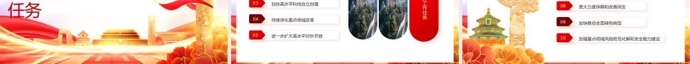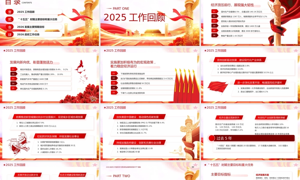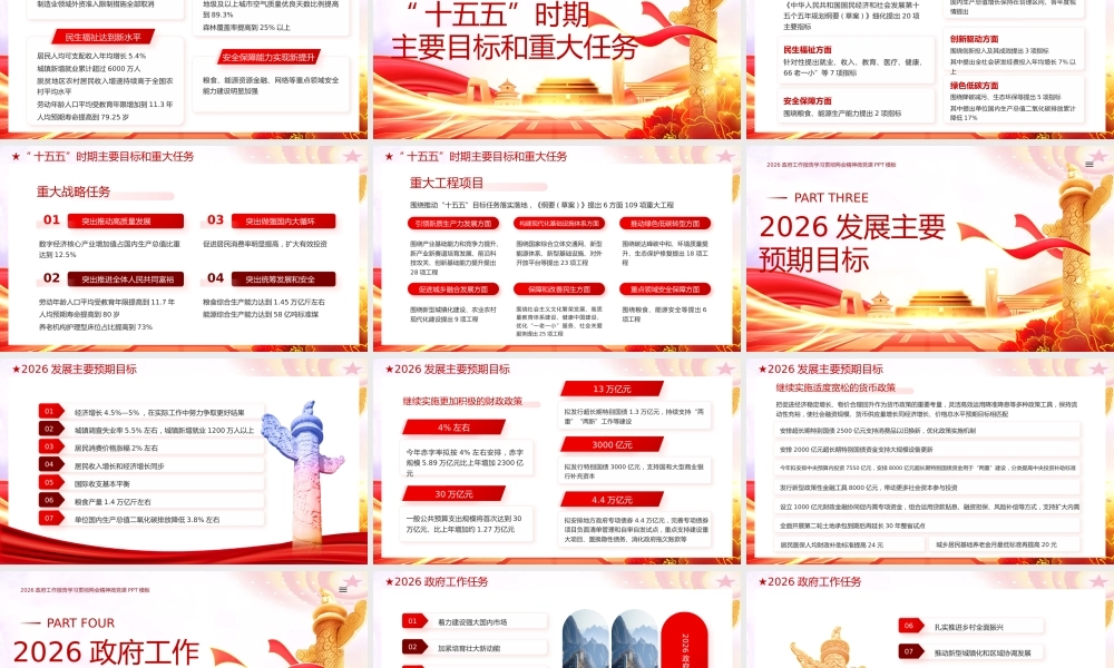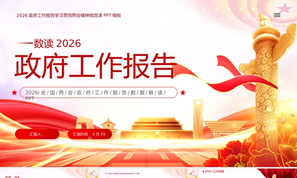 政府工作报告汇报时间: X 月 XX日汇报人:2026/ 全 / 国 / 两 / 会 / 政 / 府 / 工 / 作 / 报 / 告 / 数 / 据 / 解 / 读 /PPT2026 政府工作报告学习贯彻两会精神微党课 PPT 模板数读 20262025 工作回顾壹“ 十五五”时期主要目标和重大任务贰2026 发展主要预期目标叁2026 政府工作任务肆目 录 CONTENTS2025 工作回顾2026 政府工作报告学习贯彻两会精神微党课 PPT 模板PART ONE★2025 工作回顾经济顶压前行、展现强大韧性国内生产总值增长 5% ,总量达到 140.19 万亿元01城镇新增就业 1267 万人,城镇调查失业率平均为 5.2%02居民收入增长和经济增长同步03实施学前一年免费教育政策、惠及 1400 万儿童04全面实施育儿补贴制度、惠及 3000 多万婴幼儿05粮食产量达到 1.43 万亿斤06★2025 工作回顾发展向新向优、彰显蓬勃活力高技术制造业、装备制造业增加值分别增长 9.4% 、 9.2%01工业机器人、集成电路产量分别增长 28% 、 10.9%02新能源汽车年产量超过 1600 万辆03电动汽车充电设施突破 2000 万个04单位国内生产总值能耗降低 5.1%05★2025 工作回顾实施更加积极有为的宏观政策,着力稳定经济运行下调政策利率和存款准备金率01加力扩围实施消费品以旧换新,带动商品销售额超过 2.6 万亿元02社会消费品零售总额突破 50 万亿元03设备购置投资增长 11.8%04下调个人住房公积金贷款利率05★2025 工作回顾1. 全社会研发经费投入强度达到 2.8%2. 技术合同成交额增长 10.8%3. 数字经济核心产业增加值占国内生产总值比重提高到 10.5% 以上坚持创新驱动发展,建设现代化产业体系1. 实施全国统一大市场建设指引,出台新版市场准入负面清单2. 进出口量稳质升,出口增长 6.1%进一步深化改革开放,畅通国民经济循环★2025 工作回顾1. 常住人口城镇化率达到 67.9%2. 脱贫人口务工就业规模稳定在 3000 万人以上统筹推进新型城镇化和乡村全面振兴,促进城乡区域协调发展1. 长期护理保险制度覆盖 3 亿人2. 城乡居民基础养老金月最低标准提高 20 元3. 国内出游人次增长 16.2%4. 入境旅游人次增长 17.1%切实抓好民生保障,积极发展社会事业★2025 工作回顾1. 地级及以上城市细颗粒物 (PM2.5) 平均浓度下降 4.4%2. 地表水水质优良断面比例提高到 91.4%3. 新型储能装机规模超过 1.3 亿千瓦4. 非化石能源消费占比达到 21.7%加快美丽中国建设,推动绿色低碳发展1. 提请全国人大常委会审议法律议案 13 件2. 制定修订行政法规 30 部持续加强政府建设,创新和完善社会治理★2025 工作回顾经济总量实现新跃升国内生产总值连续跨越 110 万亿元、 120 万亿元、 130 万亿元、140 万亿元台阶,年均增长 5.4%科技和产业创新取得新突破全社会研发经费投入年均增长 10%每万人口高价值发明专利拥有量达到 16件制造业增加值规模连续 16 年保持全球第一过去 5 年“ 十四五”规划《纲要》确定的 20 项主要指标、 17 方面重大战略任务、 102 项重大工程项目胜利完成★2025 工作回顾改革开放迈出新步伐制造业领域外资准入限制措施全部取消生态文明建设取得新进步地级及以上城市空气质量优良天数比例提高到 89.3%森林覆盖率提高到 25% 以上民生福祉达到新水平居民人均可支配收入年均增长 5.4%城镇新增就业累计超过 6000 万人脱贫地区农村居民收入增速持续高于全国农村平均水平劳动年龄人口平均受教育年限增加到 11.3 年人均预期寿命提高到 79.25 岁安全保障能力实现新提升粮食、能源资源金融、网络等重点领域安全能力建设明显加强“ 十五五”时期主要目标和重大任务2026 政府工作报告学习贯彻两会精神微党课 PPT 模板PART TWO★“ 十五五”时期主要目标和重大任务主要目标指标《中华人民共和国国民经济和社会发展第十五个五年规划纲要 ( 草案 ) 》细化提出 20 项主要指标安全保障方面围绕粮食、能源生产能力提出 2 项指标民生福祉方面针对性提出就业、收入、教育、医疗、健康、66 老一小”等 7 项指标经济发展方面围绕增长、结构、效率提出 ...