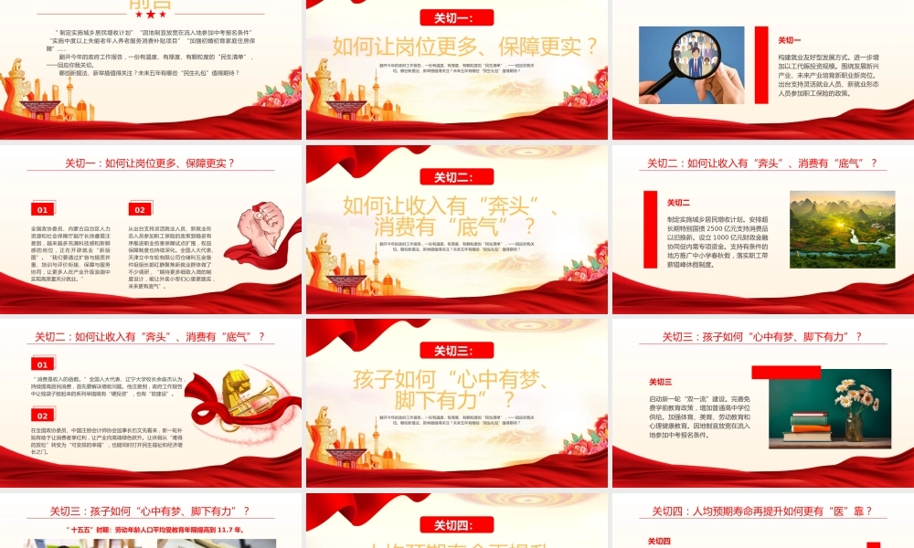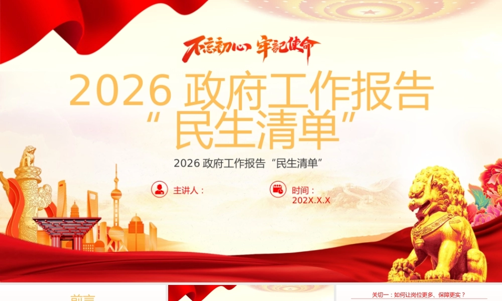 2026 政府工作报告“ 民生清单”2026 政府工作报告“民生清单”主讲人:时间:202X.X.X前言 “ 制定实施城乡居民增收计划”“因地制宜放宽在流入地参加中考报名条件”“实施中度以上失能老年人养老服务消费补贴项目”“加强初婚初育家庭住房保障”…… 翻开今年的政府工作报告,一份有温度、有厚度、有颗粒度的“民生清单”,一一回应你我关切。 哪些新提法、新举措值得关注?未来五年有哪些“民生礼包”值得期待?翻开今年的政府工作报告,一份有温度、有厚度、有颗粒度的“民生清单”,一一回应你我关切。哪些新提法、新举措值得关注?未来五年有哪些“民生礼包”值得期待?如何让岗位更多、保障更实?关切一:关切一:如何让岗位更多、保障更实?关切一构建就业友好型发展方式。进一步增加以工代赈投资规模。围绕发展新兴产业、未来产业培育新职业新岗位。出台支持灵活就业人员、新就业形态人员参加职工保险的政策。关切一:如何让岗位更多、保障更实?全国政协委员、内蒙古自治区人力资源和社会保障厅副厅长徐睿霞注意到,越来越多充满科技感和新鲜感的岗位,正在开辟就业 “新版图”。“我们要通过扩容与提质并重、培训与评价衔接、保障与服务协同,让更多人在产业升级浪潮中实现高质量充分就业。”01从出台支持灵活就业人员、新就业形态人员参加职工保险的政策到稳妥有序推进职业伤害保障试点扩围,权益保障制度也持续深化。全国人大代表、天津立中车轮有限公司仓储科五金备件组组长郭红静聚焦新就业群体做了不少调研,“期待更多细致入微的制度设计,能让外卖小哥们心里更踏实,未来更有底气”。02翻开今年的政府工作报告,一份有温度、有厚度、有颗粒度的“民生清单”,一一回应你我关切。哪些新提法、新举措值得关注?未来五年有哪些“民生礼包”值得期待?消费有“底气”?关切二:如何让收入有“奔头”、关切二:如何让收入有“奔头”、消费有“底气”?关切二制定实施城乡居民增收计划。安排超长期特别国债 2500 亿元支持消费品以旧换新。设立 1000 亿元财政金融协同促内需专项资金。支持有条件的地方推广中小学春秋假,落实职工带薪错峰休假制度。关切二:如何让收入有“奔头”、消费有“底气”?“ 消费是收入的函数。”全国人大代表、辽宁大学校长余淼杰认为,持续提高居民消费,首先要解决增收问题。他注意到,政府工作报告中让钱袋子鼓起来的系列举措既有“硬投资”,也有“软建设”。01在全国政协委员、中国注册会计师协会监事长石文先看来,新一轮补贴有助于让消费者享红利,让产业向高端绿色跃升。让休假从“难得的放松”转变为“可安排的幸福”,也能同时打开民生福祉和经济增长之门。02翻开今年的政府工作报告,一份有温度、有厚度、有颗粒度的“民生清单”,一一回应你我关切。哪些新提法、新举措值得关注?未来五年有哪些“民生礼包”值得期待?脚下有力”?关切三:孩子如何“心中有梦、关切三:孩子如何“心中有梦、脚下有力”?关切三启动新一轮“双一流”建设。完善免费学前教育政策,增加普通高中学位供给。加强体育、美育、劳动教育和心理健康教育。因地制宜放宽在流入地参加中考报名条件。关切三:孩子如何“心中有梦、脚下有力”?全国人大代表、辽宁省北票市尹湛纳希高级中学教科研室副主任刘宏艳认为,系列举措是对学龄人口深刻变局的积极应对,也凸显出教育理念的悄然变革。为随迁子女在流入地参加中考提供更多机会,有利于进一步促进教育公平。01 “ 十五五”时期:劳动年龄人口平均受教育年限提高到 11.7 年。全国人大代表、中山大学校长高松说,新一轮“双一流”建设瞄准国家重大战略方向,强调高等教育布局和数量的优化,将引导高校更加聚焦人才培养与学科优化。劳动年龄人口平均受教育年限继续提高,也意味着国民教育体系的持续升级,会让普通人的机会更多,国家发展的后劲更足。02翻开今年的政府工作报告,一份有温度、有厚度、有颗粒度的“民生清单”,一一回应你我关切。哪些新提法、新举措值得关注?未来五年有哪些“民生礼包”值得期待?如何更有“医”靠?关切四:人均预期寿命再提升关切四:人均预期寿命再提升如...