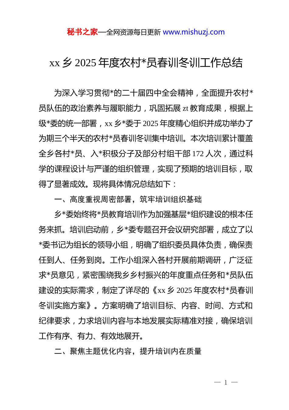 秘书之家—全网资源每日更新 www.mishuzj.comxx 乡 2025 年度农村*员春训冬训工作总结为深入学习贯彻*的二十届四中全会精神,全面提升农村*员队伍的政治素养与履职能力,巩固拓展 zt 教育成果,根据上级*委的统一部署,xx 乡*委于 2025 年度精心组织并成功举办了为期三个半天的农村*员春训冬训集中培训。本次培训累计覆盖全乡各村*员、入*积极分子及部分村组干部 172 人次,通过科学的课程设计与严谨的组织管理,实现了预期的培训目标,取得了显著成效。现将具体情况总结如下:一、高度重视周密部署,筑牢培训组织基础乡*委始终将*员教育培训作为加强基层*组织建设的根本任务来抓。培训启动前,乡*委专题召开会议研究部署,成立了以*委书记为组长的领导小组,明确了组织委员具体负责,确保责任到人、任务到岗。工作小组深入各村开展前期调研,广泛征求*员意见,紧密围绕我乡乡村振兴的年度重点任务和*员队伍建设的实际需求,制定了详尽的《xx 乡 2025 年度农村*员春训冬训实施方案》。方案明确了培训目标、内容、时间、方式和纪律要求,力求培训内容与本地发展实际精准对接,确保培训工作有序、有力、有效地展开。二、聚焦主题优化内容,提升培训内在质量— 1 —秘书之家—全网资源每日更新 www.mishuzj.com本次培训坚持理论与实践并重,政治性与实用性兼顾,课程设置聚焦核心、重点突出,力求让*员干部学有所思、学有所获、学以致用。(一)筑牢思想根基,强化政治引领培训将学习贯彻*的二十届四中全会精神作为首要政治任务。通过组织全体参训*员集中观看系列解读视频,对全会提出的新思想、新论断、新要求进行了系统深入的学习。授课专家对精神要义的精准解读,帮助*员们深刻领会了其核心内涵与实践要求,进一步统一了思想、凝聚了共识,为推动全会精神在基层落地生根奠定了坚实的理论基础。(二)借鉴先进经验,拓宽发展视野培训特别邀请了一位曾赴浙江学习“千万工程”经验的村干部进行交流分享。该同志结合自身所学所看,生动讲解了“千万工程”从整治农村人居环境入手,统筹城乡发展的成功实践及其蕴含的科学理念、系统方法和推进机制。分享内容不仅让参训*员深受启发,更重要的是引导大家思考如何因地制宜地将先进经验转化为推进本地和美乡村建设的有效路径,避免生搬硬套,为我乡的乡村振兴工作注入了新的思路与活力。(三)立足本土实践,激发内生动力为充分发挥身边榜样的示范作用,培训安排了三名来自基— 2 —秘书之家—全网资源每日更新 www.mishuzj.com层一线的优秀村干部代表,分别围绕“基层治理创新”、“特色产业发展”和“村干部队伍建设”三大主题作经验分享。他们用朴实的语言、鲜活的案例,讲述了在矛盾调解、产业项目培育、后备力量培养等工作中的心得体会和成功做法。这种源于本土的实践分享,贴近性强、说服力足,有效激发了广大*员干事创业的热情和信心,形成了比学赶超的良好氛围。(四)聚焦业务技能,提升履职能力针对农村“三资”管理不规范等潜在风险点,乡财政所有针对性地开展了“三资”管理业务培训。培训内容涵盖了资产清查、财务公开、合同管理、收益分配等关键环节的政策法规和实操流程,旨在提升村干部和*员代表的财经纪律意识和规范化管理水平,为守好农村集体“钱袋子”提供了坚实的业务保障。此外,培训还邀请了本地种粮大户分享农业生产经验,内容涉及优良品种选择、科学田间管理、病虫害防治等实用技术,将课堂搬到田间地头,服务农业生产,深受*员欢迎。三、突出实效学用转化,培训成果初步显现本次春训冬训坚持效果导向,注重学用结合,参训*员的综合素质和实践能力得到了有效提升,培训成果正逐步转化为推动工作的强大动力。(一)理论武装得到新加强,政治站位实现新提升— 3 —秘书之家—全网资源每日更新 www.mishuzj.com通过系统学习,广大*员对*的创新理论理解更加深刻,贯彻执行*的路线方针政策的自觉性和坚定性显著增强。在培训结束后的交流座谈中,*员们普遍反映,此次学习廓清了思想迷雾,明确了前进方向,服务群众、推动发展的责任感和使命感更强了。(二)发展思路得到新启发,工作方法实现新改...