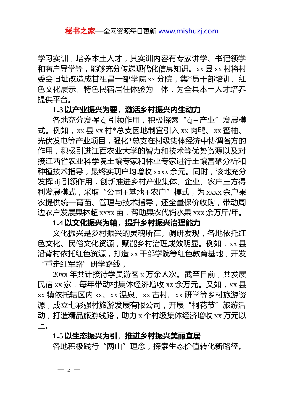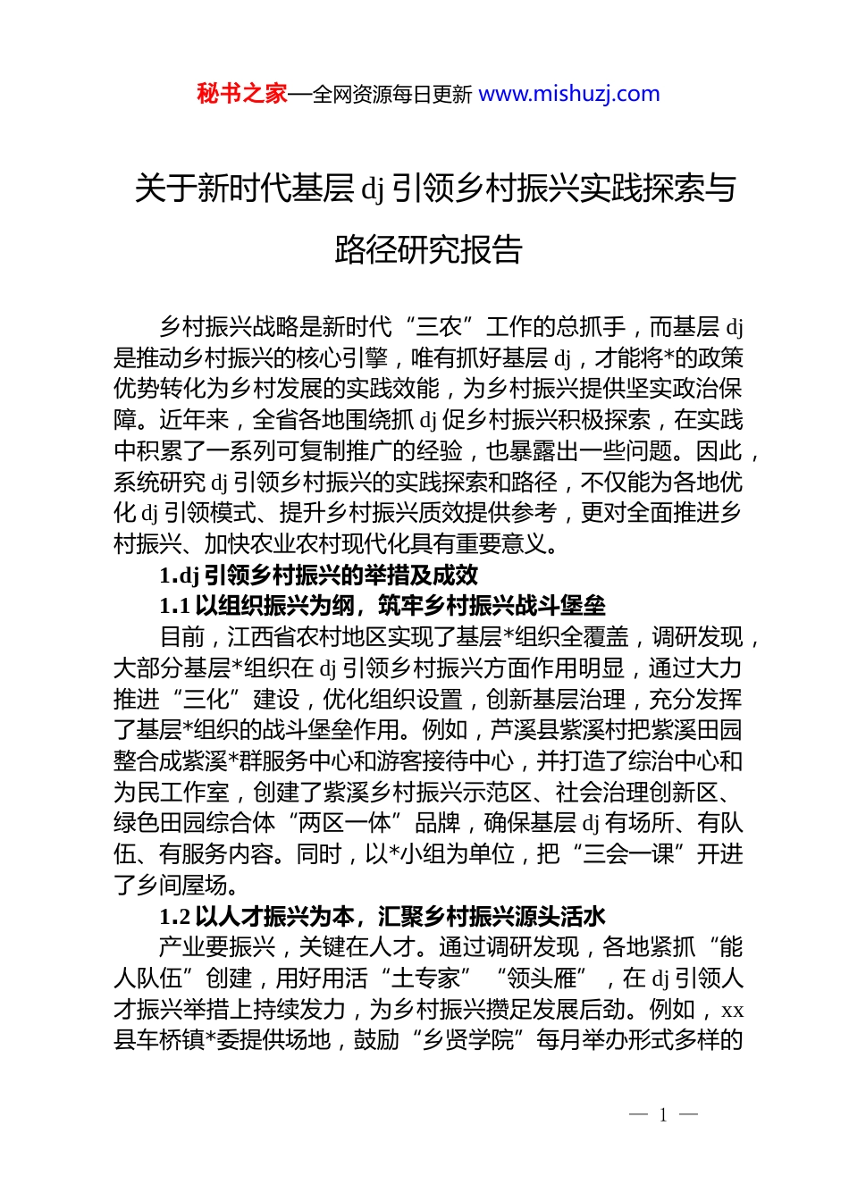 秘书之家—全网资源每日更新 www.mishuzj.com关于新时代基层 dj 引领乡村振兴实践探索与路径研究报告乡村振兴战略是新时代“三农”工作的总抓手,而基层 dj是推动乡村振兴的核心引擎,唯有抓好基层 dj,才能将*的政策优势转化为乡村发展的实践效能,为乡村振兴提供坚实政治保障。近年来,全省各地围绕抓 dj 促乡村振兴积极探索,在实践中积累了一系列可复制推广的经验,也暴露出一些问题。因此,系统研究 dj 引领乡村振兴的实践探索和路径,不仅能为各地优化 dj 引领模式、提升乡村振兴质效提供参考,更对全面推进乡村振兴、加快农业农村现代化具有重要意义。1.dj 引领乡村振兴的举措及成效1.1 以组织振兴为纲,筑牢乡村振兴战斗堡垒目前,江西省农村地区实现了基层*组织全覆盖,调研发现,大部分基层*组织在 dj 引领乡村振兴方面作用明显,通过大力推进“三化”建设,优化组织设置,创新基层治理,充分发挥了基层*组织的战斗堡垒作用。例如,芦溪县紫溪村把紫溪田园整合成紫溪*群服务中心和游客接待中心,并打造了综治中心和为民工作室,创建了紫溪乡村振兴示范区、社会治理创新区、绿色田园综合体“两区一体”品牌,确保基层 dj 有场所、有队伍、有服务内容。同时,以*小组为单位,把“三会一课”开进了乡间屋场。1.2 以人才振兴为本,汇聚乡村振兴源头活水产业要振兴,关键在人才。通过调研发现,各地紧抓“能人队伍”创建,用好用活“土专家”“领头雁”,在 dj 引领人才振兴举措上持续发力,为乡村振兴攒足发展后劲。例如,xx县车桥镇*委提供场地,鼓励“乡贤学院”每月举办形式多样的— 1 —秘书之家—全网资源每日更新 www.mishuzj.com学习实训,培养本土人才,其实训内容有专家讲学、书记领学和商户导学等,能够充分传递现代化信息知识。xx 县 xx 村将村委会旧址改造成甘祖昌干部学院 xx 分院,集*员干部培训、红色文化展示、特色民宿居住体验为一体,为全县本土人才培养提供平台。1.3 以产业振兴为要,激活乡村振兴内生动力各地充分发挥 dj 引领作用,积极探索“dj+产业”发展模式。例如,xx 县 xx 村*总支因地制宜引入 xx 肉鸭、xx 蜜柚、光伏发电等产业项目,强化*总支在村级集体经济中协调各方的作用,积极引进江西农业大学的智力和技术等优势资源以及对接江西省农业科学院土壤专家和林业专家进行土壤富硒分析和种植技术指导,最终实现户均增收 xxxx 余元。同时,该地充分发挥 dj 引领作用,创新推进乡村产业集体、企业、农户三方得利发展模式,采取“公司+基地+农户”模式,为 xxxx 余户果农提供统一育苗、管理与技术指导,还全量保价收购,带动周边农户发展果林超 xxxx 亩,帮助果农代销水果 xxx 余万斤/年。1.4 以文化振兴为轴,提升乡村振兴治理能力文化振兴是乡村振兴的灵魂所在。调研发现,各地依托红色文化、民俗文化资源,赋能乡村治理成效明显。例如,xx 县沿背村依托红色资源,打造 xx 干部学院等红色教育基地,开发“重走红军路”研学路线,20xx 年共计接待学员游客 x 万余人次。截至目前,共发展民宿 xx 家,每年带动村集体经济增收 xx 余万元。又如,xx 县xx 镇依托辖区内 xx、xx 温泉、xx 古村、xx 研学等乡村旅游资源,成立七彩强村旅游发展有限公司,开展“桐花节”旅游活动,打造精品旅游线路,助力 x 个村级集体经济增收 xx 万元以上。1.5 以生态振兴为引,推进乡村振兴美丽宜居各地积极践行“两山”理念,探索生态价值转化新路径。— 2 —秘书之家—全网资源每日更新 www.mishuzj.com例如,万安县围绕万安湖良好水生态,创新实施“放鱼养水、人放天养”的生态渔业模式,打造“万安湖生态鱼”国家地理标志产品,延伸发展休闲垂钓、渔村体验等业态,打通了“绿水-美鱼-富民”的转化链条。又如,芦溪县推进袁河流域生态综合治理,引进发展环保新材料等绿色工业,同时大力发展生态研学、森林康养等乡村旅游项目,将环境治理成果转化为绿色动能和美丽经济。2.dj 引领乡村振兴过程中面临的问题挑战2.1 思想认知存在偏差,dj 赋能融合不足部分基层*组织对 dj 引领乡村振...