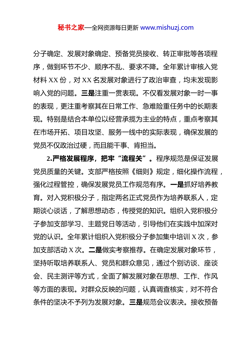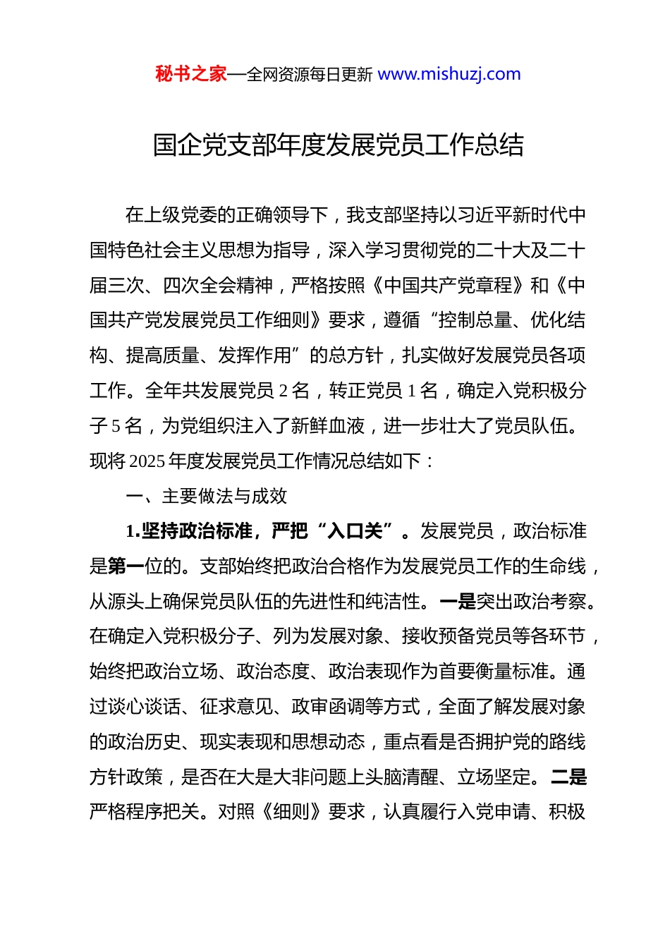 秘书之家—全网资源每日更新 www.mishuzj.com国企党支部年度发展党员工作总结 在上级党委的正确领导下,我支部坚持以习近平新时代中国特色社会主义思想为指导,深入学习贯彻党的二十大及二十届三次、四次全会精神,严格按照《中国共产党章程》和《中国共产党发展党员工作细则》要求,遵循“控制总量、优化结构、提高质量、发挥作用”的总方针,扎实做好发展党员各项工作。全年共发展党员 2 名,转正党员 1 名,确定入党积极分子 5 名,为党组织注入了新鲜血液,进一步壮大了党员队伍。现将 2025 年度发展党员工作情况总结如下:一、主要做法与成效1.坚持政治标准,严把“入口关”。发展党员,政治标准是第一位的。支部始终把政治合格作为发展党员工作的生命线,从源头上确保党员队伍的先进性和纯洁性。一是突出政治考察。在确定入党积极分子、列为发展对象、接收预备党员等各环节,始终把政治立场、政治态度、政治表现作为首要衡量标准。通过谈心谈话、征求意见、政审函调等方式,全面了解发展对象的政治历史、现实表现和思想动态,重点看是否拥护党的路线方针政策,是否在大是大非问题上头脑清醒、立场坚定。二是严格程序把关。对照《细则》要求,认真履行入党申请、积极秘书之家—全网资源每日更新 www.mishuzj.com分子确定、发展对象确定、预备党员接收、转正审批等各项程序,做到环节不少、顺序不乱、要求不降。全年累计审核入党材料 XX 份,对 XX 名发展对象进行了政治审查,均未发现影响入党的问题。三是注重一贯表现。不仅看发展对象一时一事的表现,更注重考察其在日常工作、急难险重任务中的长期表现。特别是结合本单位以经营承揽为主业的特点,重点考察其在市场开拓、项目攻坚、服务一线中的实际表现,确保发展的党员不仅政治过硬,而且能干事、肯担当。2.严格发展程序,把牢“流程关”。程序规范是保证发展党员质量的关键。支部严格按照《细则》规定,细化操作流程,强化过程管控,确保发展党员工作规范有序。一是抓好培养教育。对入党积极分子,指定两名正式党员作为培养联系人,定期谈心谈话,了解思想动态,传授党的知识。组织入党积极分子参加支部学习、主题党日等活动,引导他们在实践中加深对党的认识。全年累计组织入党积极分子参加集中培训 X 次,参加支部活动 X 次。二是做实考察推荐。在确定发展对象环节,坚持听取培养联系人、党员和群众意见,通过个别访谈、座谈会、民主测评等方式,全面了解发展对象在思想、工作、作风等方面的表现。对群众反映的问题,认真调查核实,对不符合条件的坚决不予列为发展对象。三是规范会议表决。接收预备秘书之家—全网资源每日更新 www.mishuzj.com党员和预备党员转正,均严格按照规定召开支部党员大会,申请人汇报思想,介绍人介绍情况,与会党员充分讨论,最后进行无记名投票表决。全年召开相关支部党员大会 X 次,程序规范、记录完整。四是严格公示监督。在确定入党积极分子、发展对象和预备党员转正等关键环节,均按规定进行公示,接受党员群众监督。公示期间未收到不良反映。3.强化培养锻炼,把好“质量关”。质量是发展党员工作的核心。支部注重在培养教育上下功夫,在实践锻炼中促成长,帮助发展对象和预备党员尽快成熟。一是加强理论武装。组织发展对象和预备党员深入学习习近平新时代中国特色社会主义思想,学习党章党规,学习党的基本理论和基本知识。利用“三会一课”、主题党日、学习强国等载体,引导他们不断提高政治素养和理论水平。全年组织专题学习 X 次,发放学习资料 X 册。二是注重实践锻炼。结合本单位经营工作实际,有意识地将发展对象和预备党员放到经营一线、项目前沿去锻炼。去年,XX 名发展对象参与了重大项目的投标攻坚,XX 名预备党员在项目履约中承担了重要任务。通过压担子、交任务,让他们在实践中锤炼党性、增长才干。三是落实帮带责任。为每名发展对象和预备党员指定经验丰富、表现突出的正式党员作为培养联系人,定期谈心谈话,传授工作经验,帮助解决思想秘书之家—全网资源每日更新 www.mishuzj.com和工作中的困惑。全年培养联系人累计谈心谈话 X 人次...