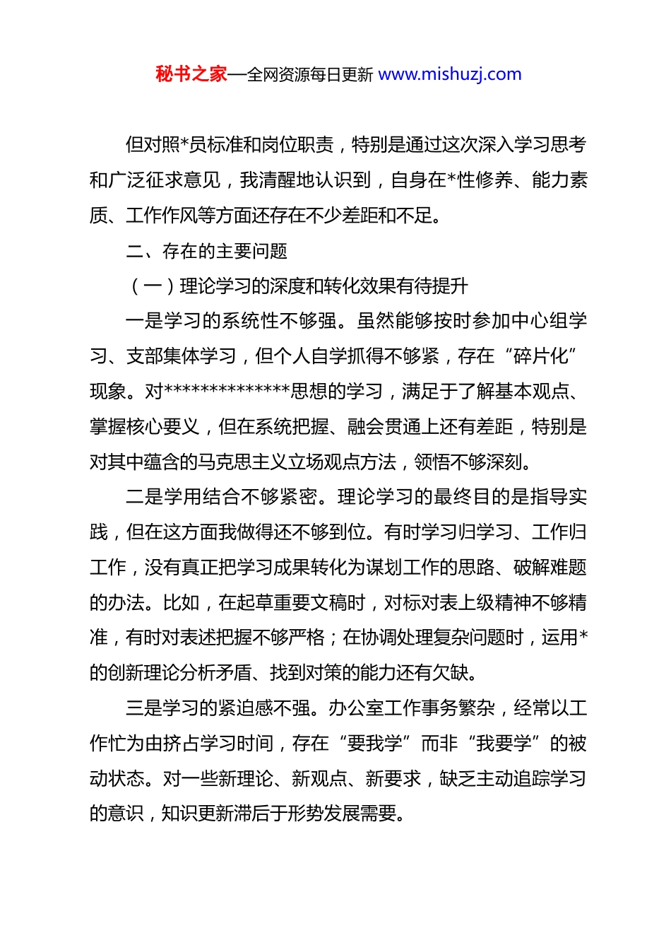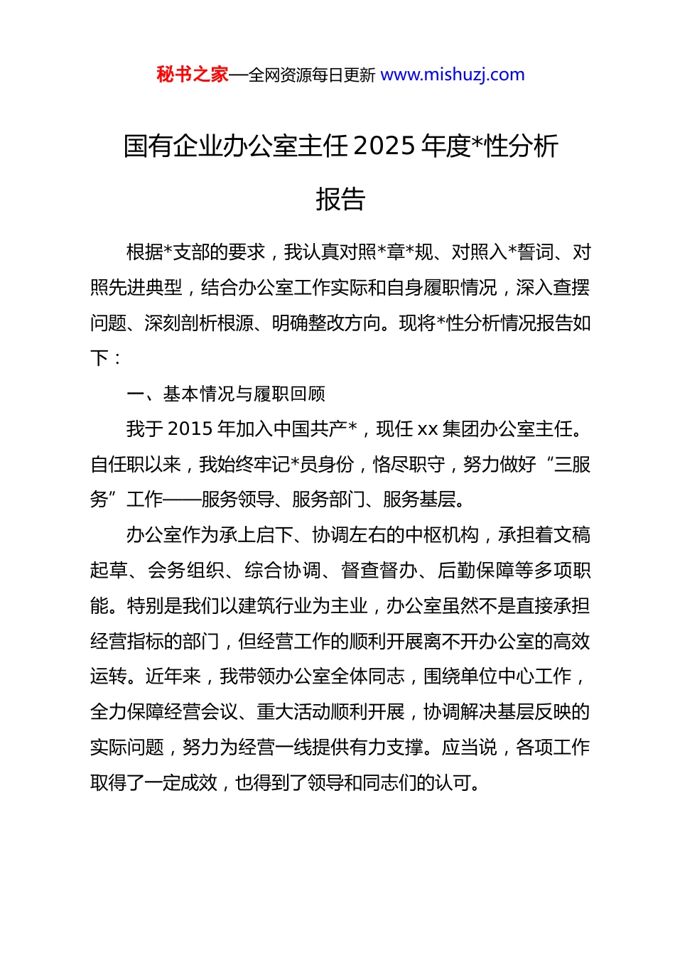 秘书之家—全网资源每日更新 www.mishuzj.com国有企业办公室主任 2025 年度*性分析报告根据*支部的要求,我认真对照*章*规、对照入*誓词、对照先进典型,结合办公室工作实际和自身履职情况,深入查摆问题、深刻剖析根源、明确整改方向。现将*性分析情况报告如下:一、基本情况与履职回顾我于 2015 年加入中国共产*,现任 xx 集团办公室主任。自任职以来,我始终牢记*员身份,恪尽职守,努力做好“三服务”工作——服务领导、服务部门、服务基层。办公室作为承上启下、协调左右的中枢机构,承担着文稿起草、会务组织、综合协调、督查督办、后勤保障等多项职能。特别是我们以建筑行业为主业,办公室虽然不是直接承担经营指标的部门,但经营工作的顺利开展离不开办公室的高效运转。近年来,我带领办公室全体同志,围绕单位中心工作,全力保障经营会议、重大活动顺利开展,协调解决基层反映的实际问题,努力为经营一线提供有力支撑。应当说,各项工作取得了一定成效,也得到了领导和同志们的认可。秘书之家—全网资源每日更新 www.mishuzj.com但对照*员标准和岗位职责,特别是通过这次深入学习思考和广泛征求意见,我清醒地认识到,自身在*性修养、能力素质、工作作风等方面还存在不少差距和不足。二、存在的主要问题(一)理论学习的深度和转化效果有待提升一是学习的系统性不够强。虽然能够按时参加中心组学习、支部集体学习,但个人自学抓得不够紧,存在“碎片化”现象。对**************思想的学习,满足于了解基本观点、掌握核心要义,但在系统把握、融会贯通上还有差距,特别是对其中蕴含的马克思主义立场观点方法,领悟不够深刻。二是学用结合不够紧密。理论学习的最终目的是指导实践,但在这方面我做得还不够到位。有时学习归学习、工作归工作,没有真正把学习成果转化为谋划工作的思路、破解难题的办法。比如,在起草重要文稿时,对标对表上级精神不够精准,有时对表述把握不够严格;在协调处理复杂问题时,运用*的创新理论分析矛盾、找到对策的能力还有欠缺。三是学习的紧迫感不强。办公室工作事务繁杂,经常以工作忙为由挤占学习时间,存在“要我学”而非“我要学”的被动状态。对一些新理论、新观点、新要求,缺乏主动追踪学习的意识,知识更新滞后于形势发展需要。秘书之家—全网资源每日更新 www.mishuzj.com(二)*性修养和宗旨意识有待加强一是*员身份意识有所淡化。随着工作年限增长,有时产生“老同志”心态,自我要求有所放松。参加组织生活满足于完成“规定动作”,批评与自我批评辣味不足,对自己要求不够严格,对同志碍于情面不愿“揭短”。先锋模范作用发挥不够充分,在日常工作中“带头干”的意识不够强。二是宗旨意识树得不够牢。办公室工作直接面对基层、面对职工,但我在服务群众方面还存在差距。有时坐在办公室时间多,深入基层调研少,对一线职工的所思所想、所急所盼掌握不够全面。在办理涉及职工切身利益的事项时,有时存在按章办事有余、换位思考不足的问题。比如,对基层反映的一些困难,虽然能按程序办理,但主动关心、靠前服务做得不够。三是群众工作方法不够灵活。在处理复杂矛盾和敏感问题时,有时方法简单、耐心不足,未能做到春风化雨、润物无声。对职工反映的问题,有时解释多、解决少,停留在“说了”层面,距离“办了”“办好”还有差距。(三)担当作为和攻坚劲头有所减弱一是攻坚克难的锐气不足。面对工作中的难点堵点,有时存在畏难情绪,缺乏“啃硬骨头”的决心和韧劲。特别是在协调跨部门、跨层级的事务时,遇到阻力有时选择回避,缺乏一秘书之家—全网资源每日更新 www.mishuzj.com抓到底的狠劲。对历史遗留问题和长期未解决的矛盾,有时存在“等靠要”思想,主动破局的意识不强。二是工作标准有时不够高。办公室工作头绪多、节奏快,有时为了赶进度,满足于“过得去”,在精益求精上做得不够。比如,文稿起草把关不够严,有时出现错漏字或表述不准确的问题;会议组织有时不够精细,细节考虑不够周全。这些问题反映出,对标一流、追求卓越的进取心有所弱化。三是创新意识有待提升。习惯于按老经验、老办法办事,在优化工作...
