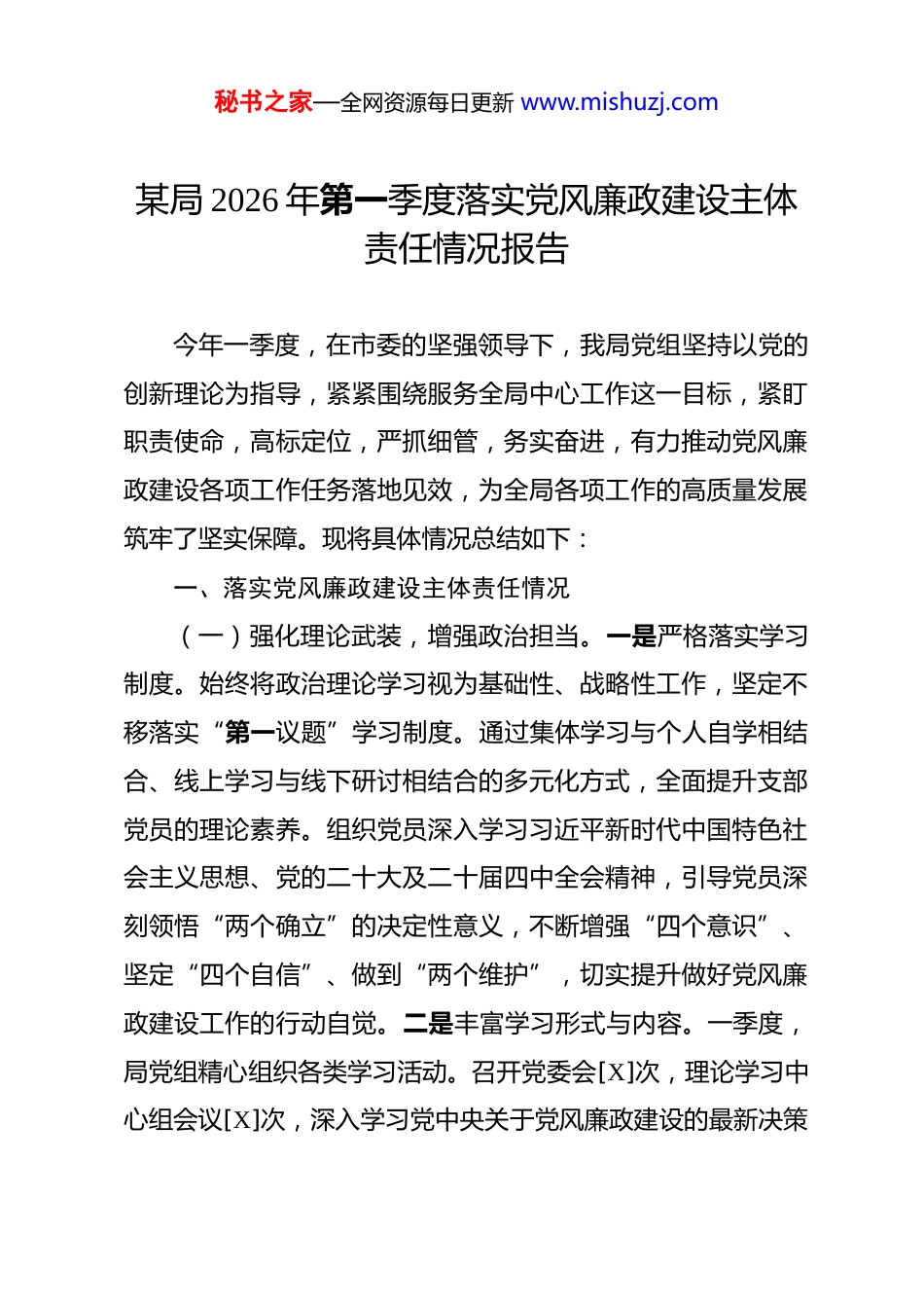 秘书之家—全网资源每日更新 www.mishuzj.com某局 2026 年第一季度落实党风廉政建设主体责任情况报告 今年一季度,在市委的坚强领导下,我局党组坚持以党的创新理论为指导,紧紧围绕服务全局中心工作这一目标,紧盯职责使命,高标定位,严抓细管,务实奋进,有力推动党风廉政建设各项工作任务落地见效,为全局各项工作的高质量发展筑牢了坚实保障。现将具体情况总结如下:一、落实党风廉政建设主体责任情况(一)强化理论武装,增强政治担当。一是严格落实学习制度。始终将政治理论学习视为基础性、战略性工作,坚定不移落实“第一议题”学习制度。通过集体学习与个人自学相结合、线上学习与线下研讨相结合的多元化方式,全面提升支部党员的理论素养。组织党员深入学习习近平新时代中国特色社会主义思想、党的二十大及二十届四中全会精神,引导党员深刻领悟“两个确立”的决定性意义,不断增强“四个意识”、坚定“四个自信”、做到“两个维护”,切实提升做好党风廉政建设工作的行动自觉。二是丰富学习形式与内容。一季度,局党组精心组织各类学习活动。召开党委会[X]次,理论学习中心组会议[X]次,深入学习党中央关于党风廉政建设的最新决策秘书之家—全网资源每日更新 www.mishuzj.com部署;开展理论研讨[X]次,围绕党风廉政建设热点问题进行深入交流;召开党员大会[X]次,传达上级指示精神,统一党员思想;开展主题党日活动[X]次,通过实地参观廉政教育基地、观看警示教育片等形式,增强学习的直观性和感染力;举办专题党课[X]次,邀请专家学者和领导干部授课,提升党员的理论水平和党性修养。(二)加强组织领导,夯实主体责任。一是健全责任体系。构建“一把手负总责,分管领导各负其责,班子成员齐抓共管”的工作机制,确保党风廉政建设主体责任落到实处。研究制定《2026 年党风廉政建设工作要点》,明确工作目标、任务和责任分工,为全年工作提供清晰的路线图。二是签订责任状。[具体日期],局党组与基层党组织负责人和各科室负责人签订《2026 年党风廉政建设责任书》,将重点任务和工作责任细化分解到每个单位和个人,形成一级抓一级、层层抓落实的工作格局。三是纳入考核体系。将党风廉政建设纳入全年工作考核的重要内容,与业务工作同部署、同落实、同检查、同考核。[具体日期],局党组听取各单位一季度党风廉政建设工作情况汇报,对工作进展进行全面评估,并对下一步工作进行详细部署,确保党风廉政建设工作不走过场、取得实效。(三)严格纪律执行,深化正风肃纪。一是严守纪律规矩。秘书之家—全网资源每日更新 www.mishuzj.com严格遵守党的政治纪律、政治规矩以及各项廉政法律法规,加强对权力运行的制约和监督。严格审批接待费用和报销流程,杜绝违规开支;积极落实精简会议活动和文件简报的要求,提高工作效率,降低行政成本。二是整治“四风”问题。持续开展“四风”问题专项整治,定期组织自查自纠和监督检查,坚决防止不正之风反弹回潮。建立健全长效管理机制,加强对重点领域和关键环节的监督,确保中央八项规定及其实施细则精神得到严格落实。三是支持纪检监察工作。大力支持纪检监察部门开展工作,定期开展检查督查,加强对各部门、单位及个人工作完成情况的跟踪督办。对发现的问题及时进行整改,对违规违纪行为严肃查处,形成强大的震慑力,推动党风廉政建设工作不断深入。二、存在问题一季度,我局党风廉政建设工作虽然取得了一定成绩,但仍存在一些不足之处,主要表现在以下几个方面:(一)政治理论学习深度不足。一是学习落实监督不到位。对各支部集体学习的落实情况缺乏具体有效的监督措施,导致部分支部学习存在形式主义,学习效果不佳。二是学用结合不够紧密。部分党员干部在学习过程中,未能将理论知识与实际工作相结合,存在学用脱节的现象,无法将学习成果转化为实秘书之家—全网资源每日更新 www.mishuzj.com际工作中的行动指南。(二)廉政建设教育效果不佳。一是教育方式单一。廉政教育主要以传统的集中学习、观看警示教育片等方式为主,缺乏创新和吸引力,难以激发党员干部的学习兴趣和积极性。二是教育与业务融合不够。存在就教育...
